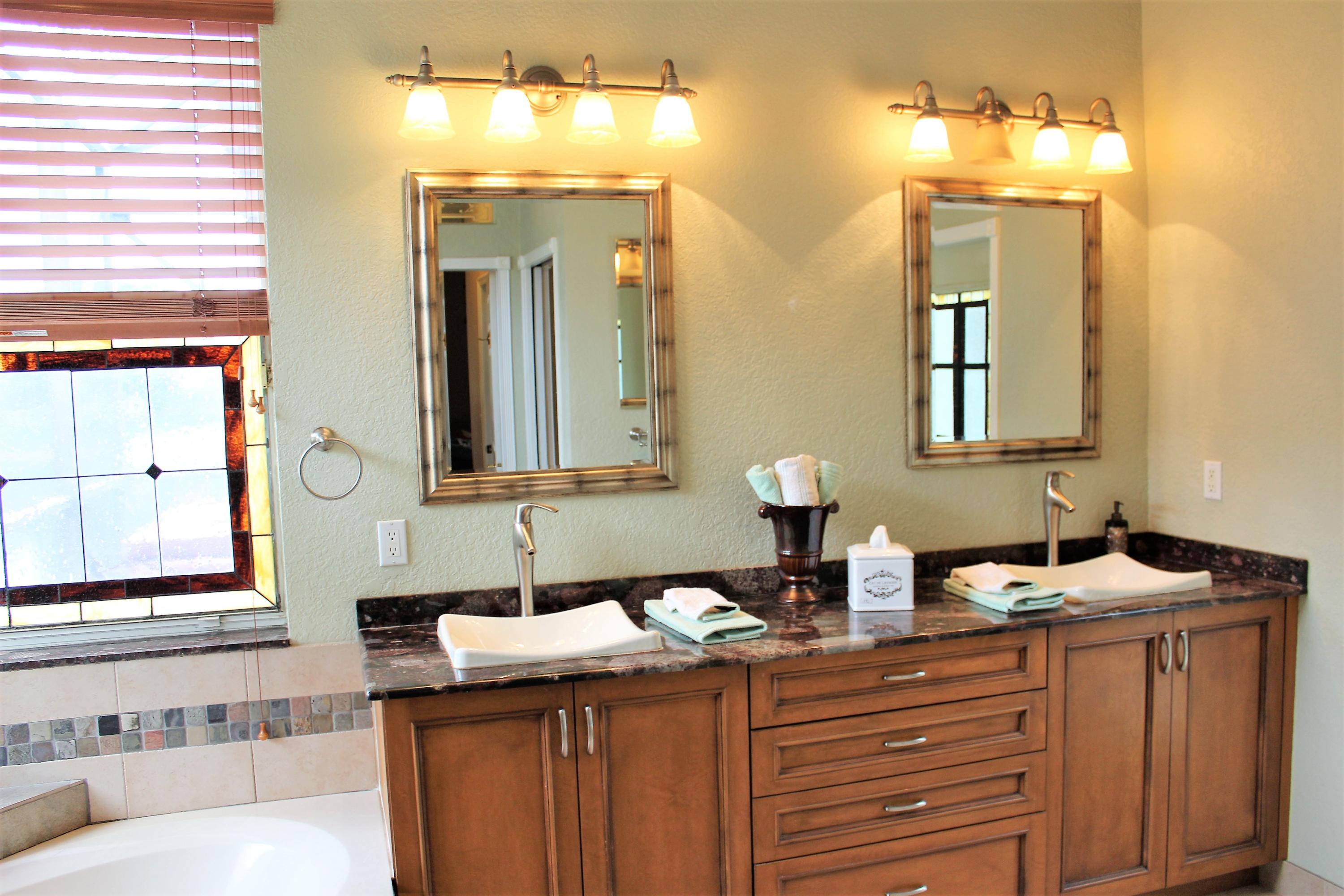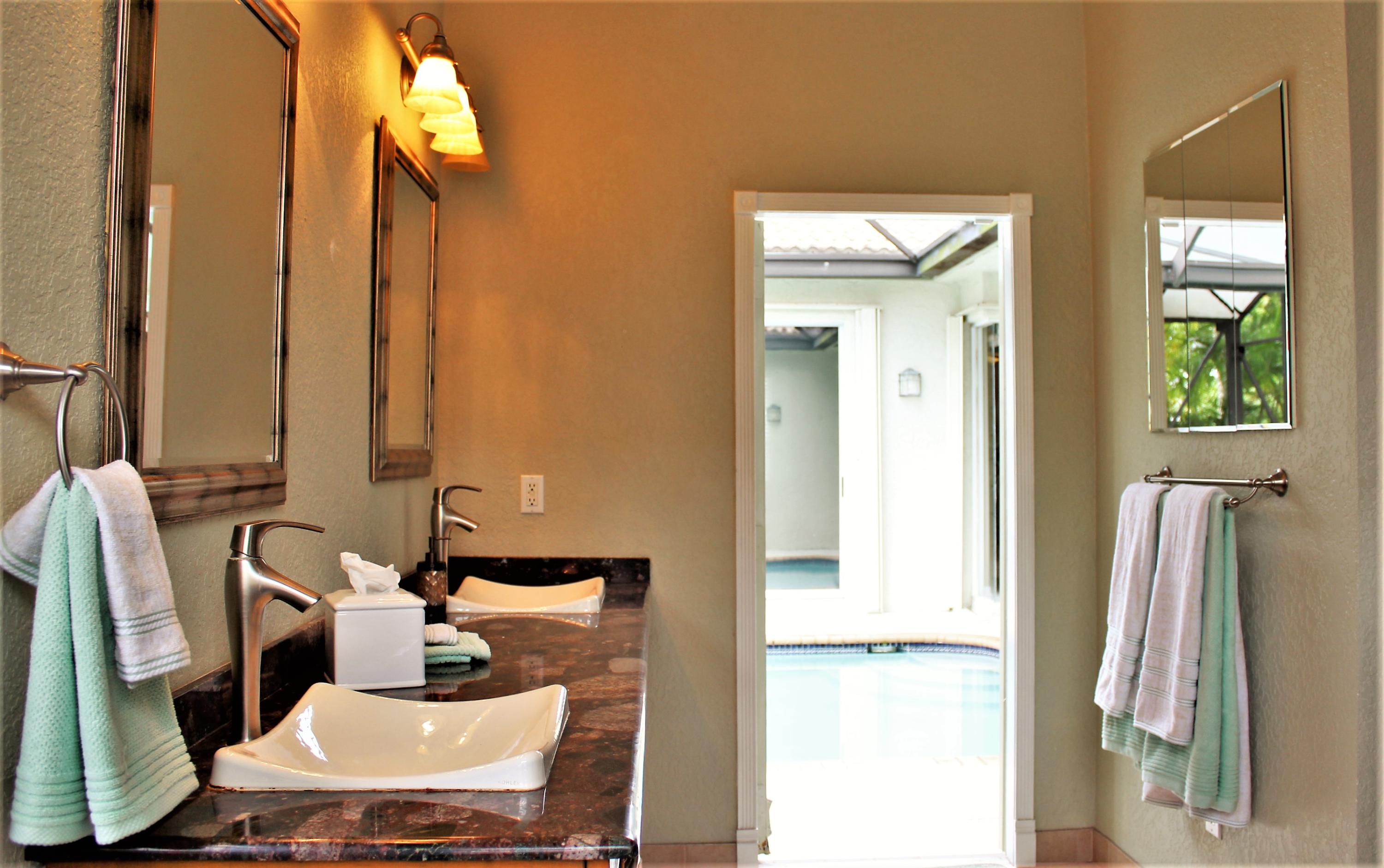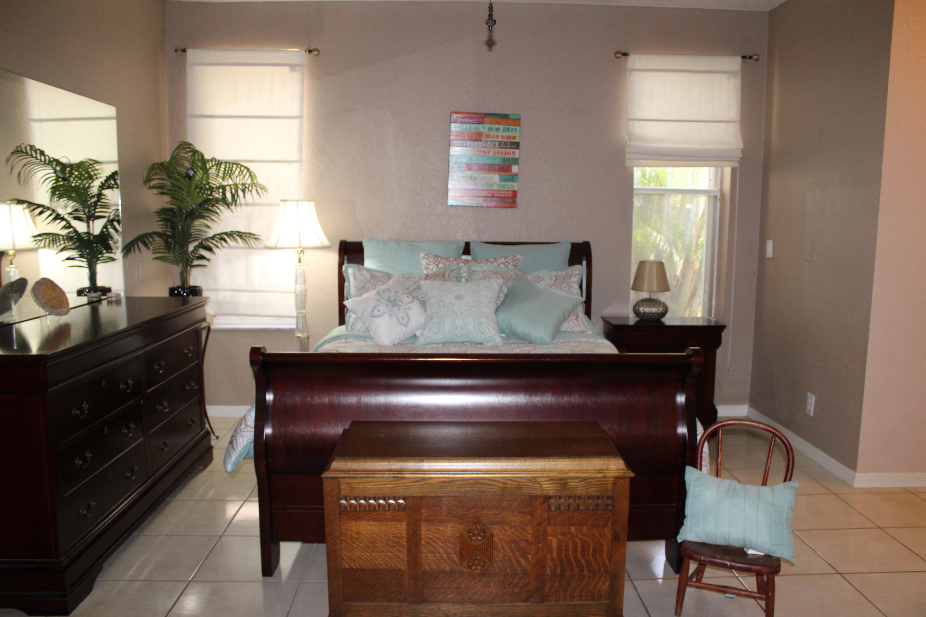 Stylish & spacious Boca Winds home, on de sac in great neighborhood! Remodled kitchen has custom 42'' tall cabinets with plantation shutters. Convenient split floor plan , with rarely found 5 bedrooms, all one level ang airy high ceilings. Master & living rooms beautifully accented with tray ceilings details with crown molding. Tile throughout, bathrooms updated have granite counter tops, full size laundry room with bonus utility sink. 5th bedroom has separarate entrance and driveway, perfect for guests or mother in law suite. Enjoy beautiful lake views , entertaining by the pool , relaxing in the jacuzzi. Located in west Boca community , near shopping & dining, excellent parks, and A+ schools.