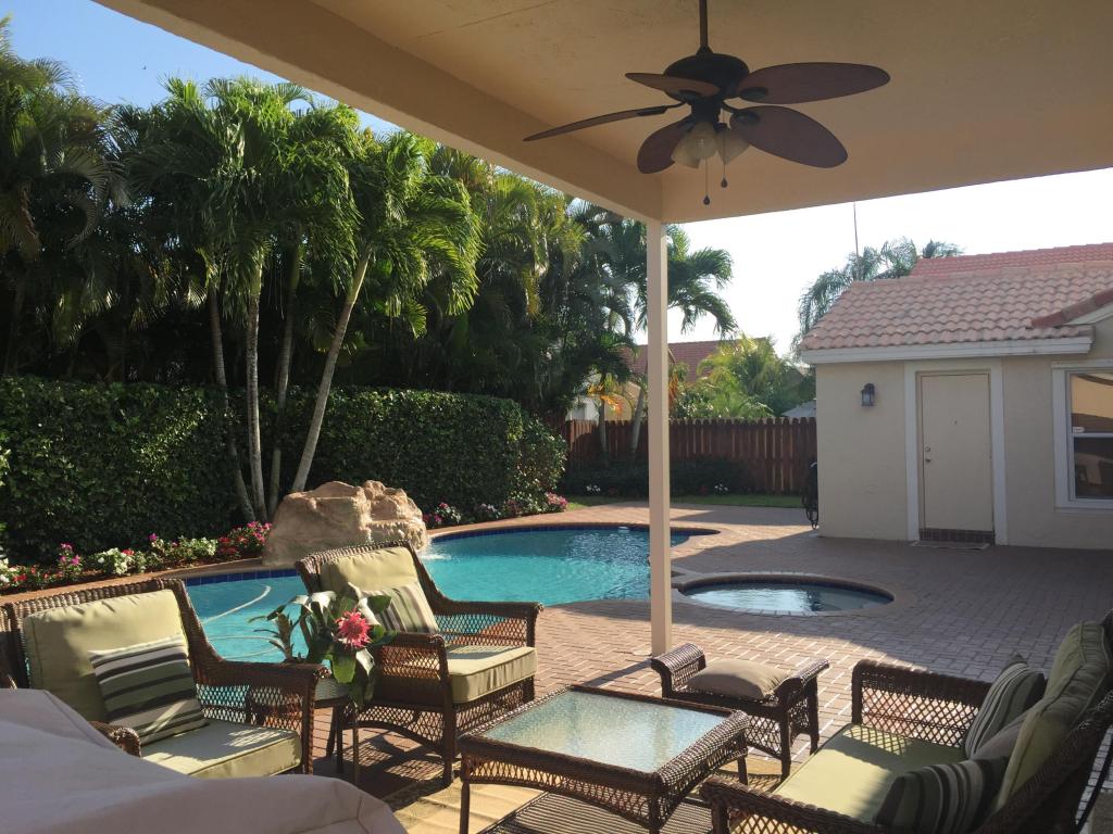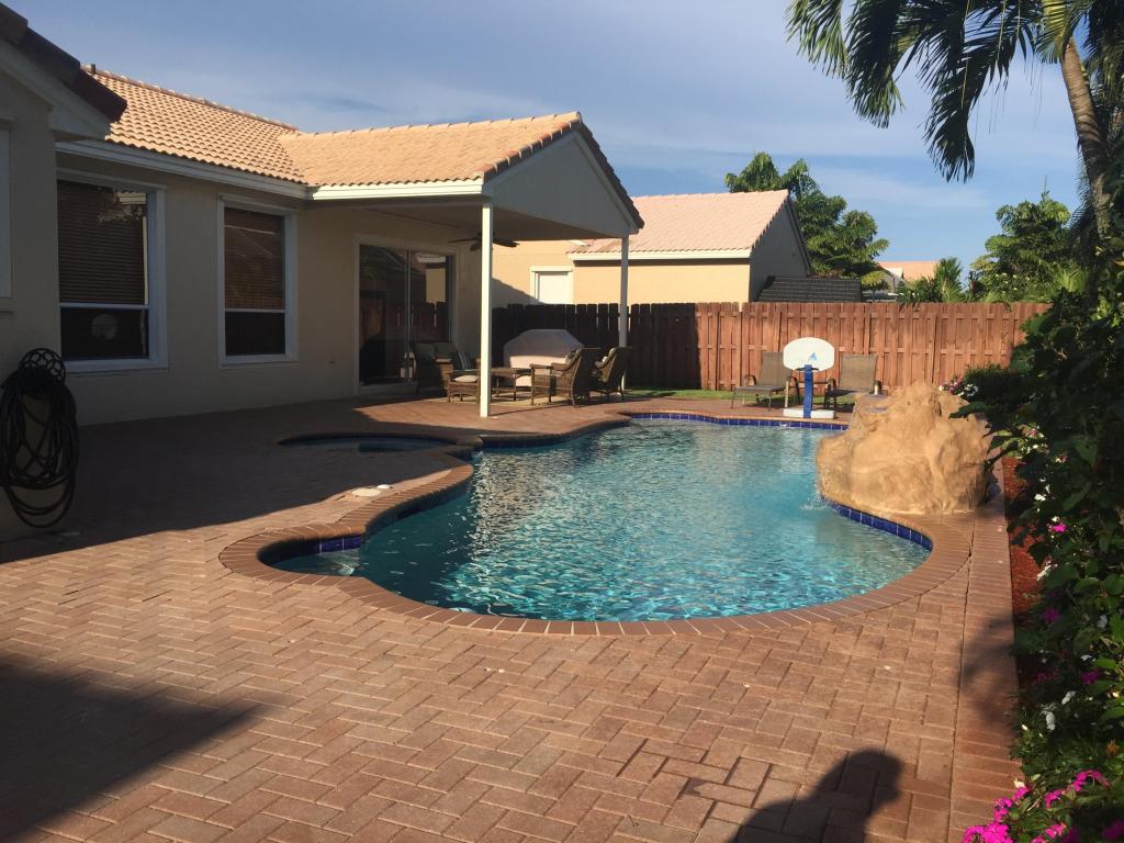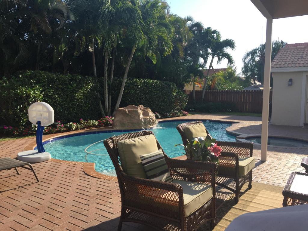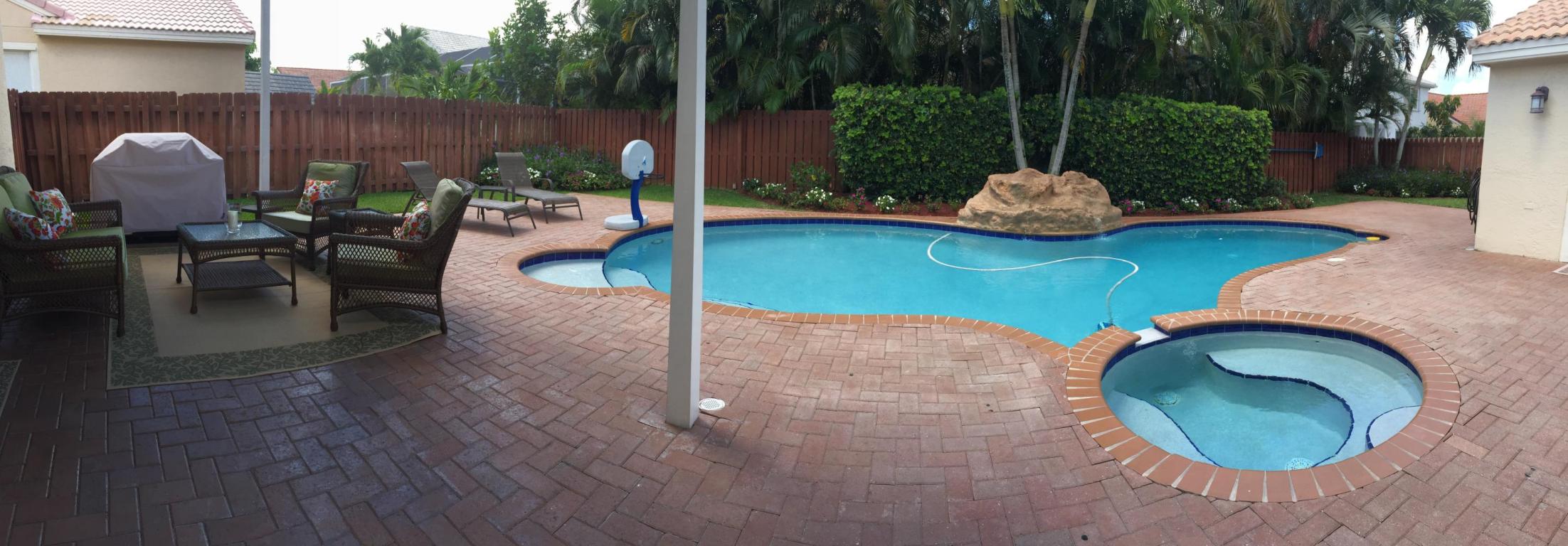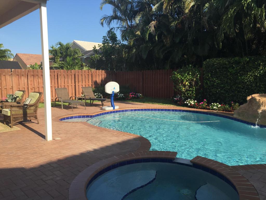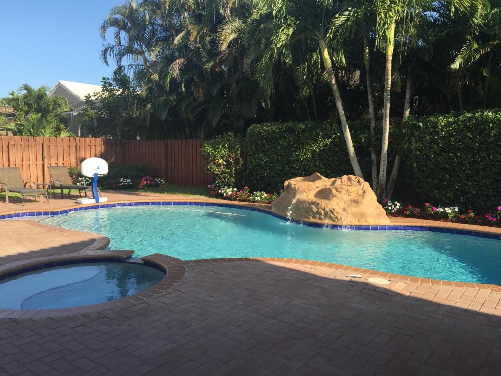 Beautifully renovated and lovingly maintained 4 bedroom single story pool home situated on a private interior lot. New kitchen cabinets with granite counters, new stainless steel appliances & wine cooler, new a/c 2015, open layout with soaring ceilings and huge windows with picturesque views of the tropical oasis backyard featuring the newly resurface heated pool & spa & waterfall. Be sure to check out the Olympic sized community pool, tennis & basketball courts, jogging paths, picnic area & tot lot included in the low monthly maintenance.