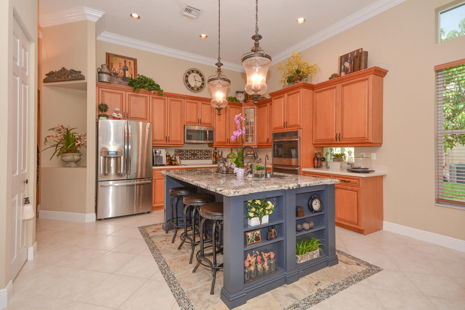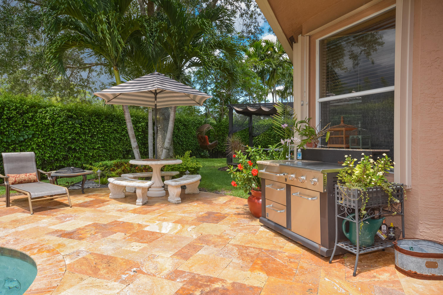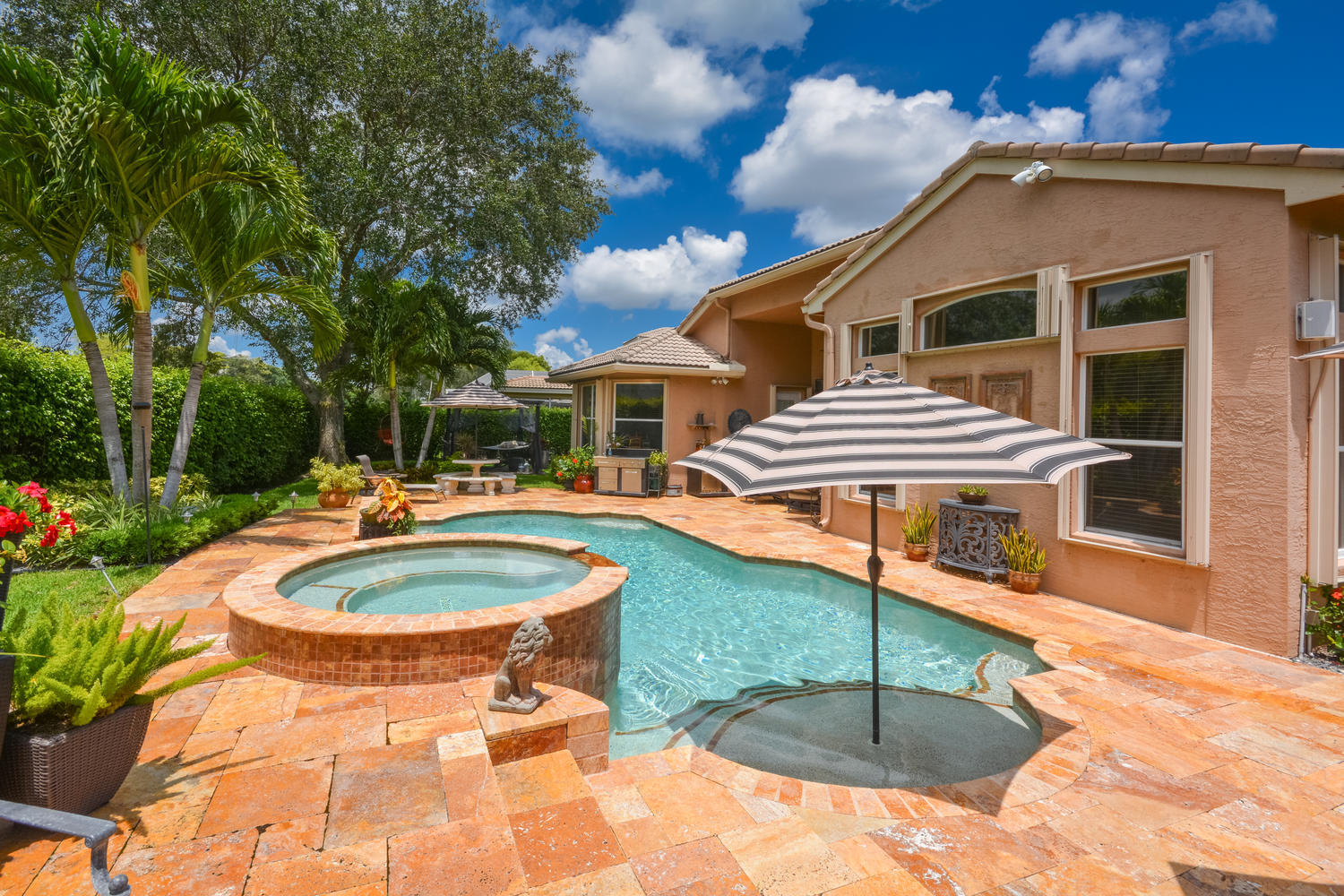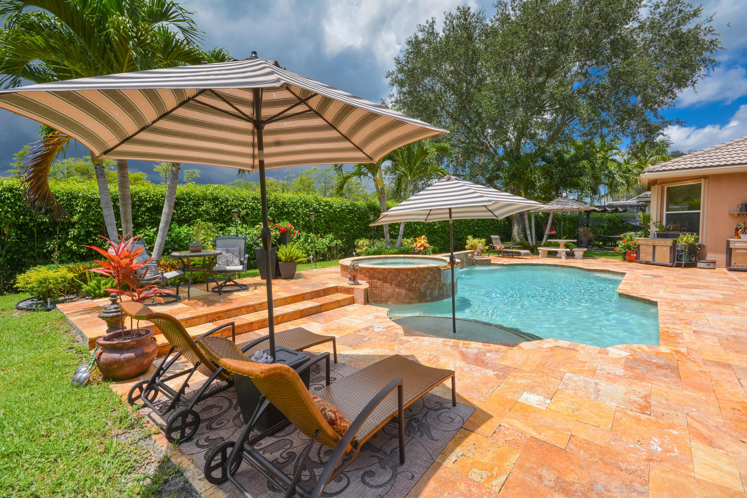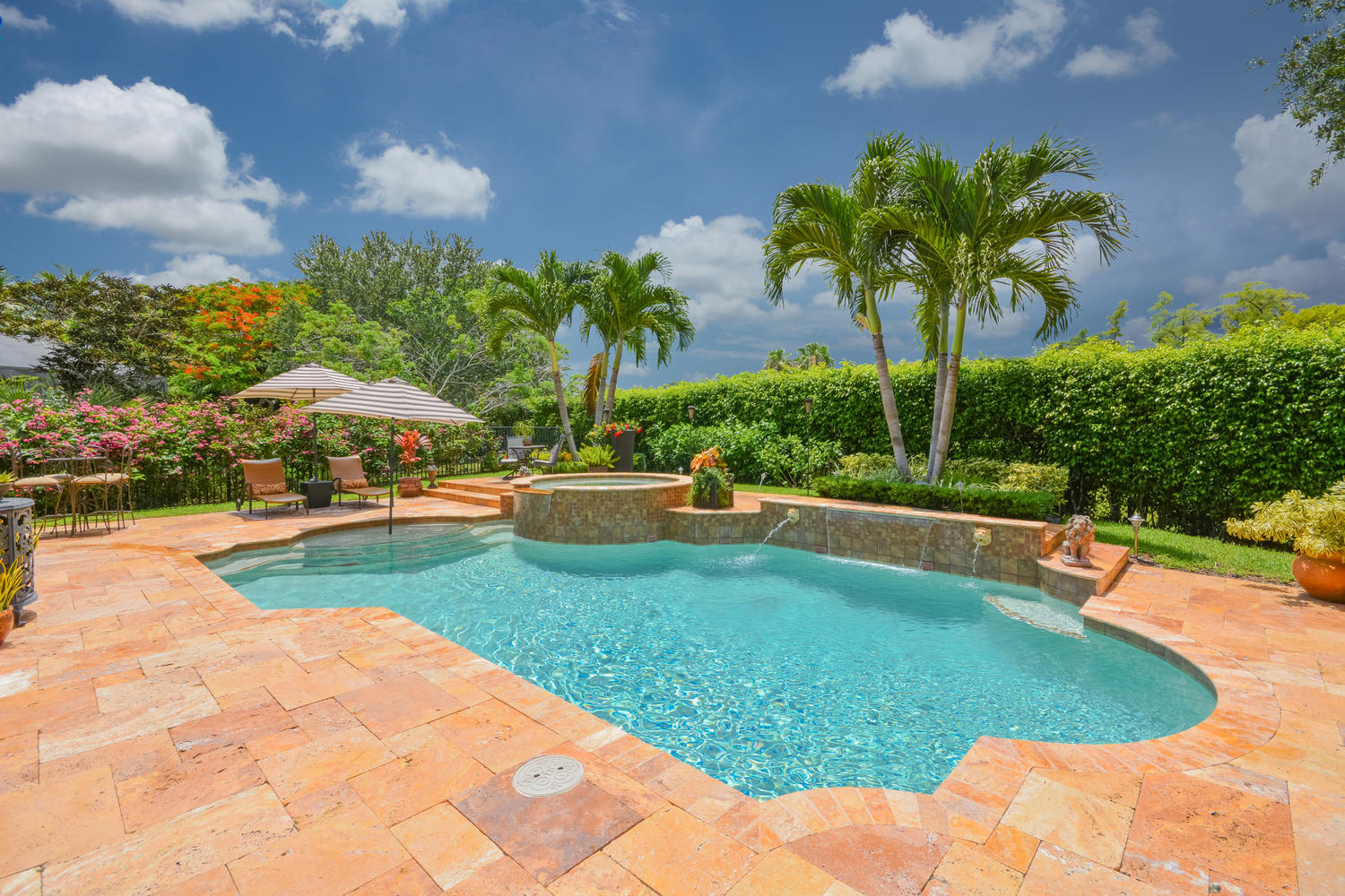 Beautifully appointed 4 bedroom 3 bath one-story home on south backing oversized private lot with trees beyond.Features include accordion hurricane shutters,tile on diagonal,tile design in gallery,crown moldings,'wood' floors in all bedrooms,French doors,custom window treatments,outfitted closets.The gourmet kitchen features glazed wood cabinetry with bump out at double oven,1 year new GE profile stainless steel appliances,Jenn-Air cooktop,center island,desk area,snackbar and separate breakfast nook with rounded seamless window.The family room is open to the kitchen.The master suite features outfitted walk-in closets,a luxurious master bath and French doors to the covered patio.The backyard 'resort' has an oversized marble patio,heated saltwater pool and spa with waterfall and pergola.