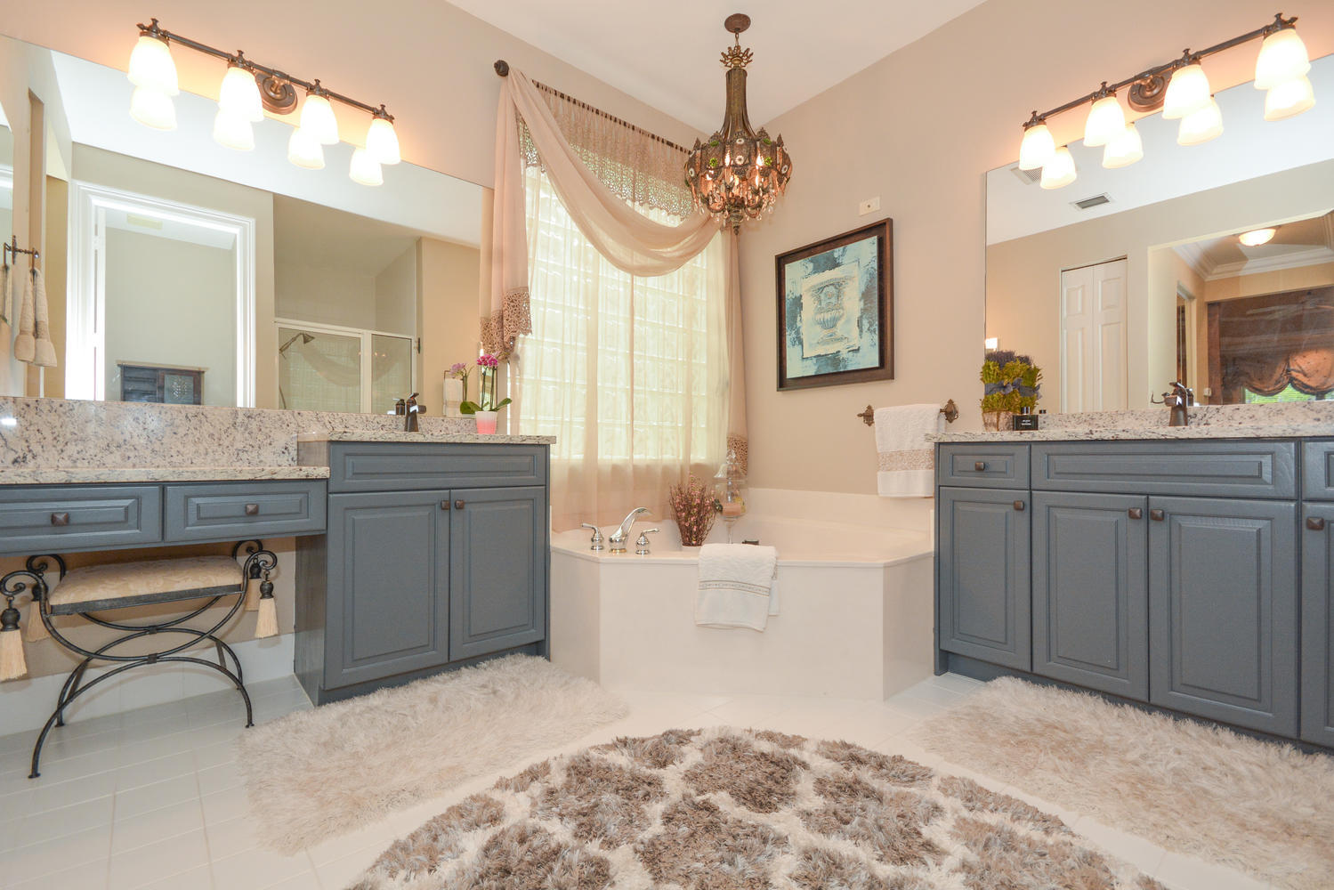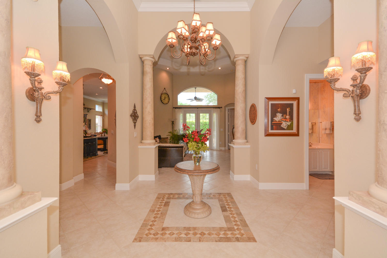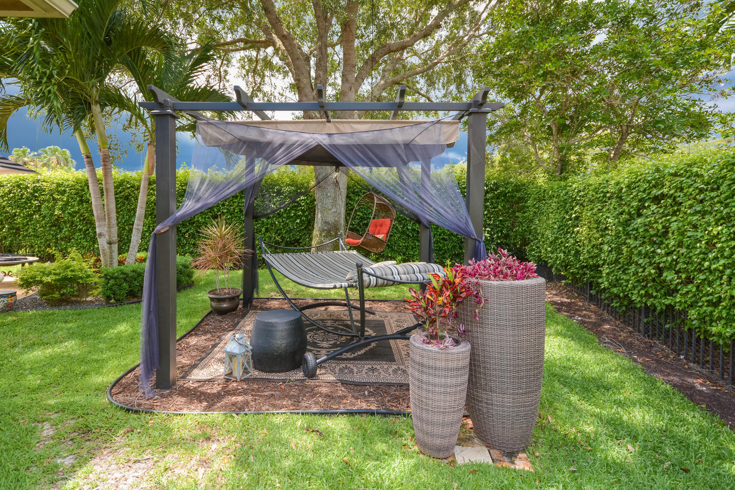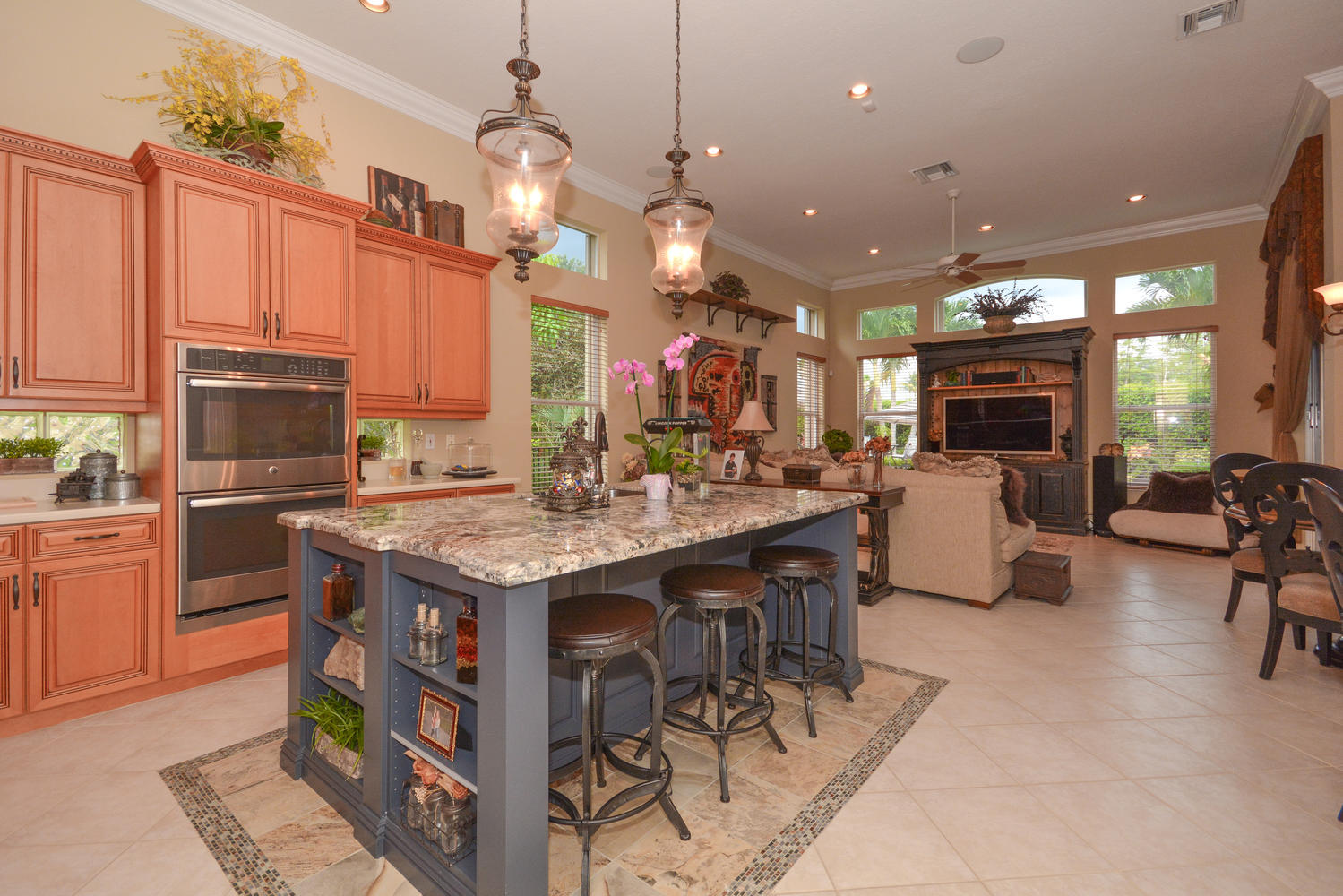 Beautifully appointed 4 bedroom 3 bath one-story home on south backing oversized private lot with trees beyond.Features include accordion hurricane shutters,tile on diagonal,tile design in gallery,crown moldings,'wood' floors in all bedrooms,French doors,custom window treatments,outfitted closets.The gourmet kitchen features glazed wood cabinetry with bump out at double oven,1 year new GE profile stainless steel appliances,Jenn-Air cooktop,center island,desk area,snackbar and separate breakfast nook with rounded seamless window.The family room is open to the kitchen.The master suite features outfitted walk-in closets,a luxurious master bath and French doors to the covered patio.The backyard 'resort' has an oversized marble patio,heated saltwater pool and spa with waterfall and pergola.
