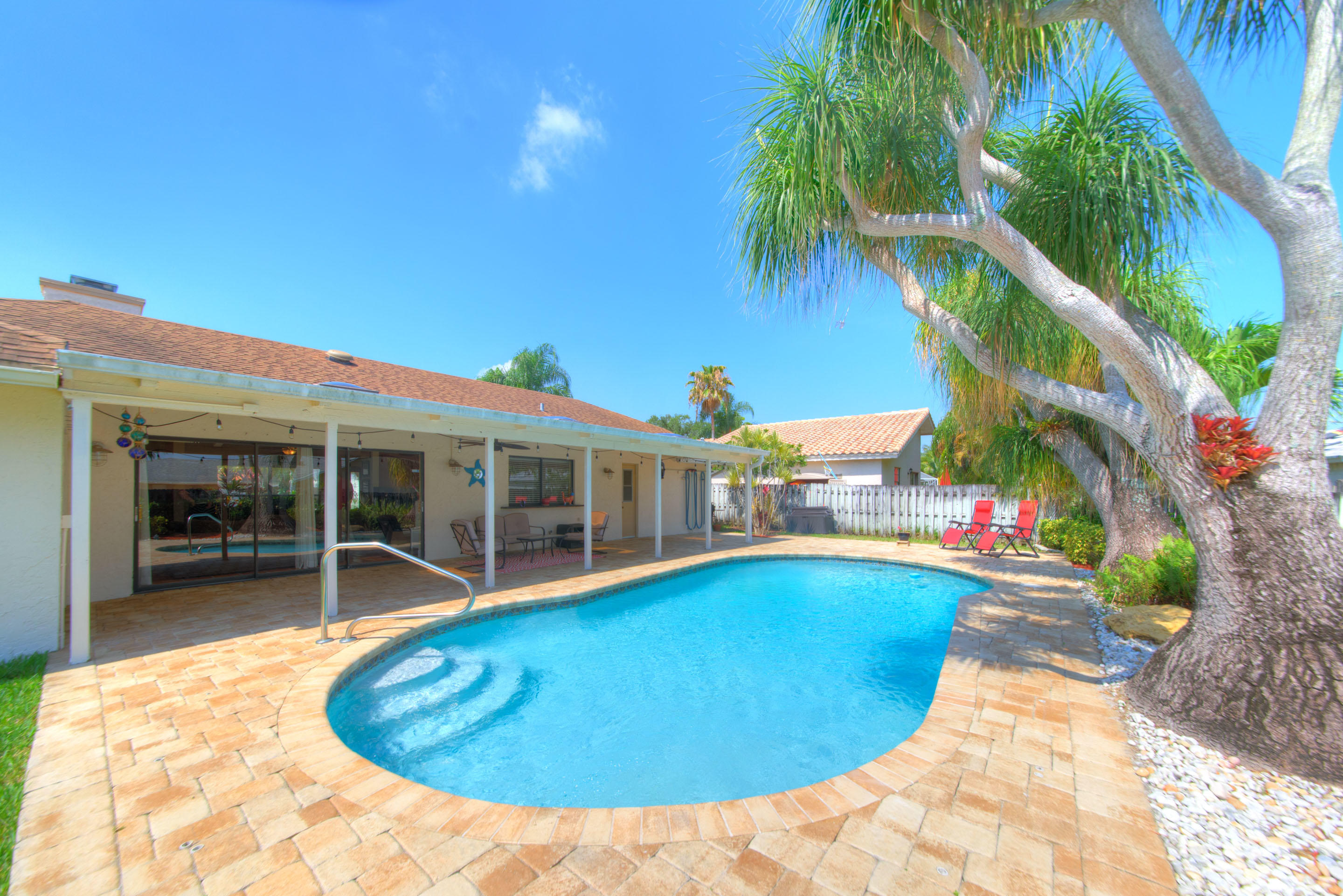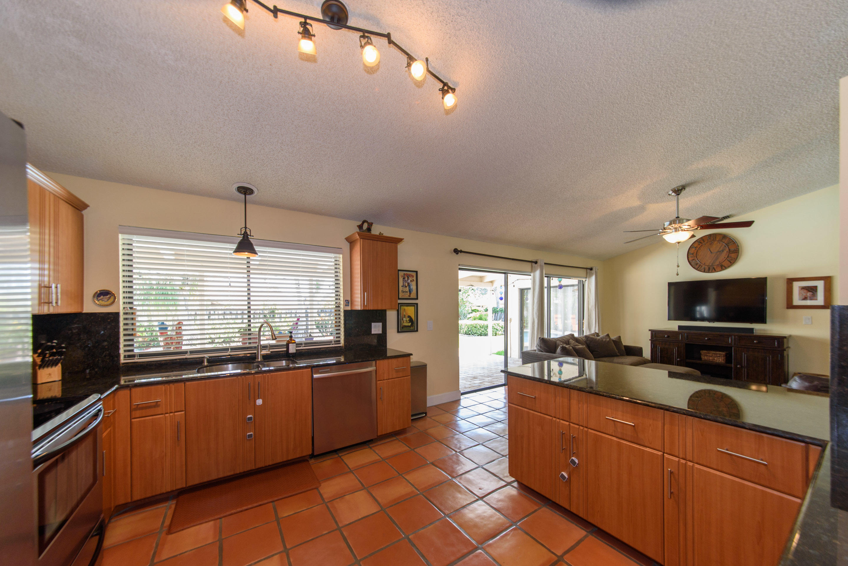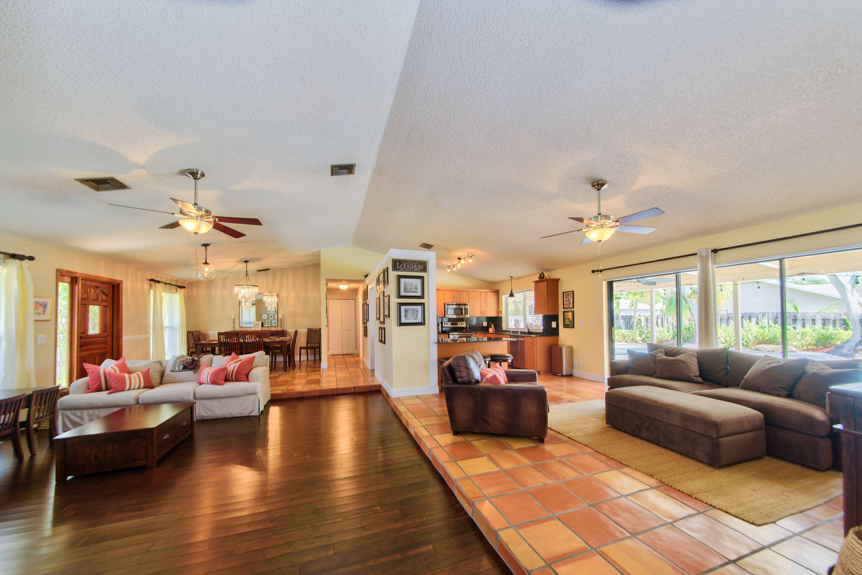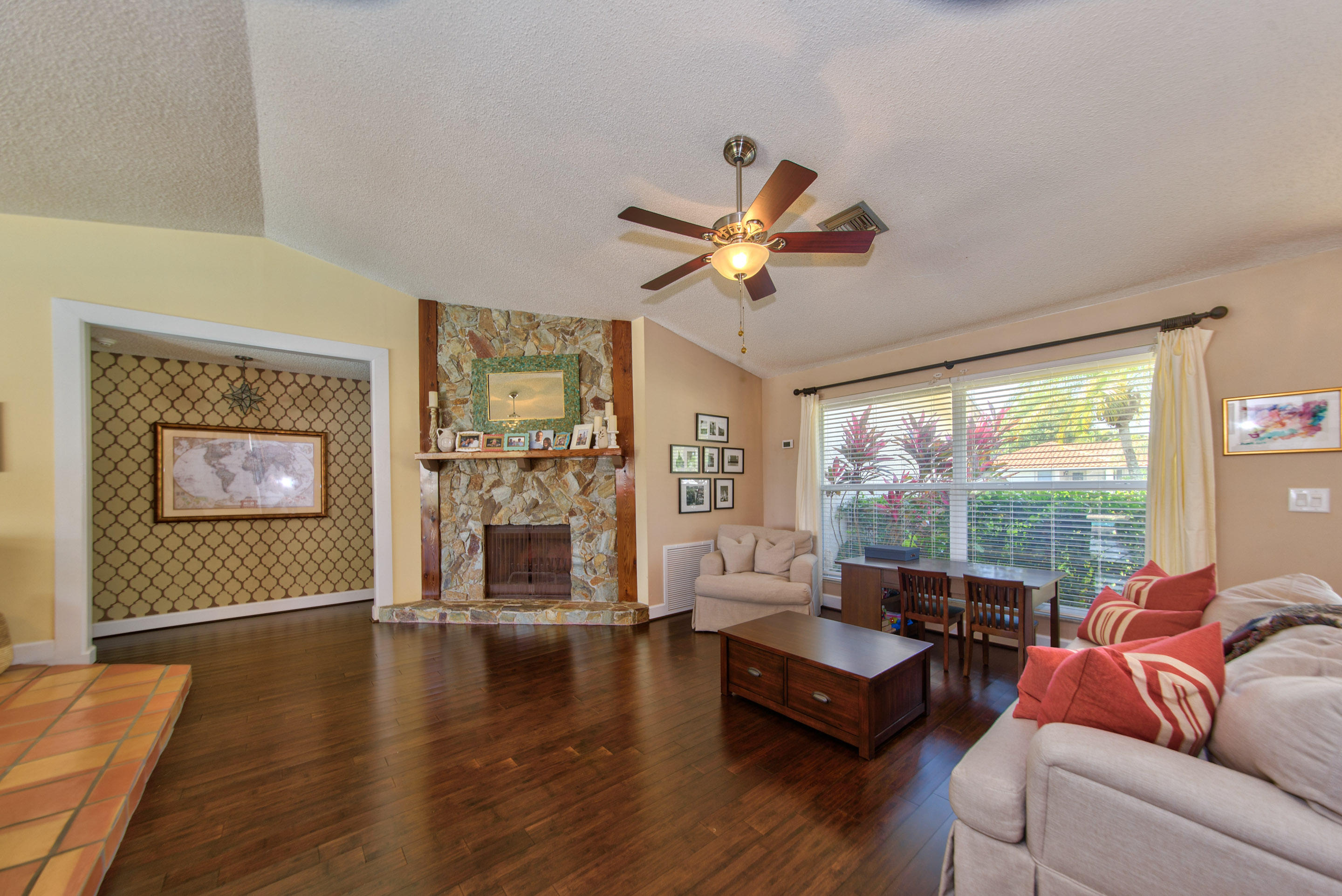 Fully renovated 3/2 pool home in the Cimarron section of Loggers' Run. Open concept floor plan with vaulted ceilings, Mexican Saltillo tile, wood flooring, and no carpet! Kitchen features granite counters with stainless steel appliances, counter seating, and pass through window to pool deck. Huge master bedroom with walk-in closet, and his and her vanities. Travertine tile in the guest bathroom with cabana door. Oversized two car garage with work bench and pull down attic stairs for plenty of attic storage. House protected with impact rated windows, impact rated garage door, and hard wired alarm system. New interior doors with antique glass hardware. Dining area could be converted to fourth bedroom or office as needed. Large wood-burning fireplace and mantel.