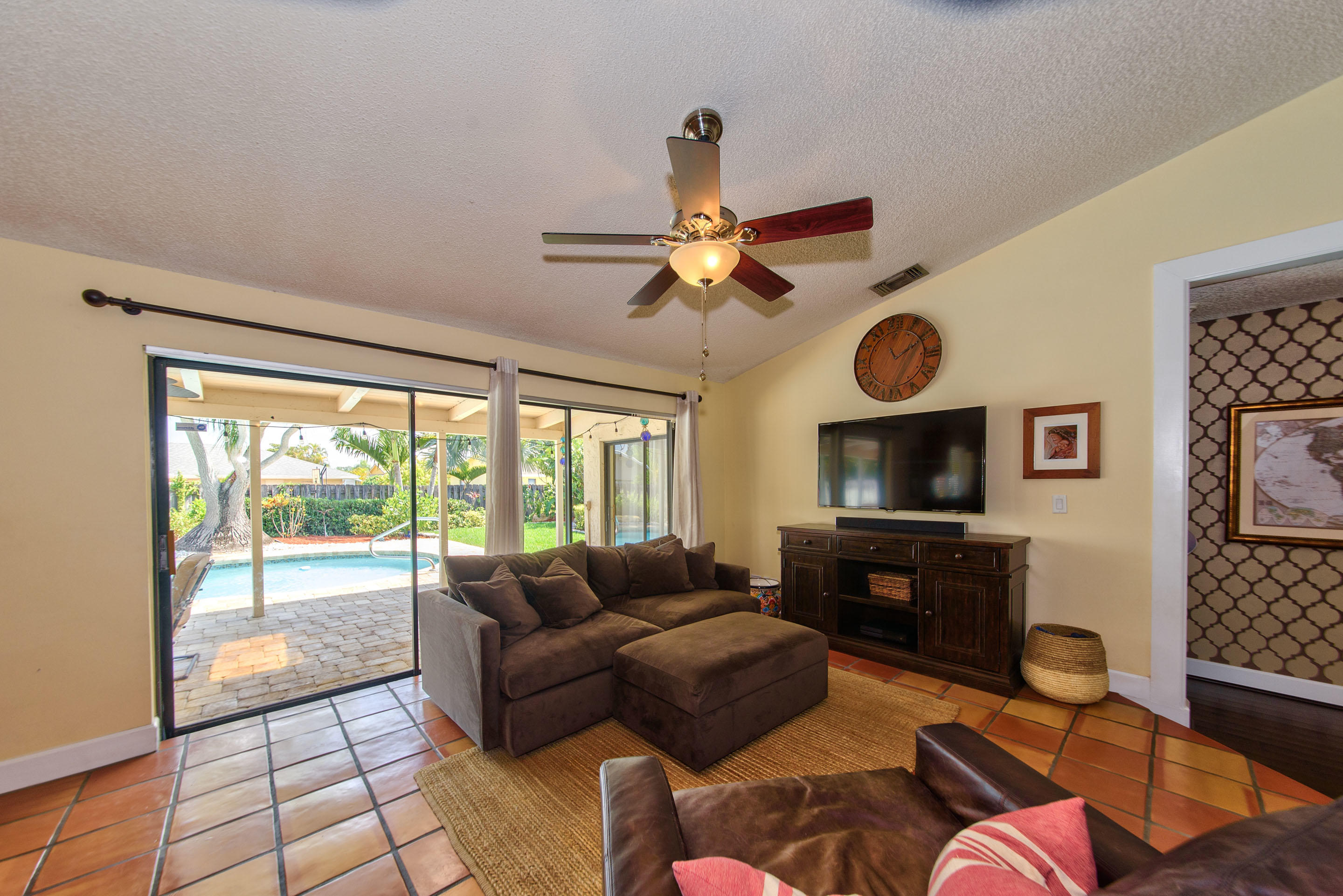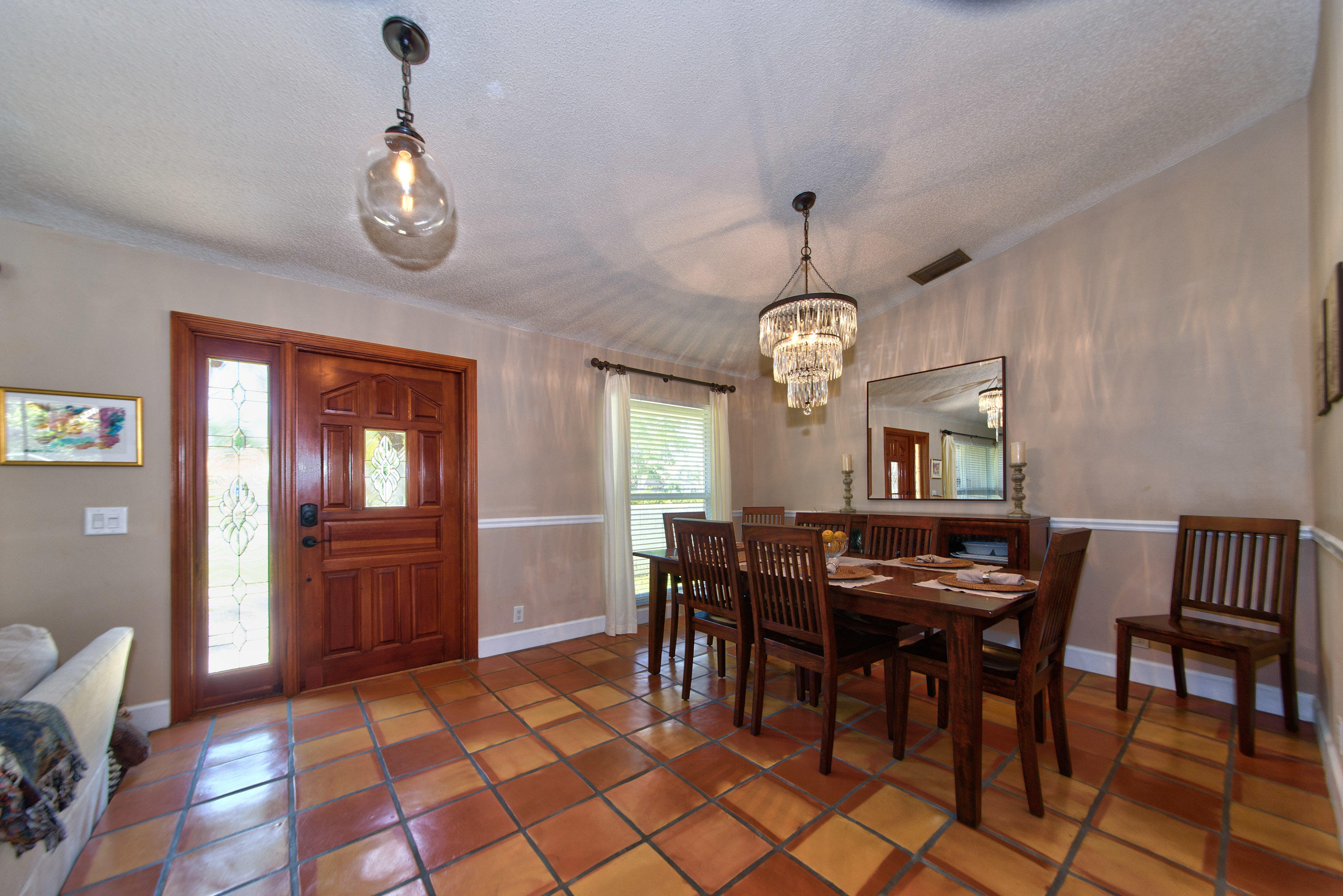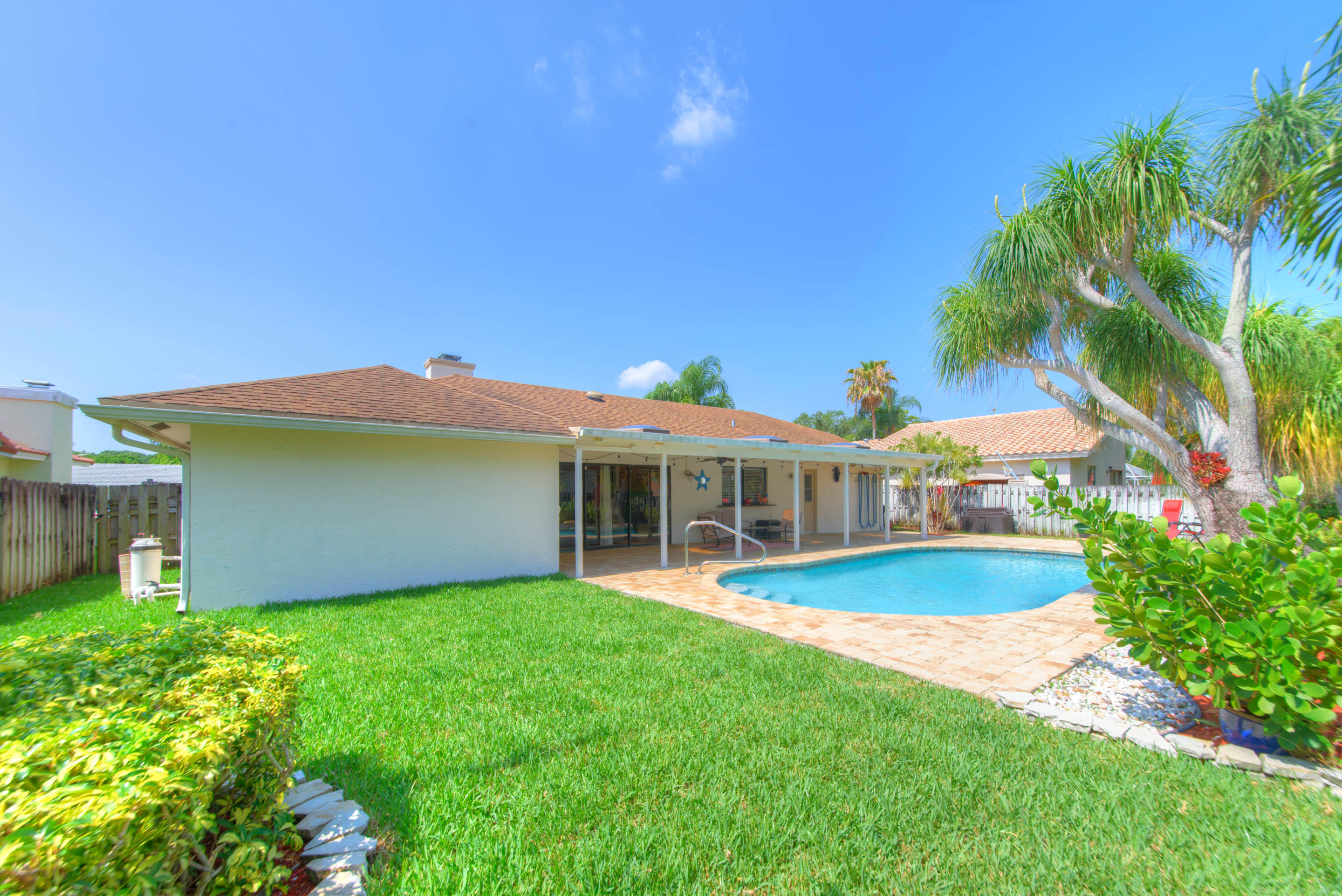 Fully renovated 3/2 pool home in the Cimarron section of Loggers' Run. Open concept floor plan with vaulted ceilings, Mexican Saltillo tile, wood flooring, and no carpet! Kitchen features granite counters with stainless steel appliances, counter seating, and pass through window to pool deck. Huge master bedroom with walk-in closet, and his and her vanities. Travertine tile in the guest bathroom with cabana door. Oversized two car garage with work bench and pull down attic stairs for plenty of attic storage. House protected with impact rated windows, impact rated garage door, and hard wired alarm system. New interior doors with antique glass hardware. Dining area could be converted to fourth bedroom or office as needed. Large wood-burning fireplace and mantel.