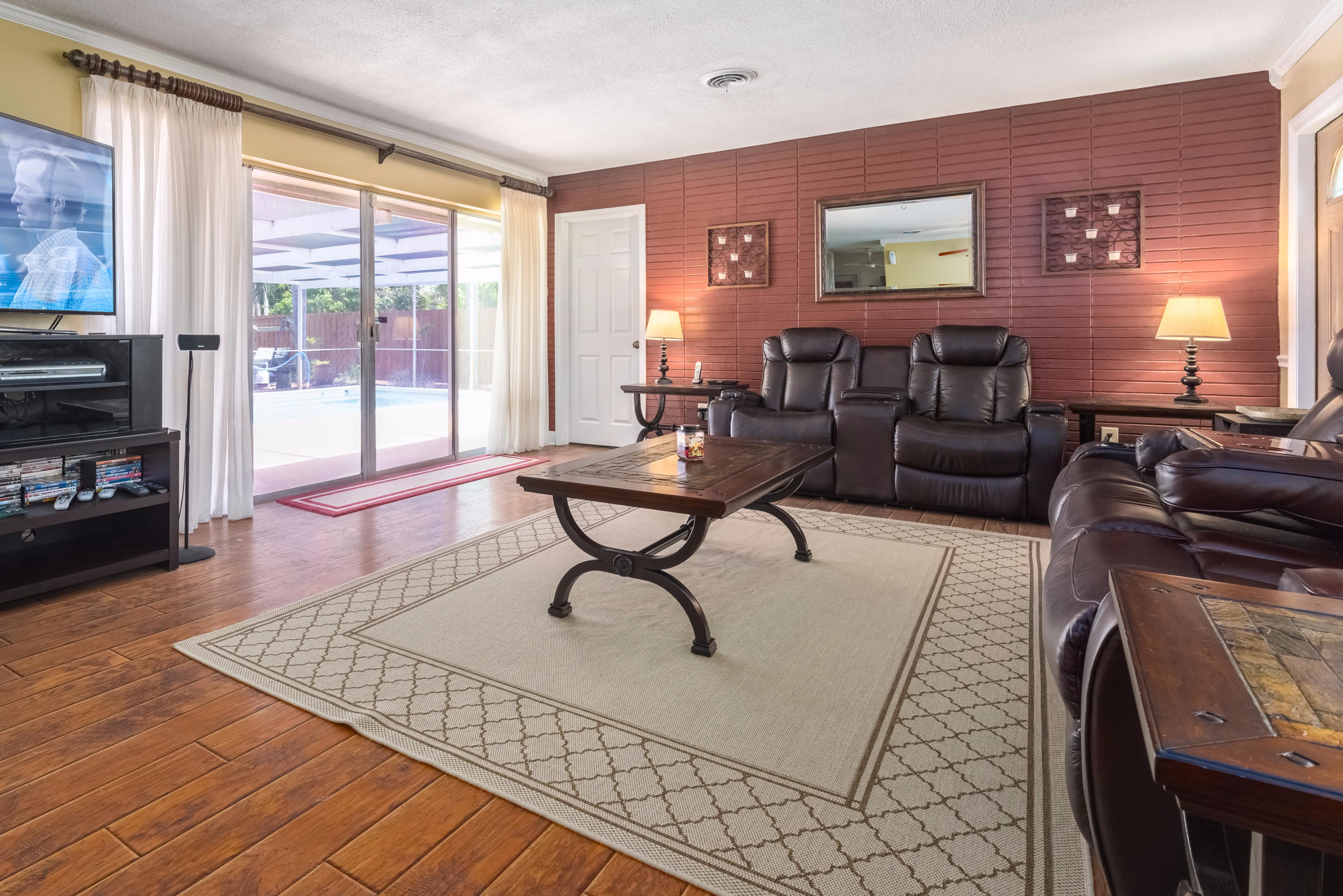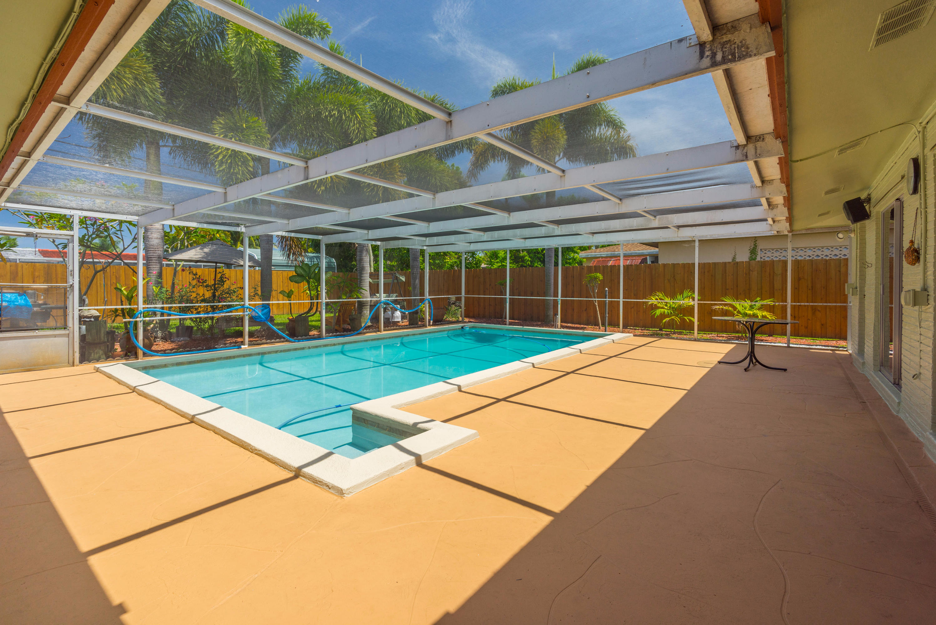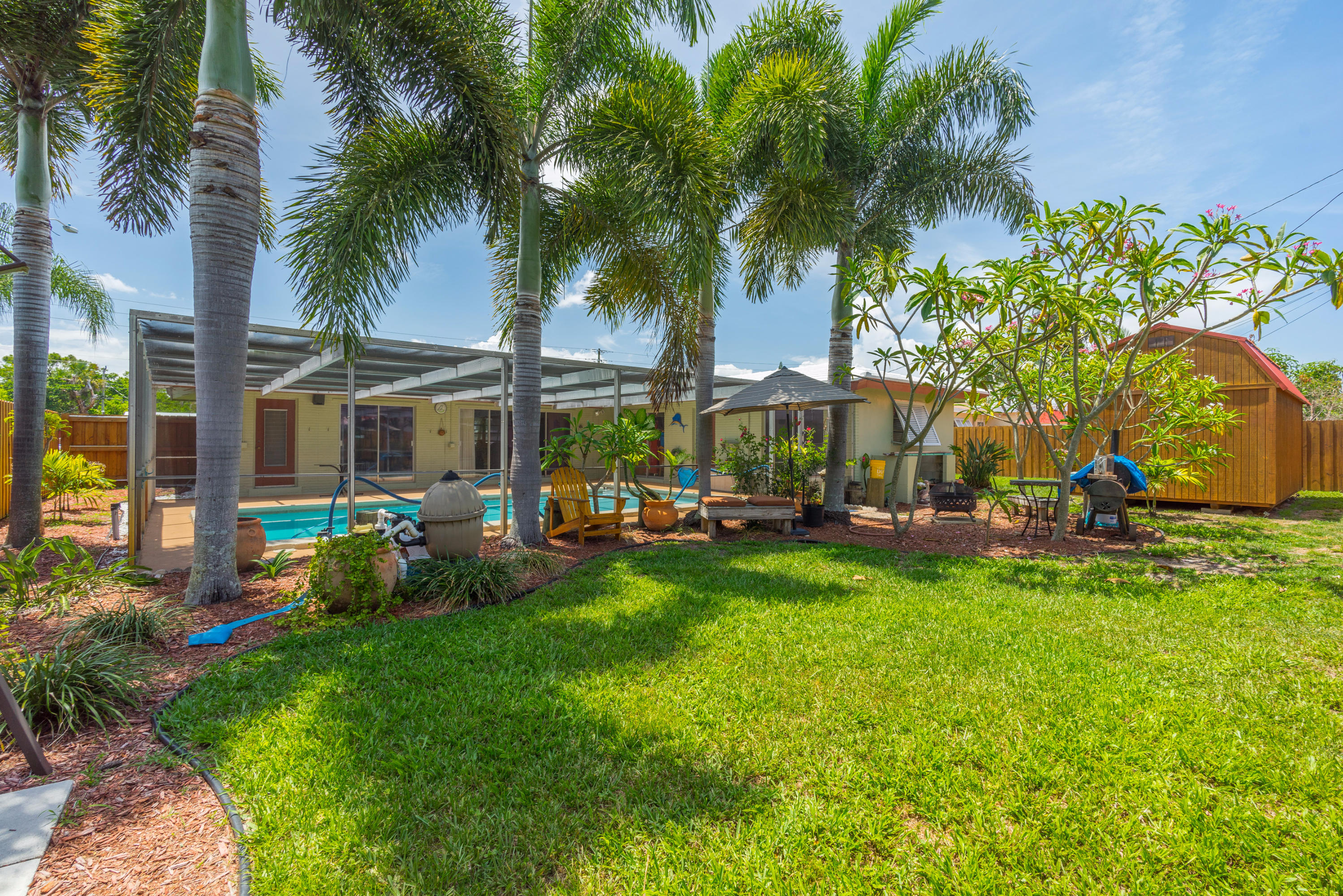 Beautiful and spacious house featuring a bright & open floor plan. Master & guest bathrooms completely renovated with travertine tile wrapped walls from floor to ceiling. Laminate wood flooring. Window treatment included. Large pool in extended fully screened patio. Enjoy the lush view of tropical landscape as you approach the circular driveway. Manicured lawn & private backyard enclosed in a 6Ft tall wood fence which was professionally installed in 2014, recently stained & sealed. Lots of street lights. 10X20 barn style shed with 2 lofts & metal roof. ADT Security system, Bahama hurricane shutters & panels for sliders. Low voltage electrical outlets around entire outside of the house for easy access to electric, very convenient for holiday decorations. Well installed for irrigation.