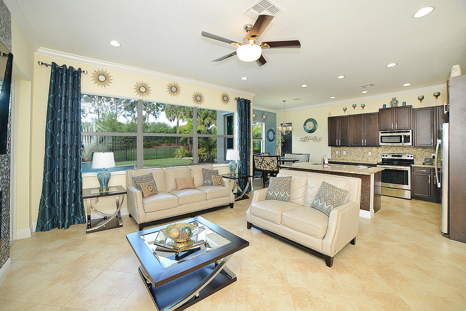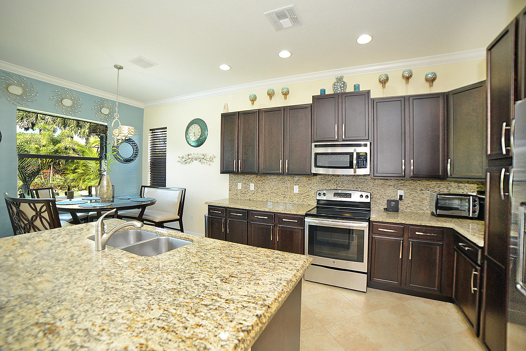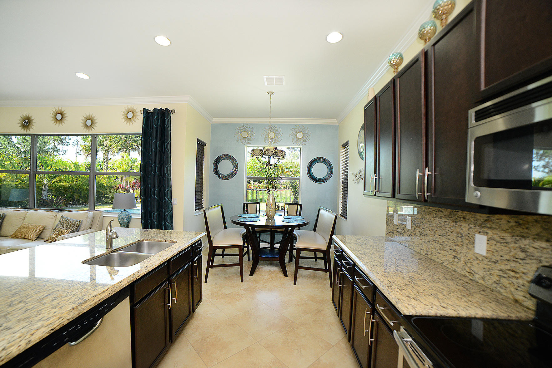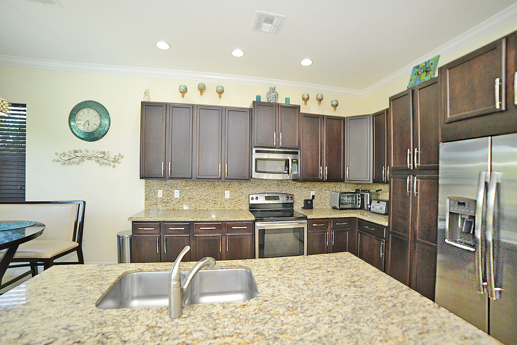 This one has it all! 4 Bedroom 3 Full Bath in the desired Minto inspired community PortoSol . Double door foyer entry. Lots of upgrades; recessed lighting throughout. Guest bedroom downstairs! Kitchen features Santa Cecilia granite w/ Full height backsplash & island and breakfast nook. 5-1/4" Crown molding in common areas of home and Master Bedroom.Diagonal Millstone Golden Amber 20x20 tiles on 1stfloor and 2ndfloor bathrooms and laundry. 5" Oaktown Mohawk engineered wood on staircase & upper hall and all 2nd floor bedrooms. Extra private landscaped patio with Over 700 sq.ft. of walnut travertine tiles over 7' tall areca and fishtail hedges.Dreamlike salt water Pool featuring glow in the dark mosaic glass tiled floor & on large sun shelf. Salt system w/fountain and color led lights.