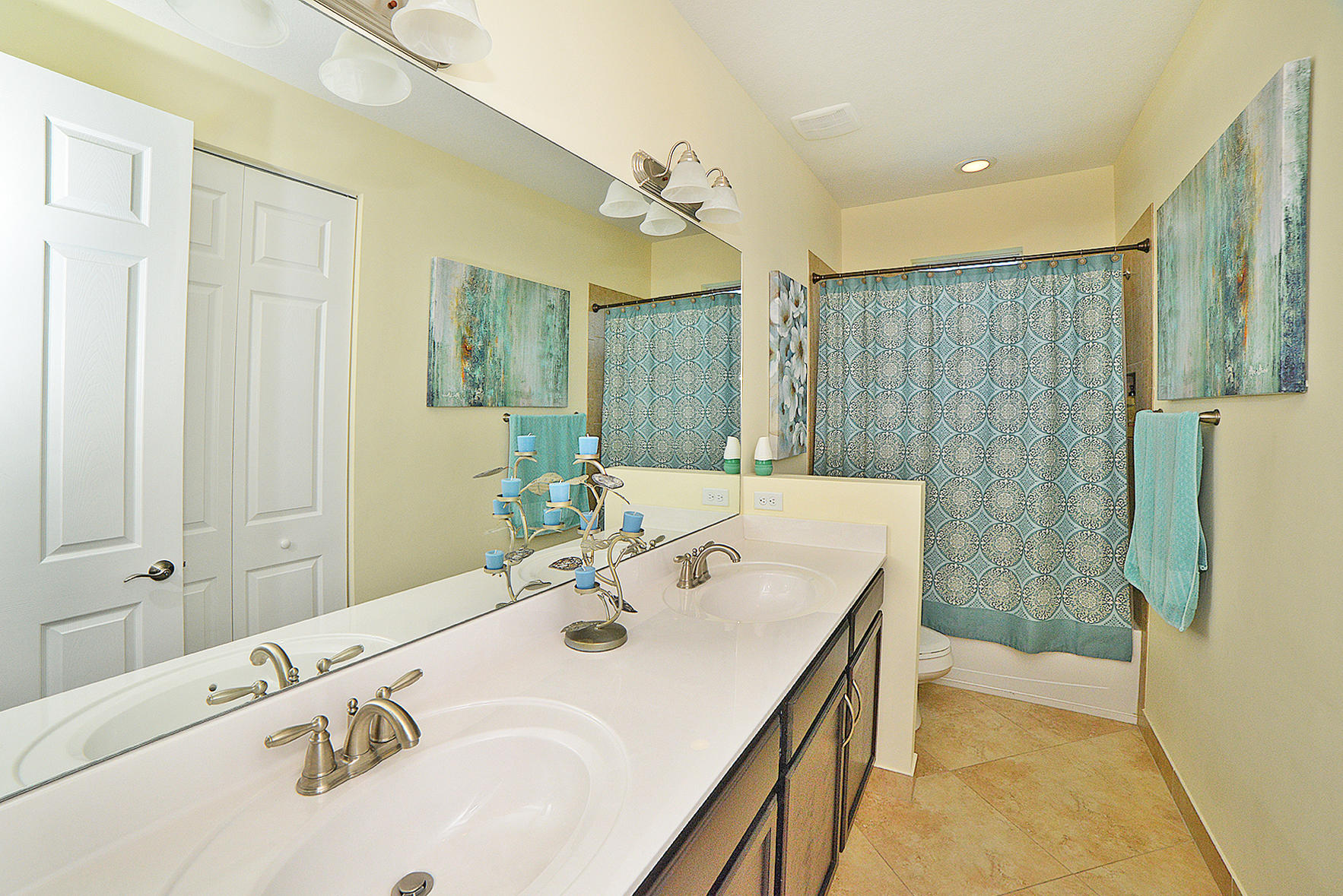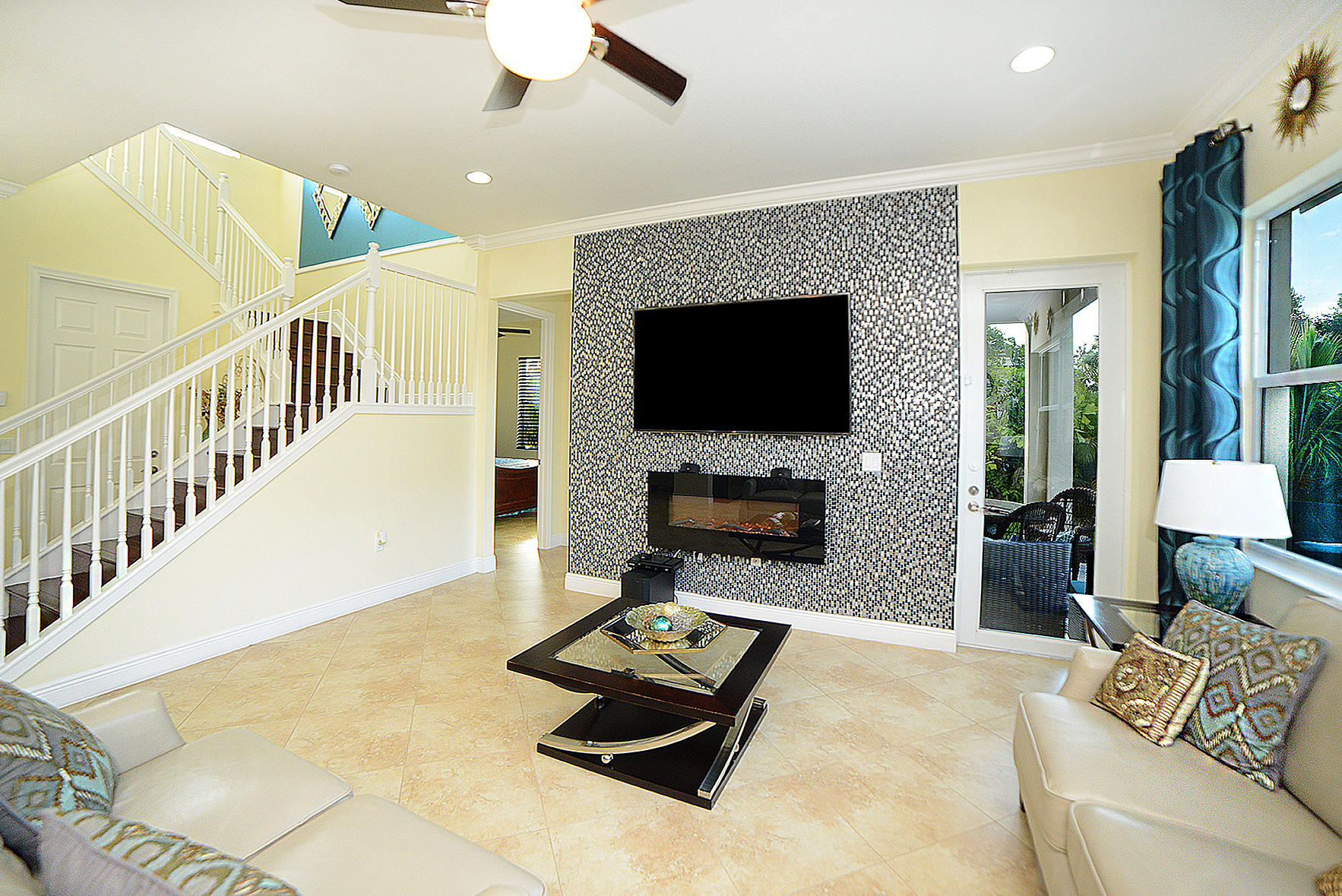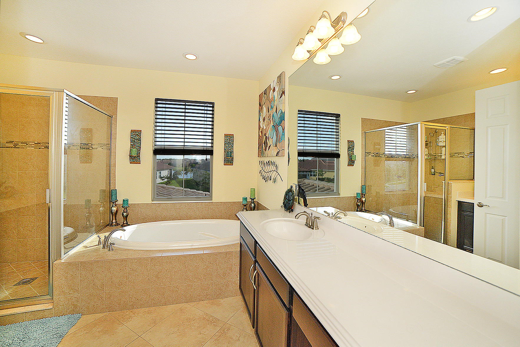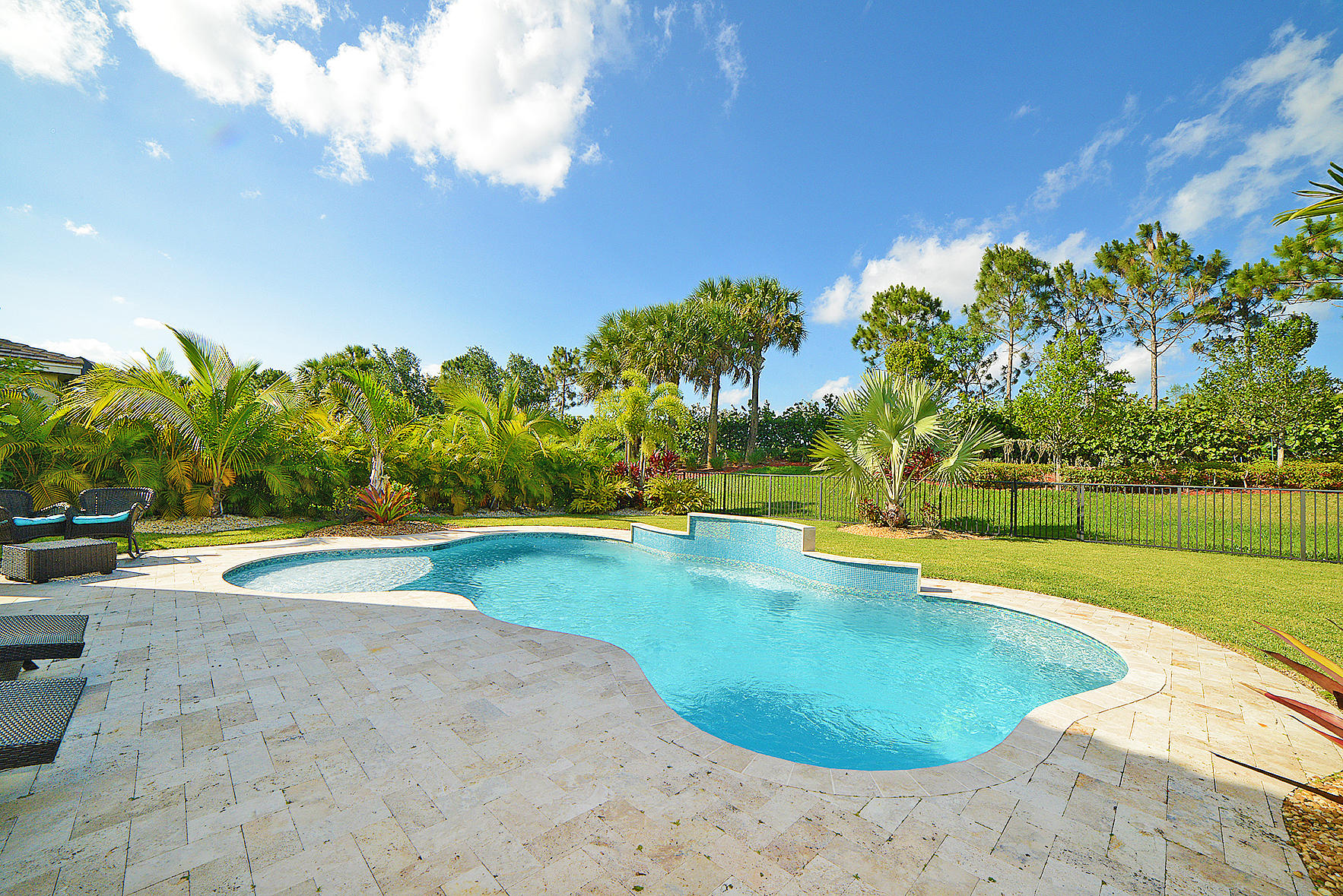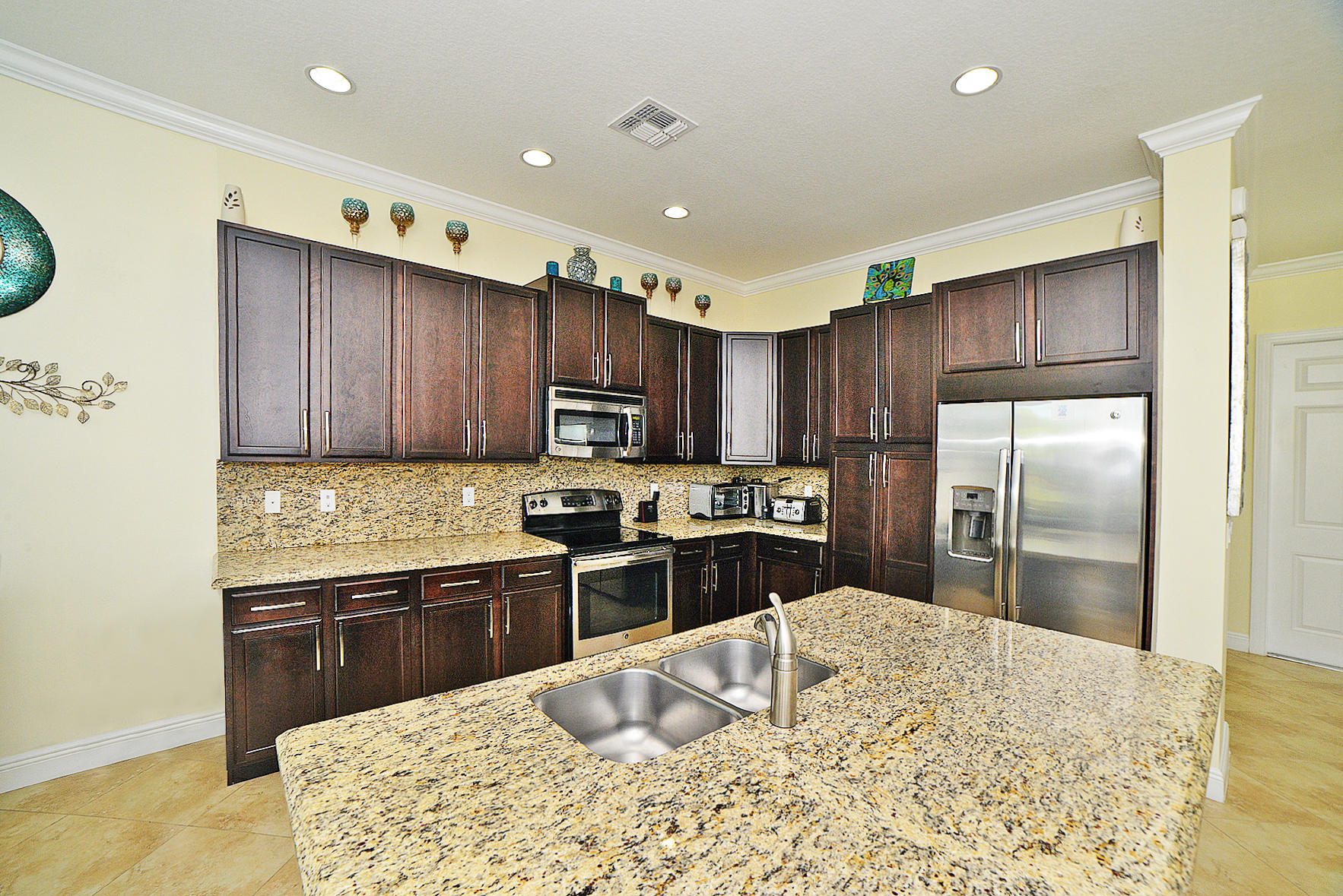 This one has it all! 4 Bedroom 3 Full Bath in the desired Minto inspired community PortoSol . Double door foyer entry. Lots of upgrades; recessed lighting throughout. Guest bedroom downstairs! Kitchen features Santa Cecilia granite w/ Full height backsplash & island and breakfast nook. 5-1/4" Crown molding in common areas of home and Master Bedroom.Diagonal Millstone Golden Amber 20x20 tiles on 1stfloor and 2ndfloor bathrooms and laundry. 5" Oaktown Mohawk engineered wood on staircase & upper hall and all 2nd floor bedrooms. Extra private landscaped patio with Over 700 sq.ft. of walnut travertine tiles over 7' tall areca and fishtail hedges.Dreamlike salt water Pool featuring glow in the dark mosaic glass tiled floor & on large sun shelf. Salt system w/fountain and color led lights.