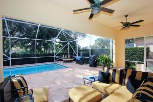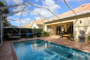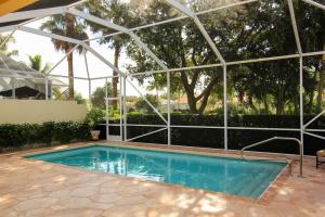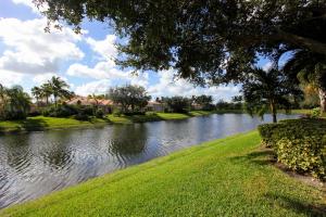 CURRENTLY THE ONLY OAKMONT AVAILABLE WITH A POOL IN RIVERWALK! Unique Opportunity to Purchase this 1 Owner Lakeside Oakmont with Custom Garden of Eden Grounds both in the front & the back & a Screened Heated Swimming Pool in the Incomparable 24 Hour Gated Community of RiverWalk! 15-20 minutes from everything that makes Palm Beach County a Great Place to Live including the Ocean! A Custom Lushly Landscaped Motor Court with Many Flowering Bushes & Trees & a Faux Stone Walk leads to the Covered Faux Stone Floored Entry that opens to the Foyer that Leads to the Great Room with a 12 foot Ceiling, a Stunning Mirrored Entertainment Center, Sealed Stone 18 inch Tile Floors that opens to the Dining Area with Sliders to a Secluded Faux Stone Terrace plus the 18 feet of Sliding Glass Doors that lead