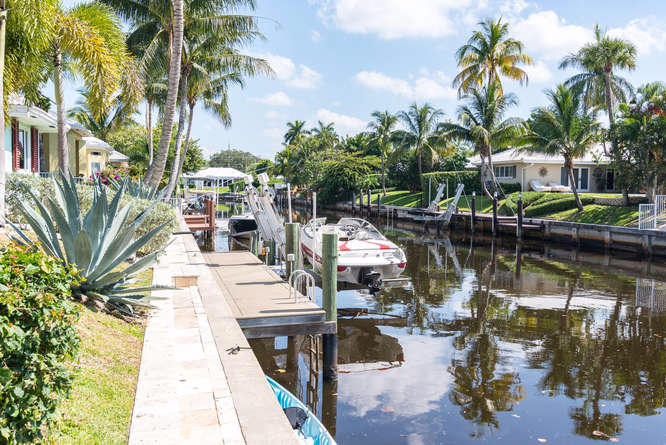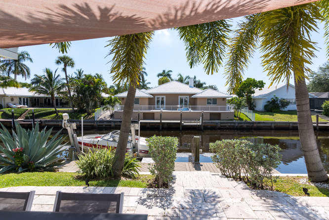 Beautifully remodeled tropical Camino Gardens home with abundant landscaping, spacious yard and deck around the free-form pool. Large 10,080-sq-ft lot offers room to expand. This charming, light and bright home has an open kitchen with wonderful views and a multi-level dock with 10,000-lb boat lift. The ocean-access canal affords boating, paddle boarding, canoeing and kayaking. The split bedroom plan offers two suites with walk-in closets and adjacent fully remodeled bathrooms. The main living and dining rooms combine to create a wide-open entertainment area. An indoor air-conditioned utility/laundry room can double as a butler's pantry. Garage has excellent storage. This home has impact glass and wind mitigation to code. A 15K generator ensures power in event of sto