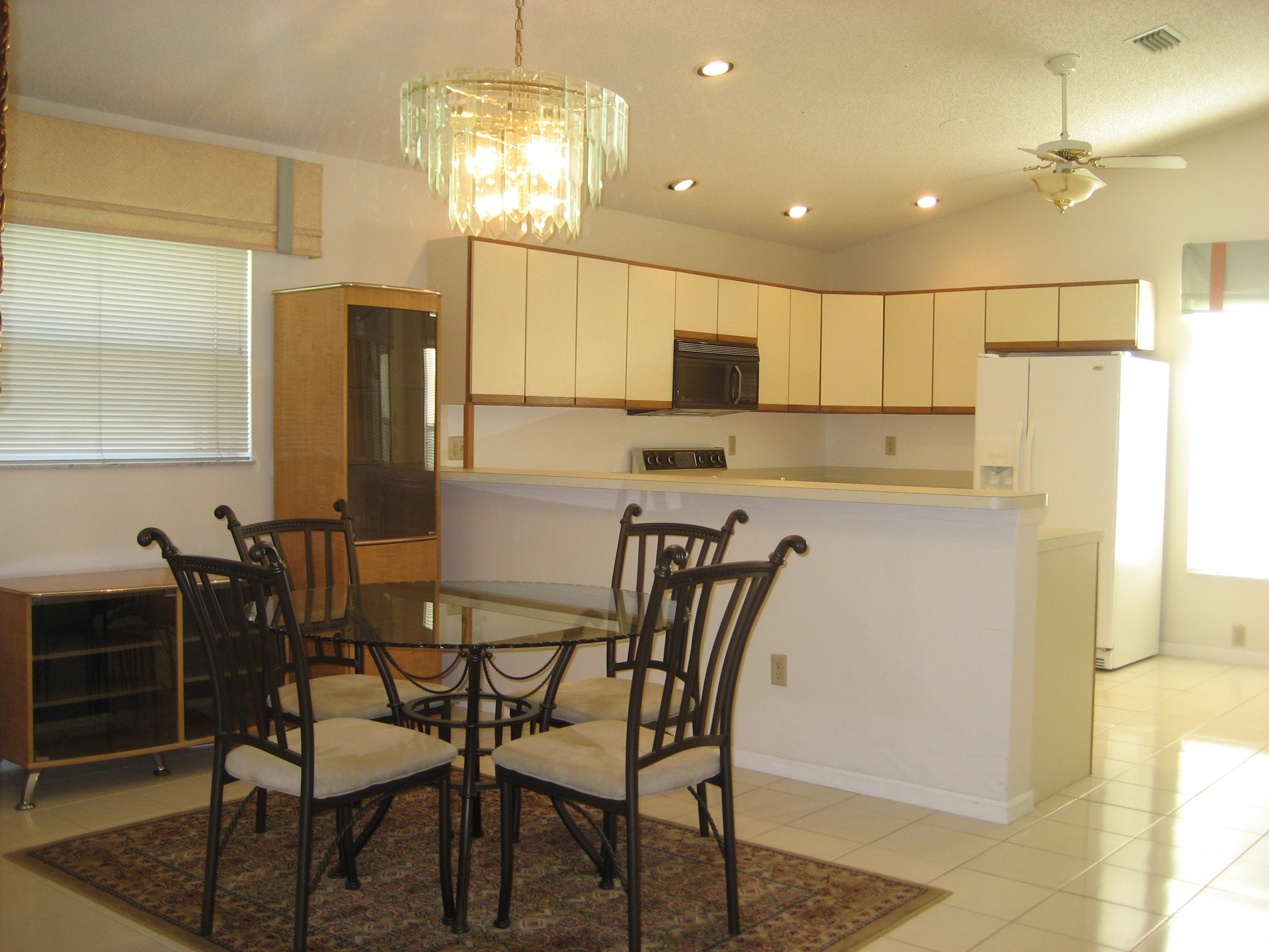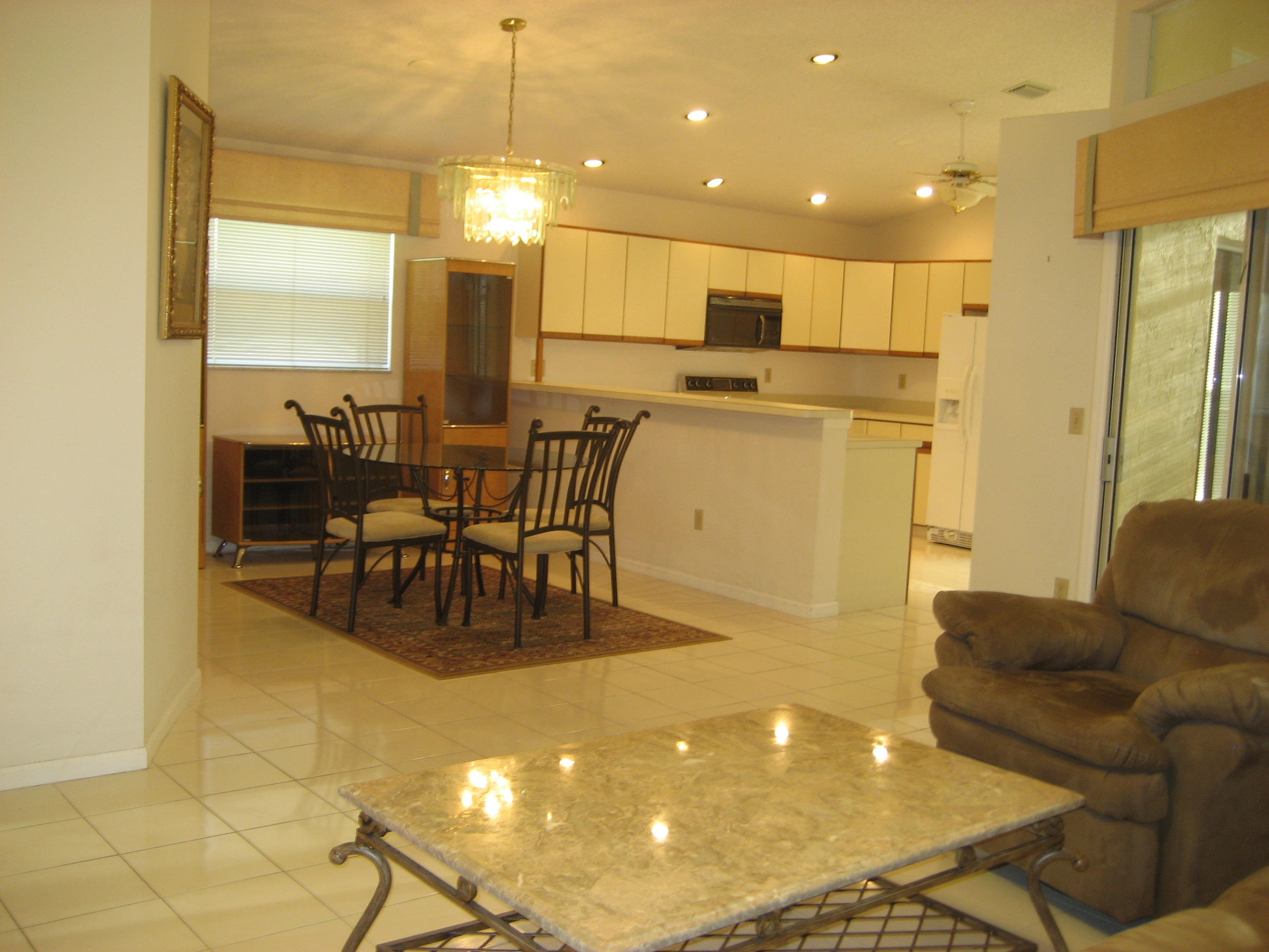 You'll love this house from the moment you enter! Everything is immaculate. The living room is open to the dining room and kitchen. So, this is great for entertaining friends and family or enjoying a quiet night at home. The eat-in kitchen has loads of cabinets and counter space plus a snack bar. and, all of the rooms are open to the large,screened patio with the expansive,tranquil lake view. The master bedroom is large enough to accommodate very large furniture: has a large walk-in closet and an ensuite bathroom. The 2nd and 3rd bdrms. are on the opposite side of the house and share the guest bathroom with shower and tub. The floors throughout the house are either tile or laminate wood; no carpeting here! The windows have accordion hurricane shutters and the screened patio has rolldowns.