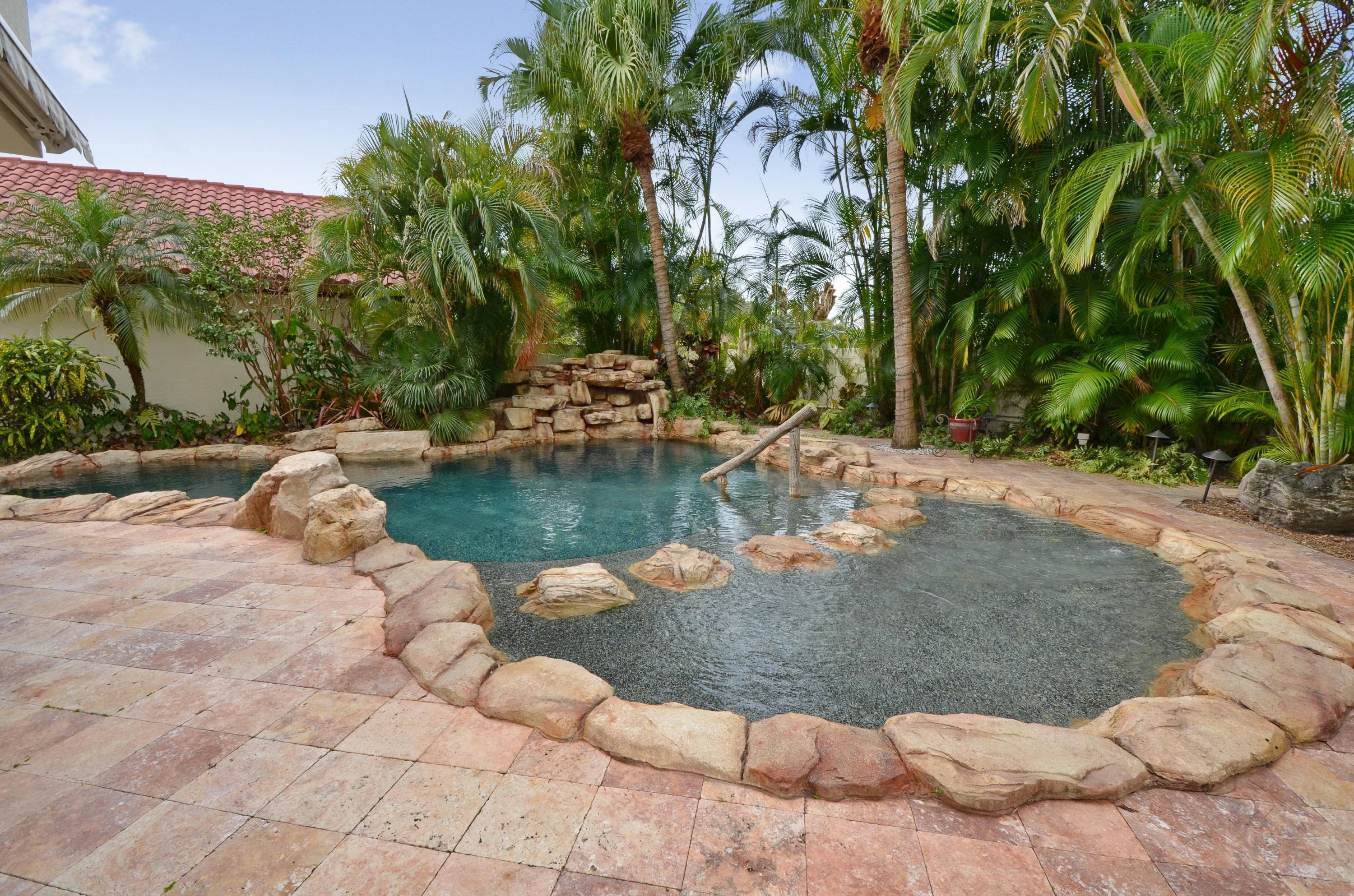 Priced to Sell! Beautiful two story courtyard pool home situated on private lot. Gated community in the best Town Center location. 4/3 (one bedroom/bath down) plus custom elevator. Meticulously maintained residence offers formal living with soaring ceilings, stone fireplace & wet bar. Formal dining room with three skylights bring natural light into the living area. Updated granite kitchen, stainless appliances & breakfast bar. Impact windows/hurricane shutters. Gorgeous resort style waterfall heated lagoon pool surrounded by tropical courtyard & marble paver patio. Second level BR's offer scraped wood flooring. Two zone AC and tankless hot water heater. 3CG.