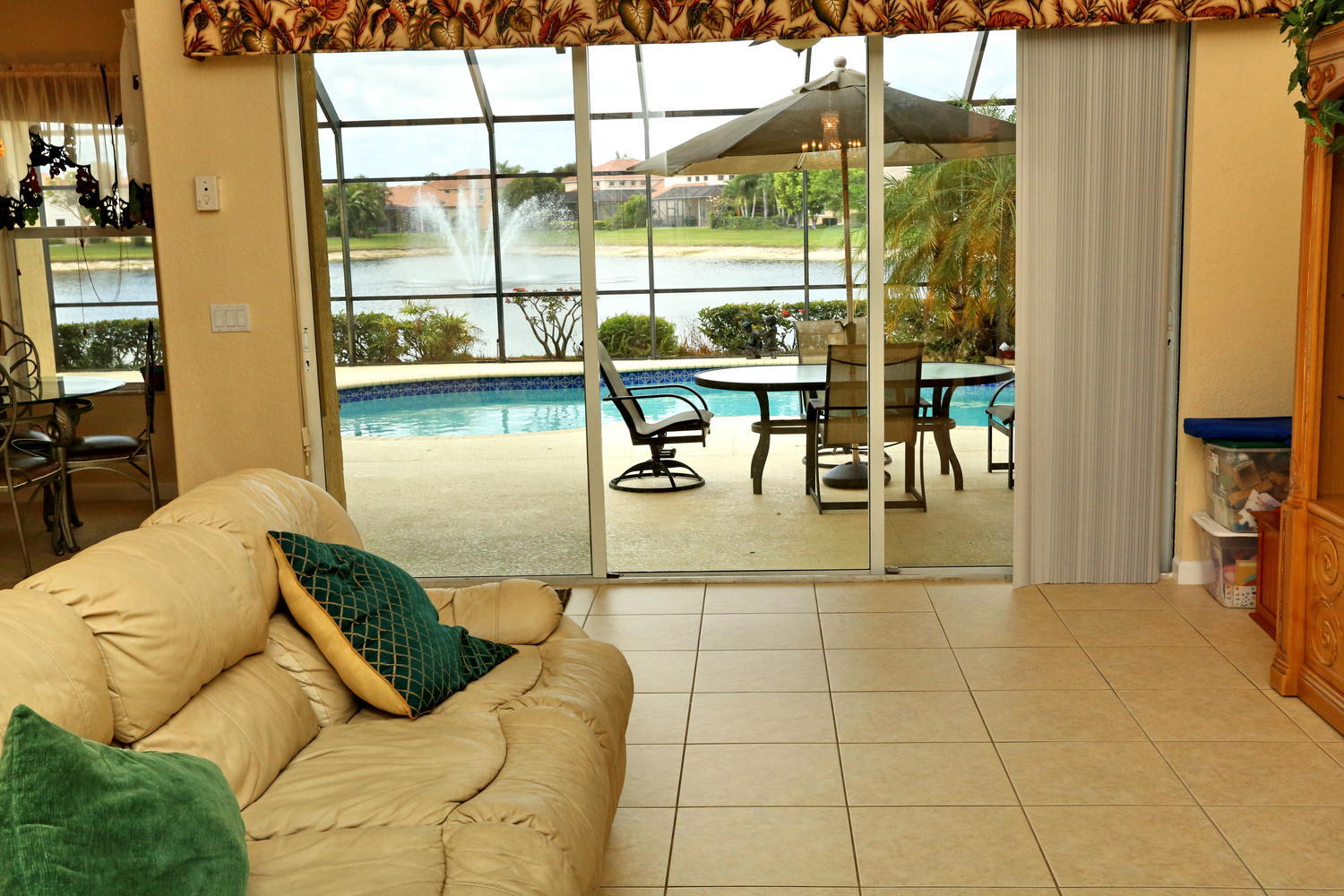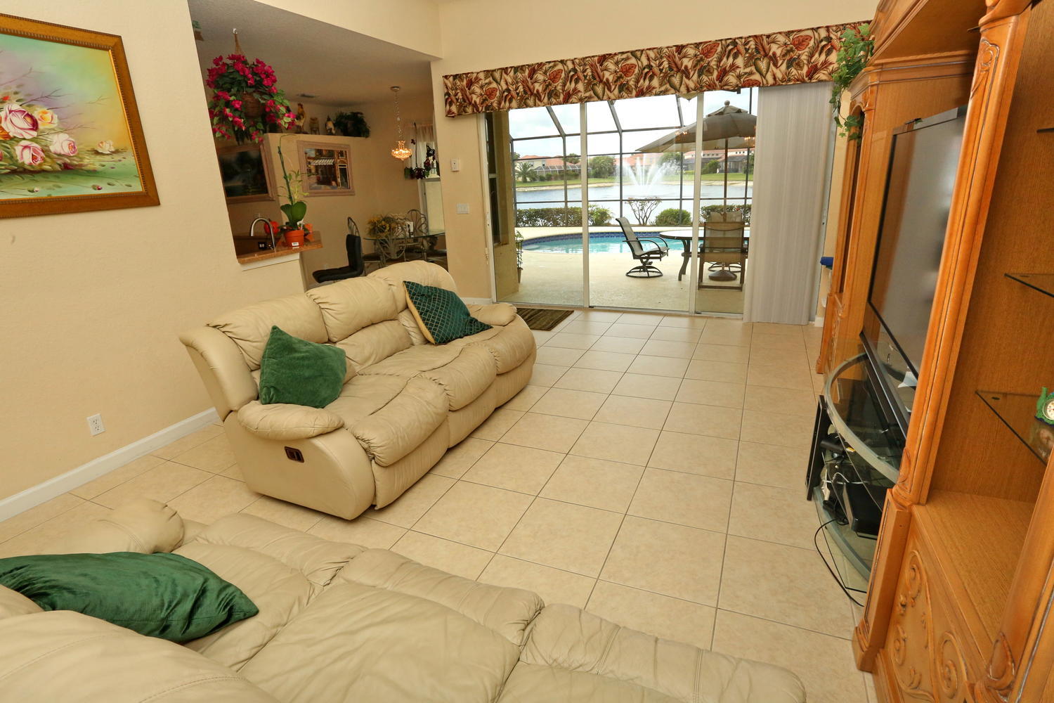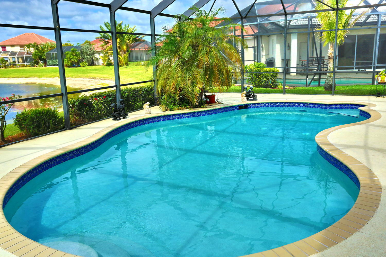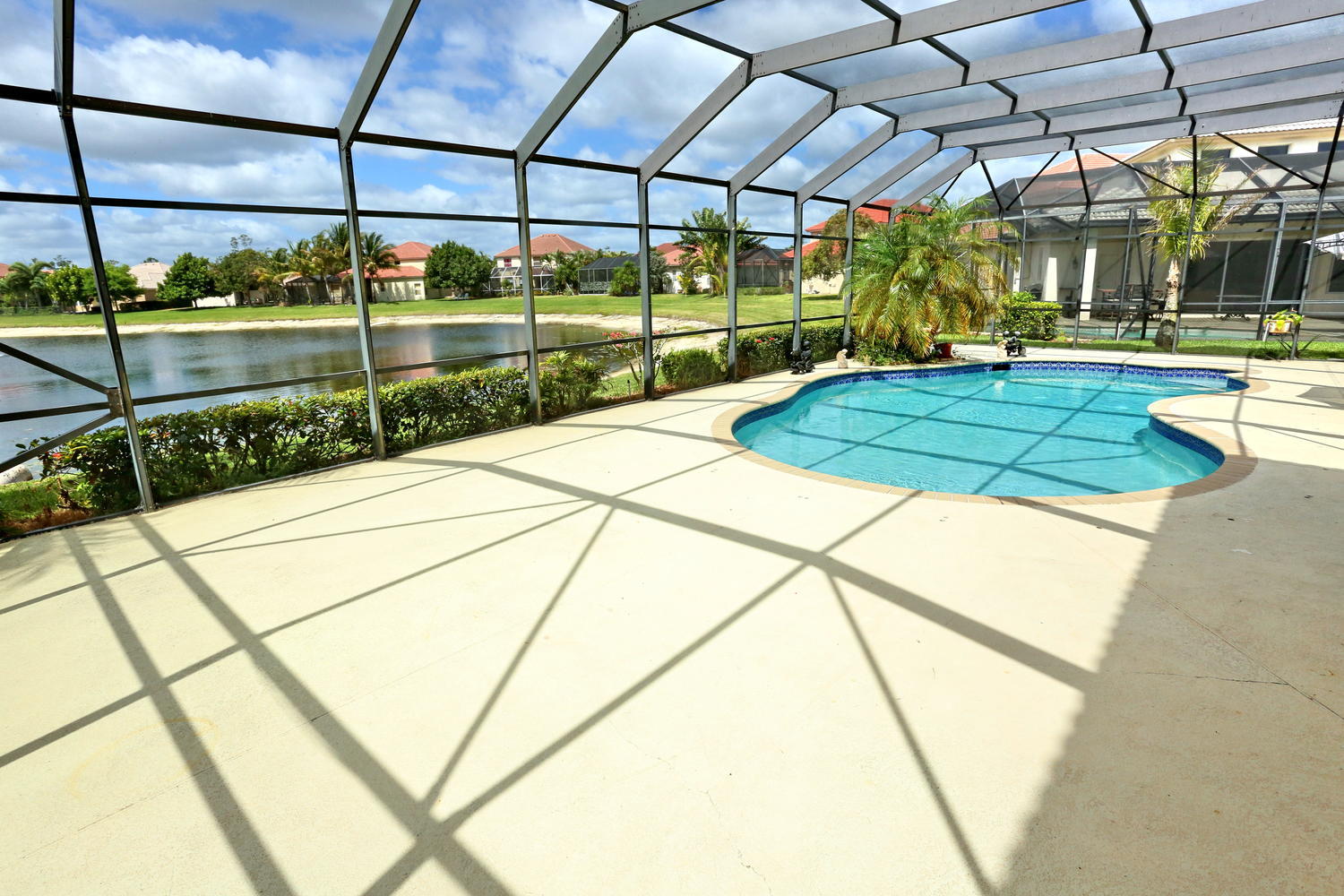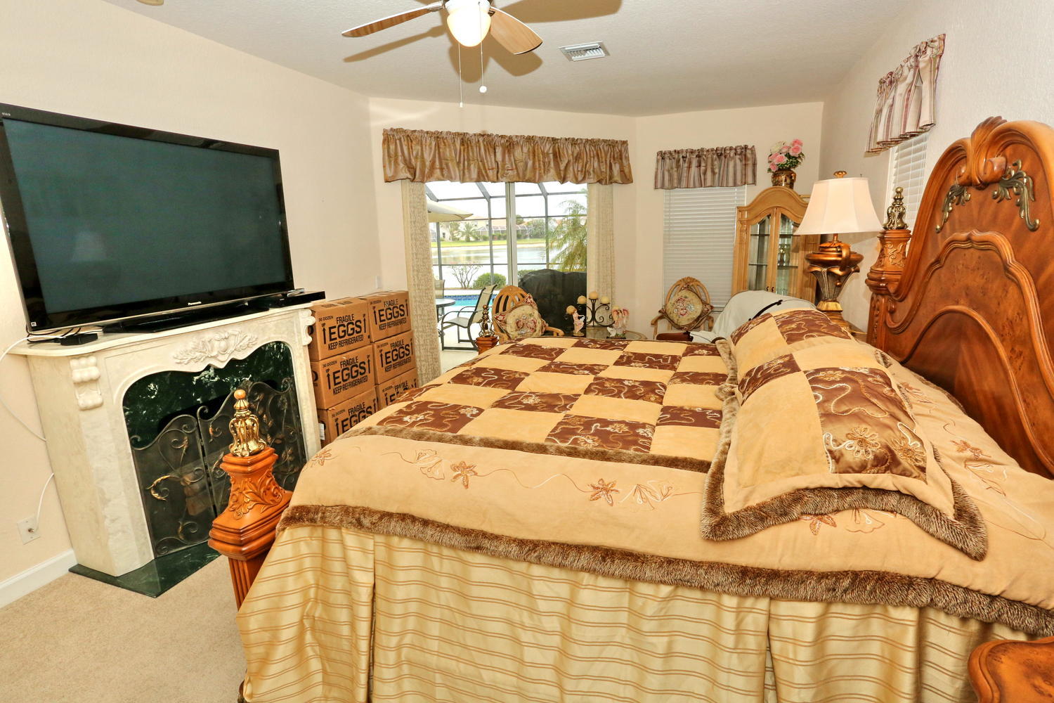 Hurry! Outstanding 6 Bedroom/4 Full Bath Resort style home features majority of the living space on the 1st floor, with 2 bedrooms, flex/media/game room & full bath upstairs! Amazing free form pool and long lake views from the spacious family room and Master bedroom. Two sets of Sliding glass doors to outdoor patio & pool. Large Screen enclosure,long lake views to beautiful water feature! Granite kitchen counters, all stainless steel appliances,42" cabinetry & center island. Double Tray 12' ceilings with crown moldings on Dining/Living area's. Large Master Bedroom features 2 closets, Roman Tub & separate stall shower. Split floor plan with 3 additional bedrooms on main floor. First Floor laundry & laundry sink. Spacious 3 car garage. Very reasonable HOA. Home Warranty transfers to buyer.