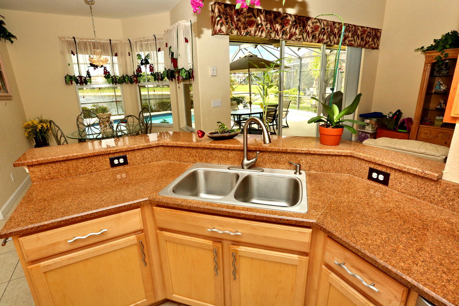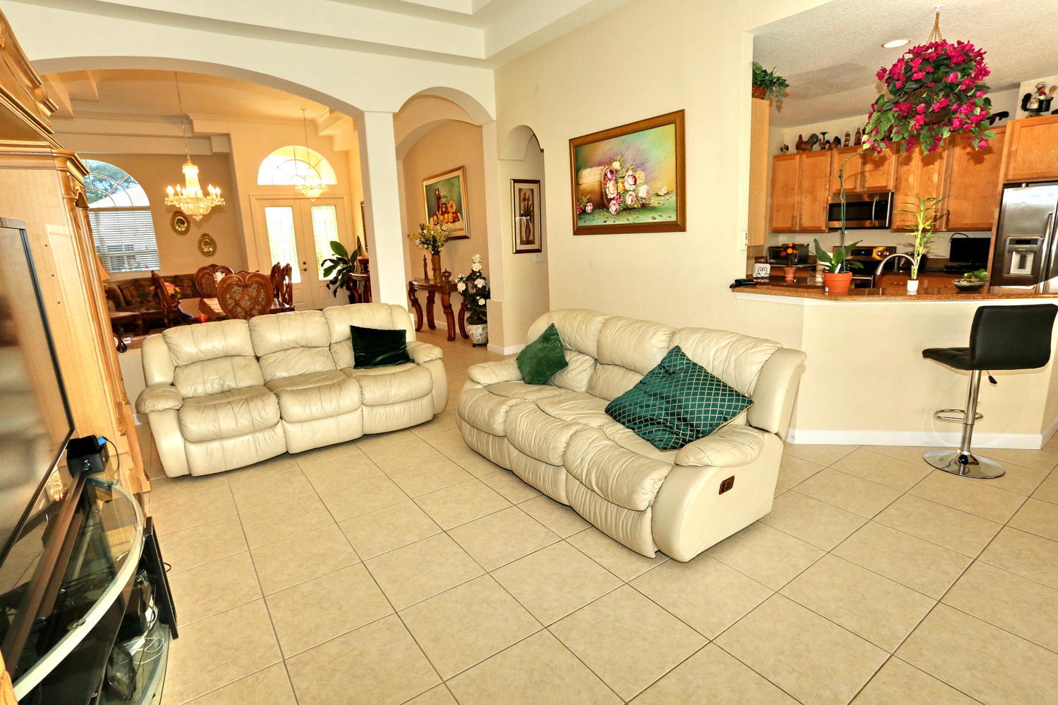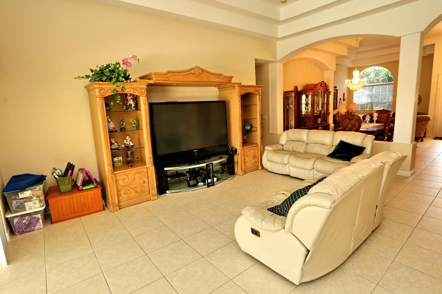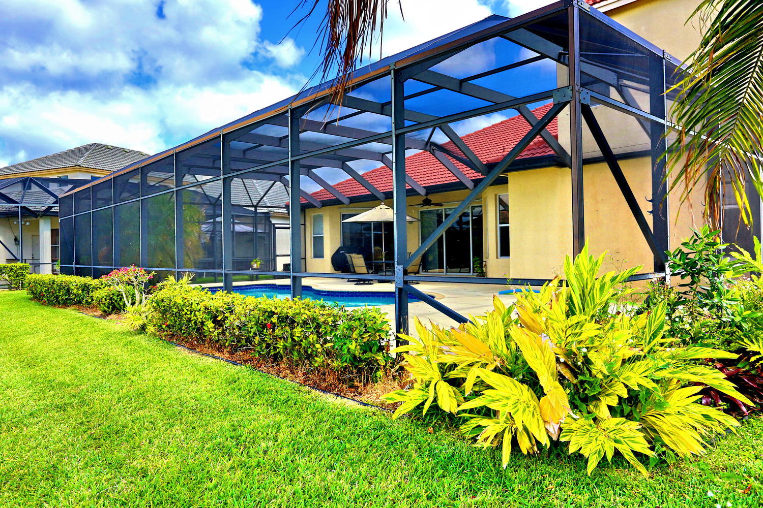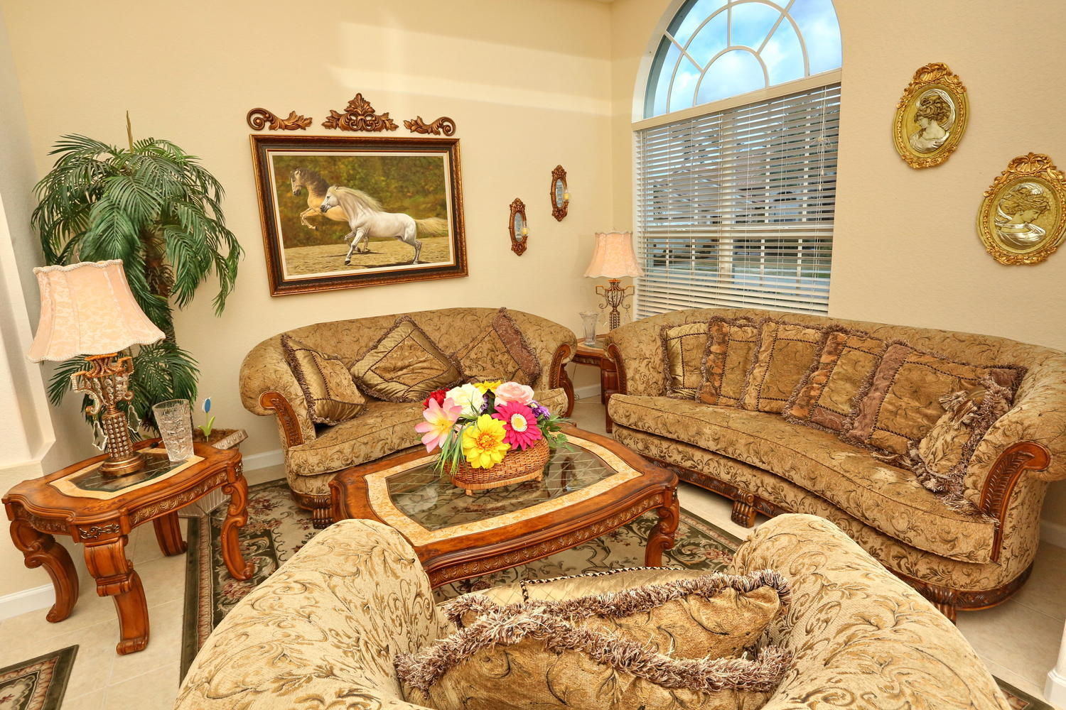 Hurry! Outstanding 6 Bedroom/4 Full Bath Resort style home features majority of the living space on the 1st floor, with 2 bedrooms, flex/media/game room & full bath upstairs! Amazing free form pool and long lake views from the spacious family room and Master bedroom. Two sets of Sliding glass doors to outdoor patio & pool. Large Screen enclosure,long lake views to beautiful water feature! Granite kitchen counters, all stainless steel appliances,42" cabinetry & center island. Double Tray 12' ceilings with crown moldings on Dining/Living area's. Large Master Bedroom features 2 closets, Roman Tub & separate stall shower. Split floor plan with 3 additional bedrooms on main floor. First Floor laundry & laundry sink. Spacious 3 car garage. Very reasonable HOA. Home Warranty transfers to buyer.