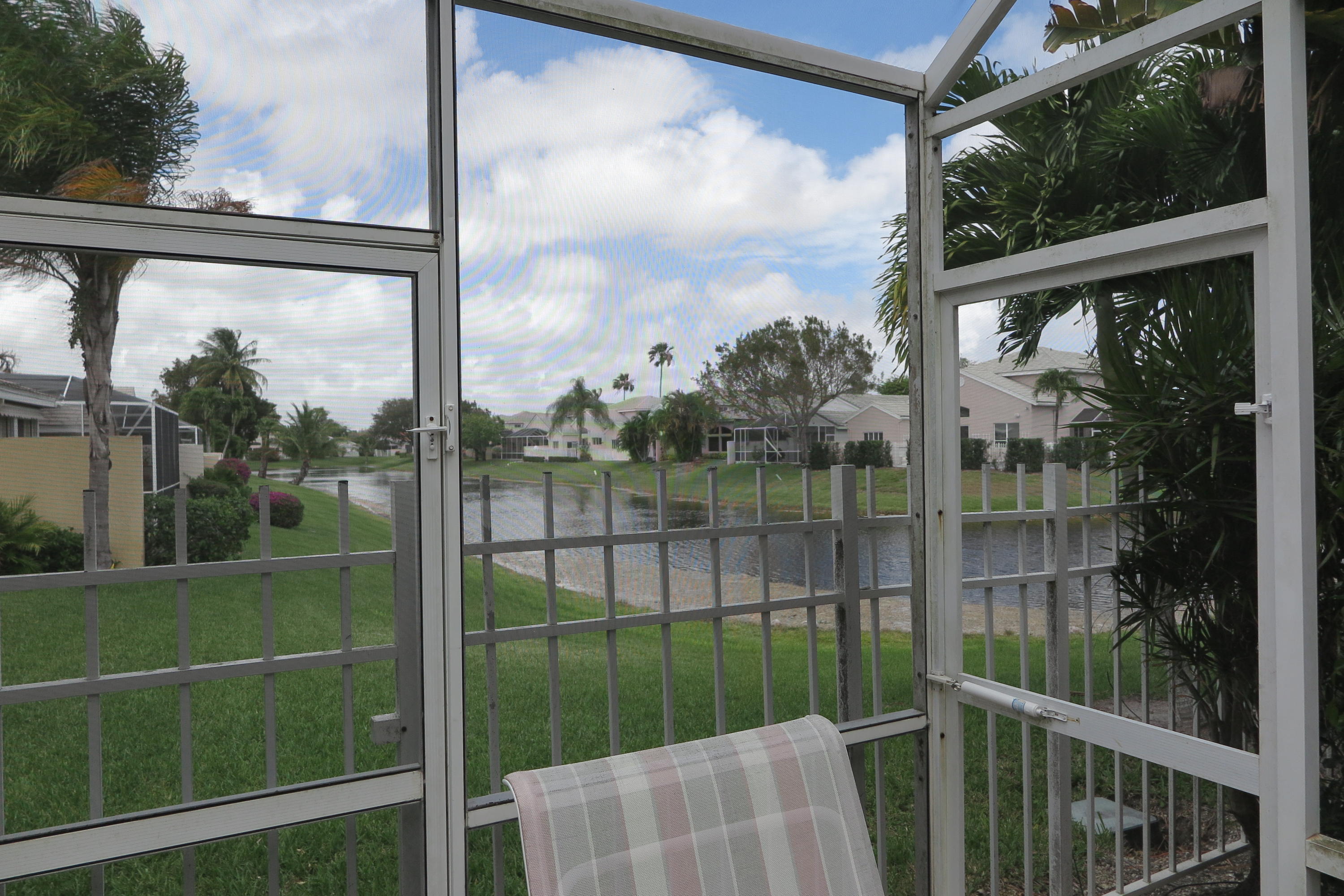 Wow! Come see this single story pool home with corner lake view! Lovingly maintained by original owners. Floor plan features high ceilings with large living room. Two bedrooms with walk in fitted closets plus a den or possible third bedroom with sky lights.Nice size kitchen with breakfast area. Stainless appliances, white ceramic tile floors. Roof replaced in 2008, accordion shutters on all windows and doors, appliances and A/C and water heater all replaced over the past few years. Large screened in patio with pool and lake view from back corner. Subdivision is well maintained with community pool and 24 hour manned gate.