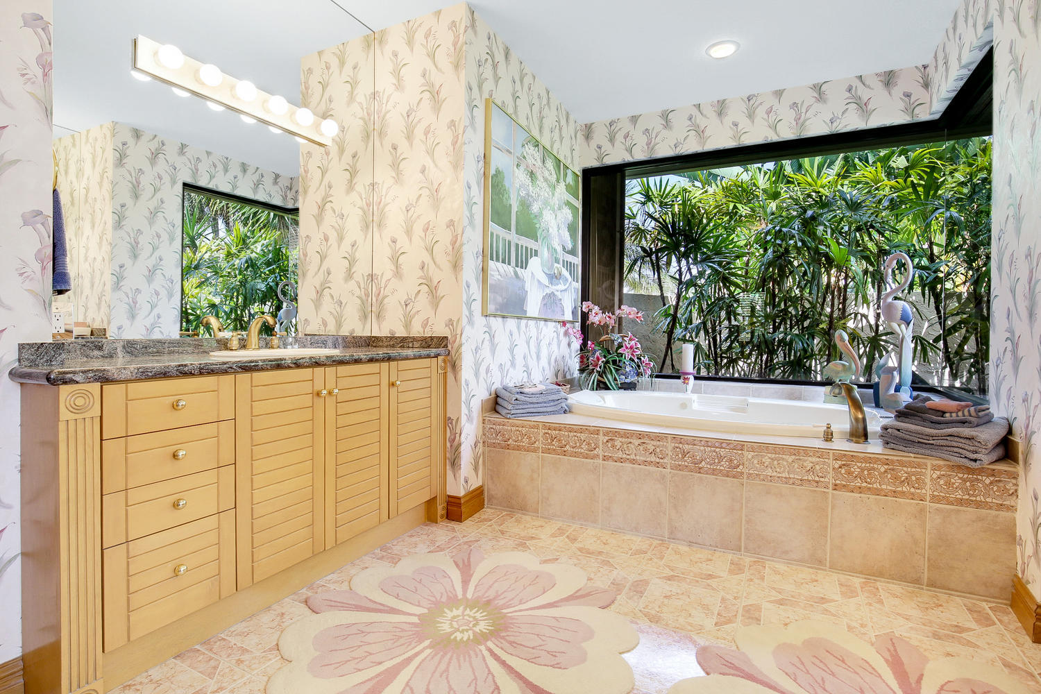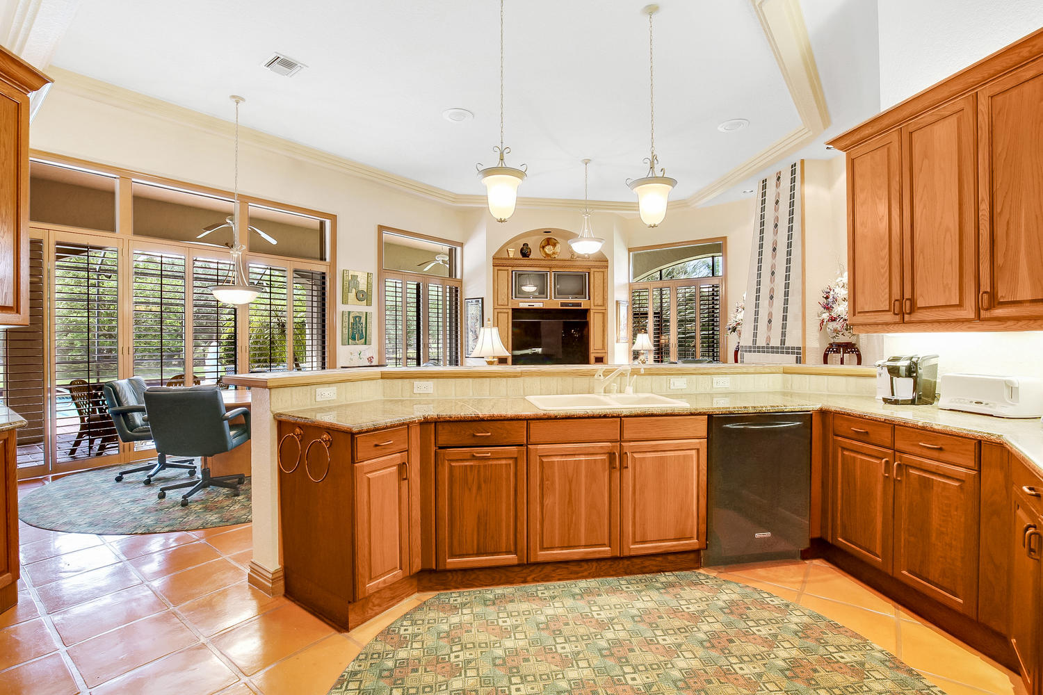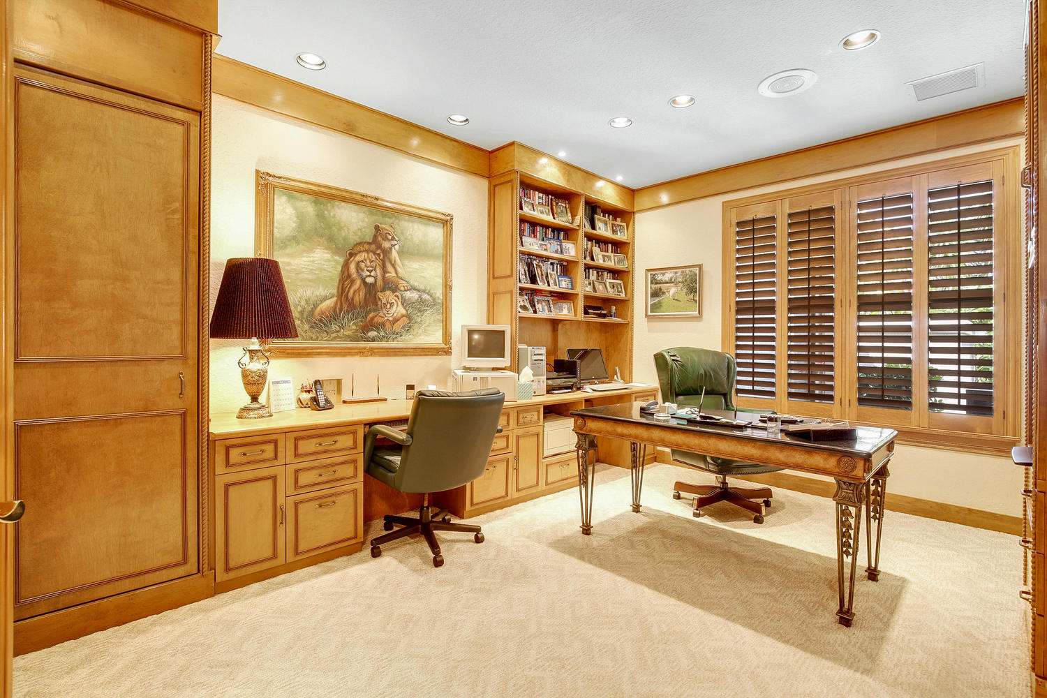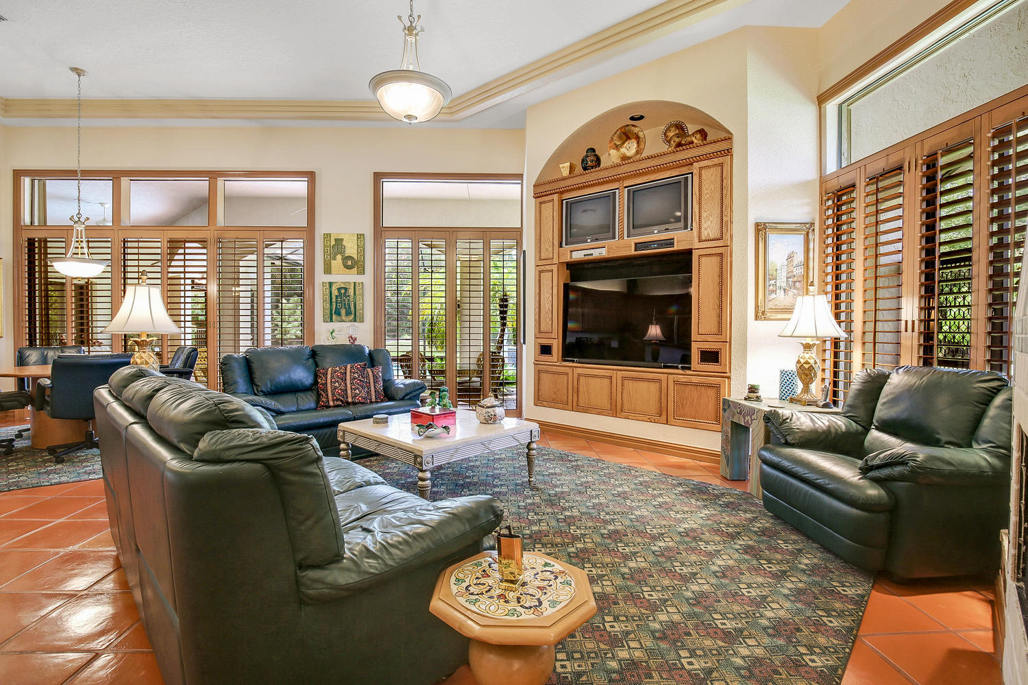 Located in private Flagler Estates inside the gates of Breakers West. This custom upgraded pool home has been meticulously maintained. The patio has incredible golf and lake views.The main house features three bedrooms with an office/den and three bathrooms. The attached guest house has two bedrooms and two full baths. Oak kitchen cabinets with granite counter-tops,tumbled marble breakfast bar, Mexican tile in living area, walk in pantry, plantation shutters on all windows and jacuzzi tub in master bath. Want a huge closet? The owners transformed the main house second bedroom into a dream closet, with enough shelving to fit 250 shoes, easily converted back to a bedroom! Lovely pool and patio with built in grill, covered area and screen enclosure. Club membership available, not mandatory.