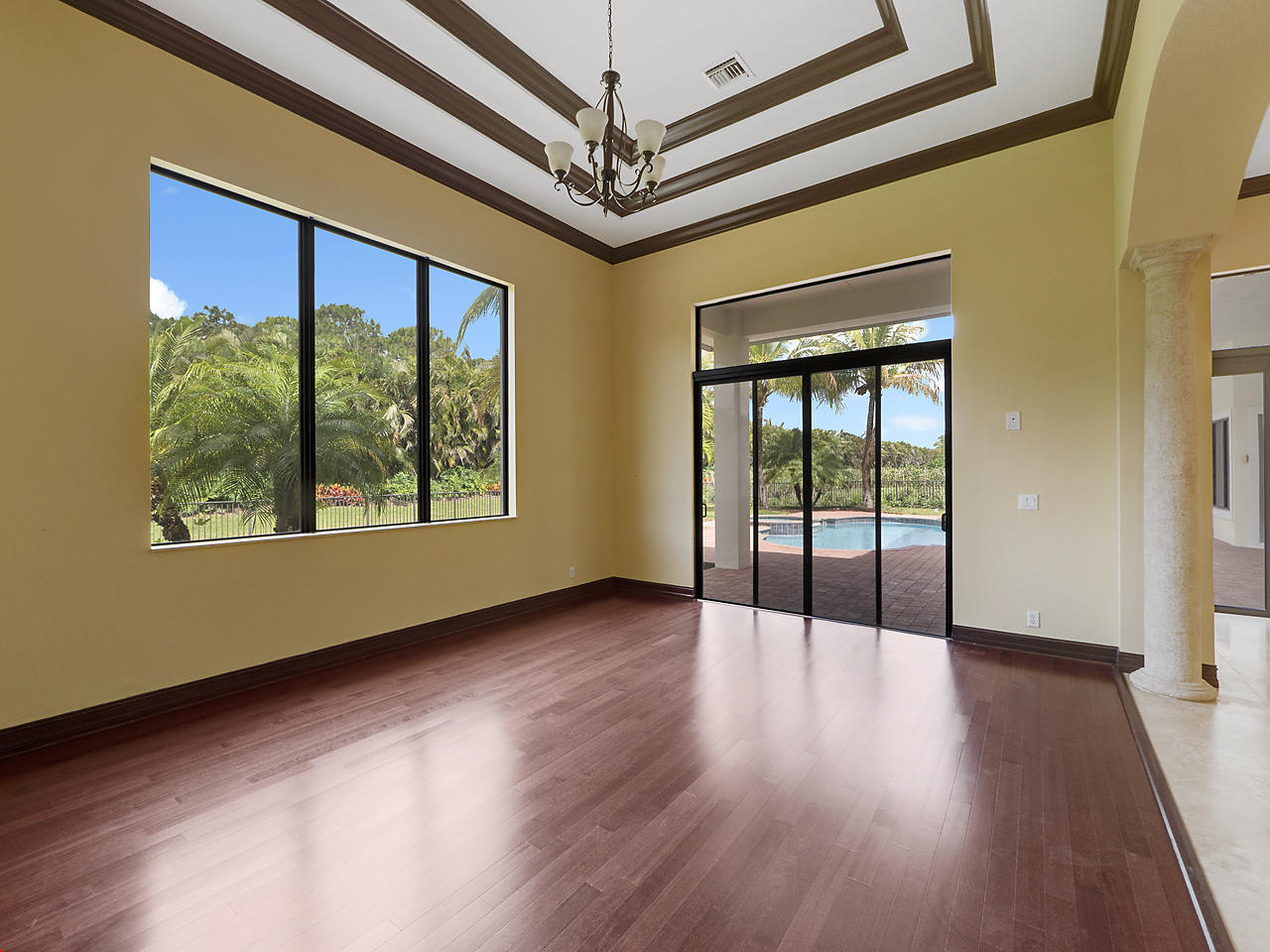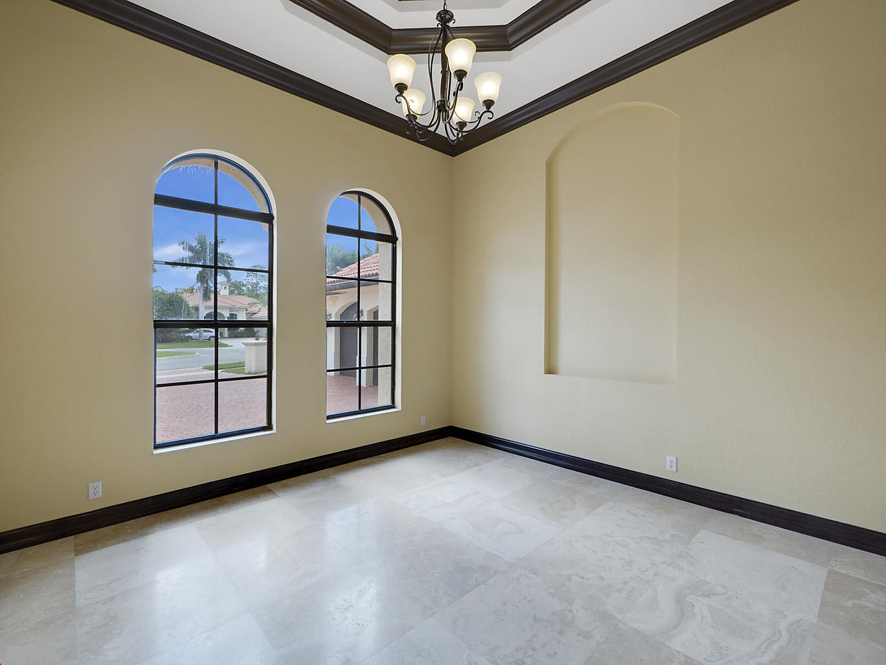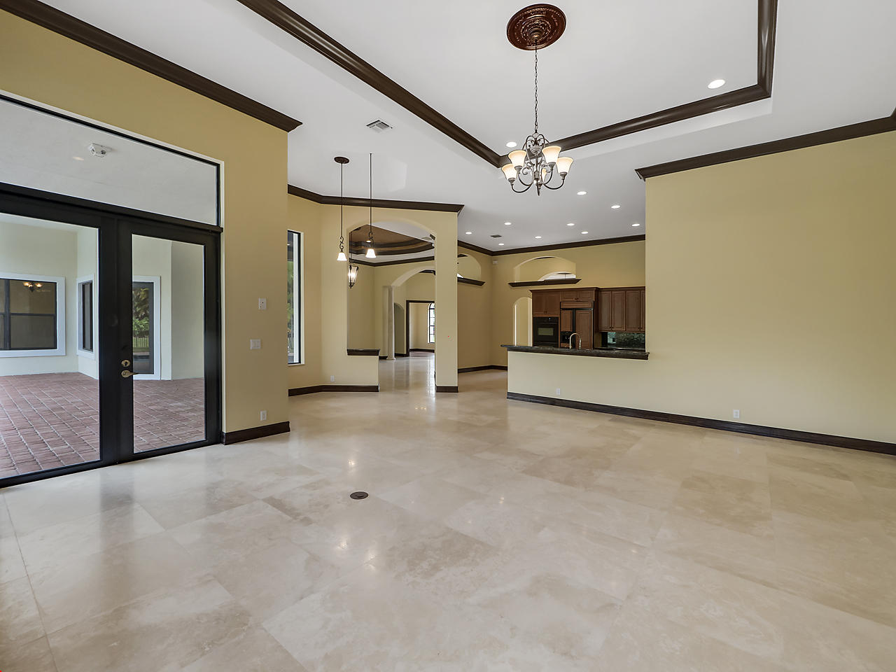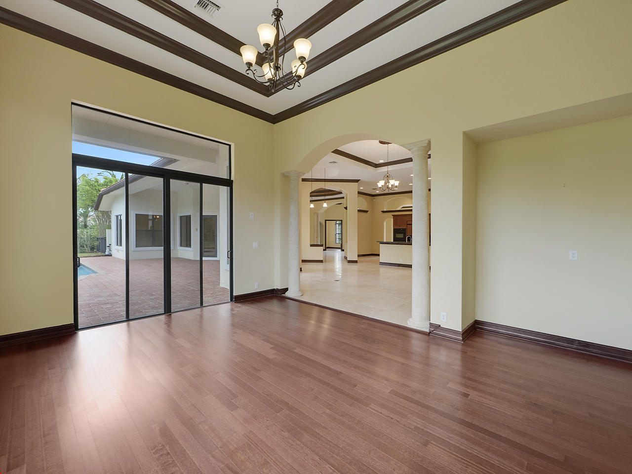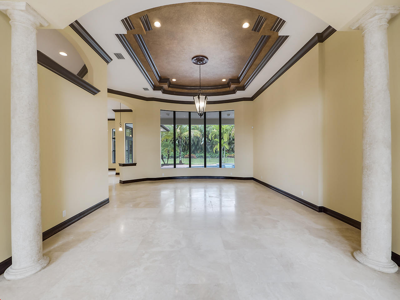 Modified Estancia model built by Delcrest at The Club at Ibis's spacious subdivision The Preserve. New landscaping & circular driveway great you as you approach this stately home. Wrought iron gates allow access to double glass front entry doors. 24'' X 24'' Saturnia Tile throughout except bedrooms. The Bedrooms are ready for your choice of Flooring. Crown molding throughout most of the home. Impact glass will keep you at ease during hurricane season, buffer noised & help with savings on your power bill. As you enter the living room notice the double coffered ceiling with crown molding & the great view of the pool, spa & yard. The adjacent dining room also offers double coffered ceiling with crown molding.