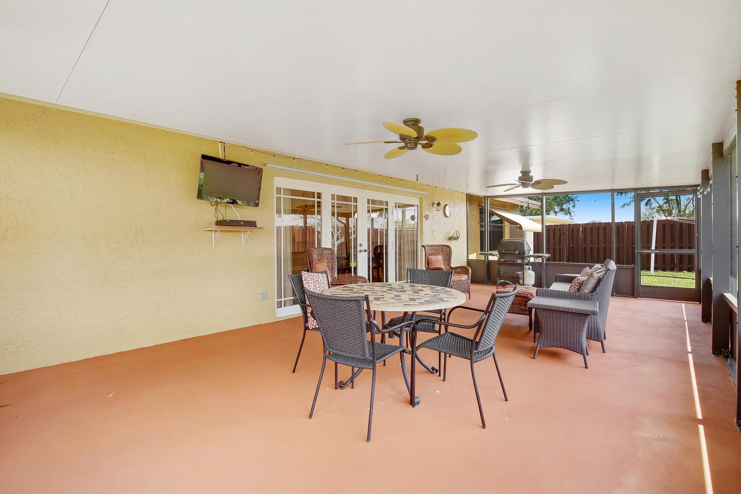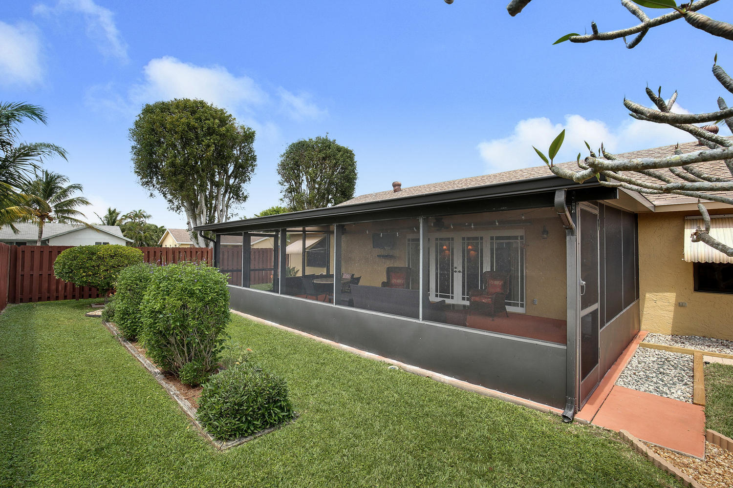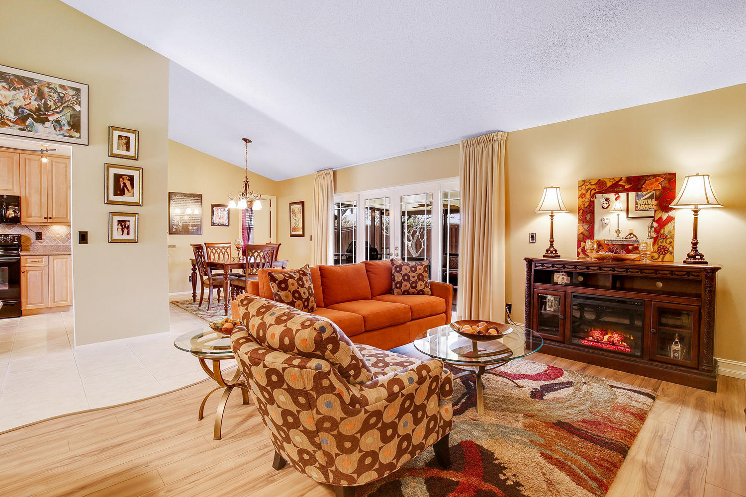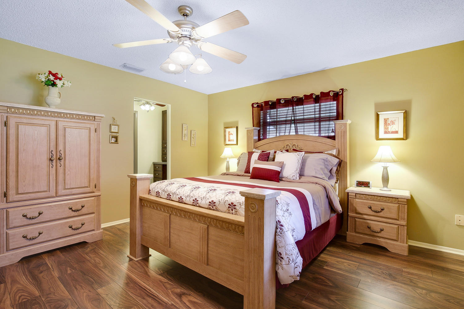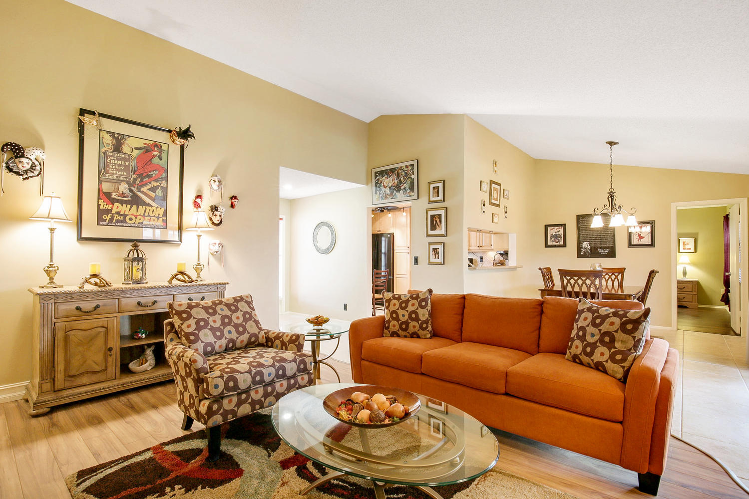 This home exudes pride of ownership from the minute you drive up and see the large,impeccably maintained corner lot! Stone look tile & laminate floors throughout. Dreamy eat-in kitchen has custom honey maple cabinets w/42'' uppers, silestone counters,stainless double sink, tumble marble backsplash, mullion cabinet doors w/accent lighting plus under cabinet lighting. Large pass-thru opens to spacious dining room. Split bedroom plan for extra privacy. Vaulted ceilings. French doors lead out to the 15'x30' foot screened porch where you can relax and enjoy the beautifully landscaped backyard. Impact windows and shutters provide hurricane protection. Master Suite has updated bathroom with wood vanities,granite counters, walk-in closet & a dressing area.Low HOA fees! Community pool & playground.