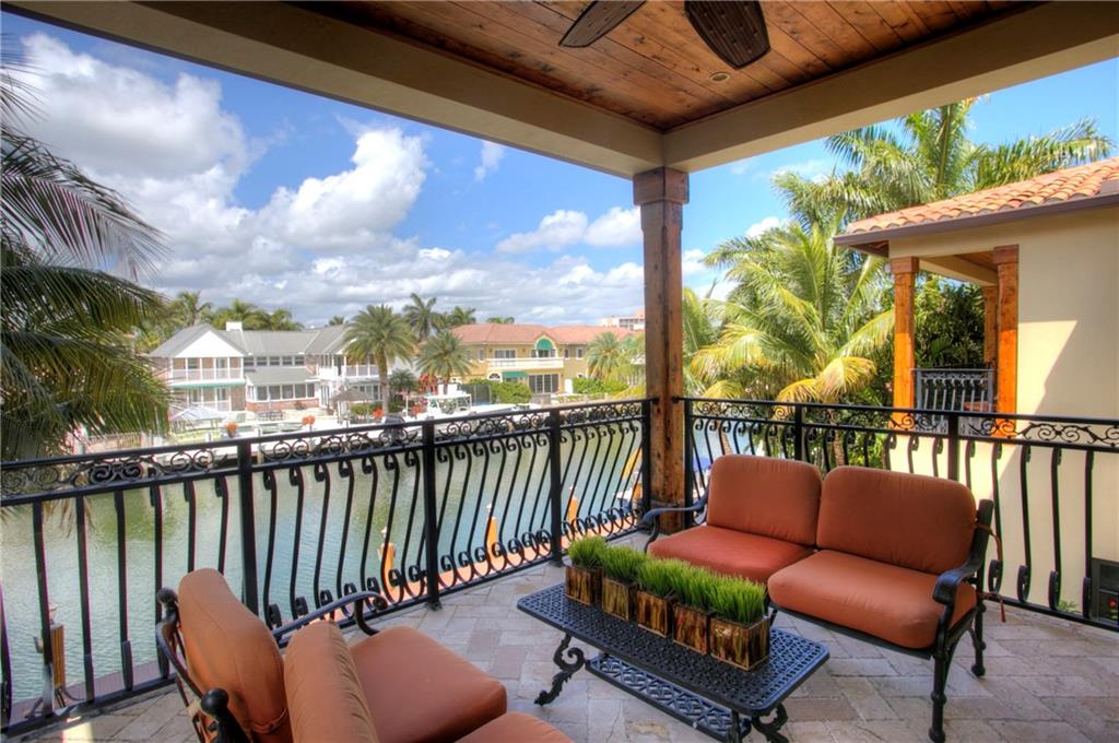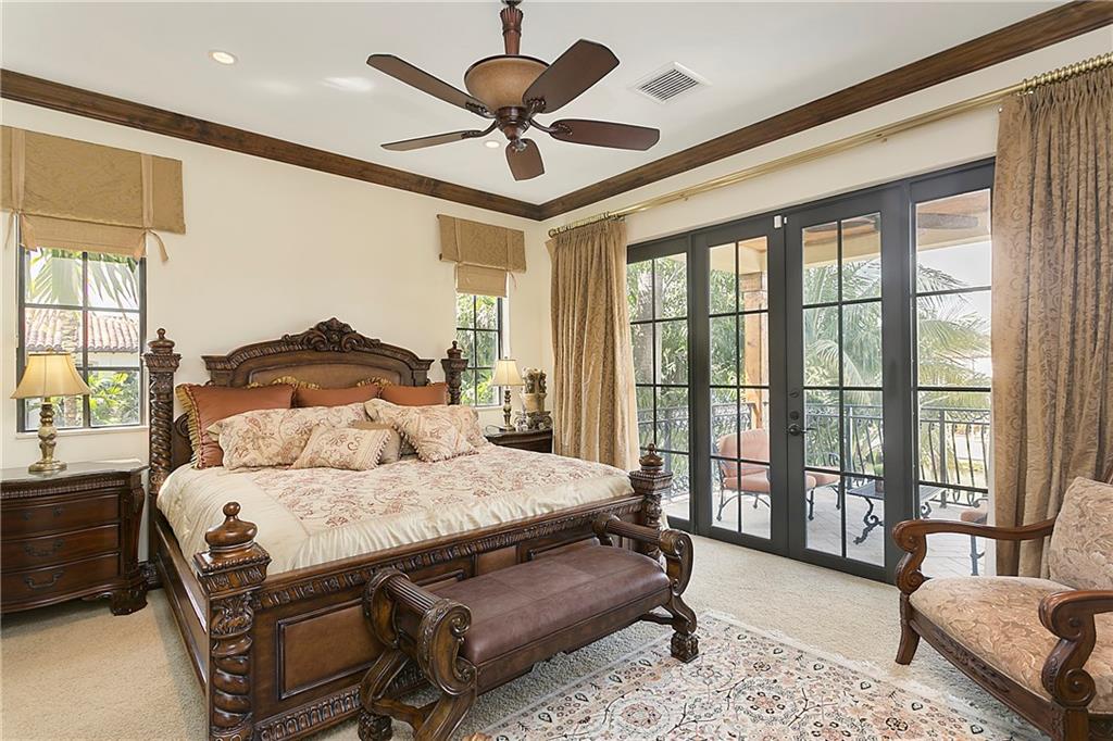 : Exquisite Mediterranean home -- like new built in 2006. Designed By Benchmark Homes and Annie Caruthers of In-Site Design Breathtaking waterview entry into marble and wood grand foyer with elegant curving staircase. Master suite encompasses entire side of house with waterfront balcony, custom his and her closets, a separate sitting area with beverage bar. Huge master bath with generous separate wash areas, vanity, separate WC and 2 entrances to shower which spans width of bathroom. Elegant catwalk