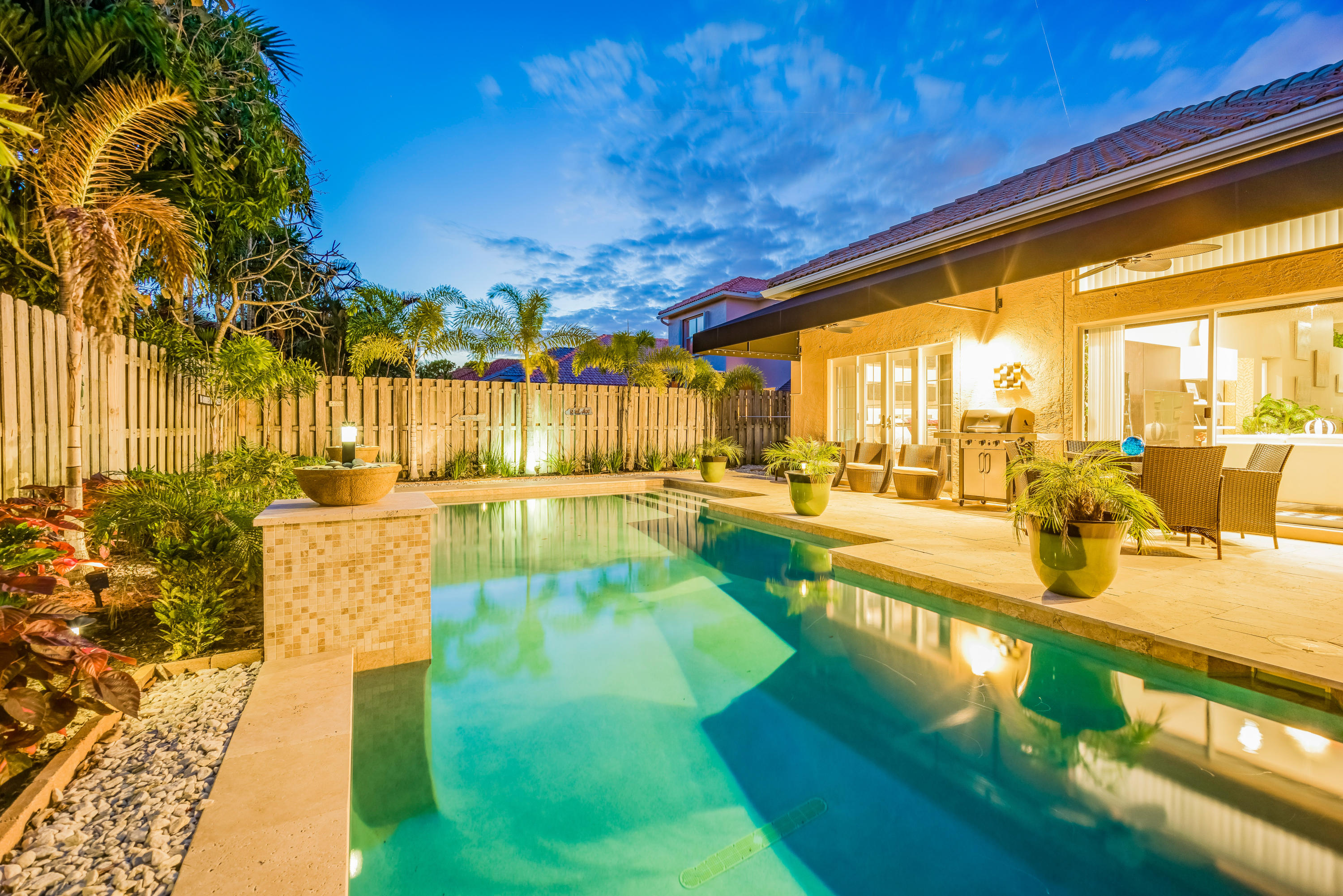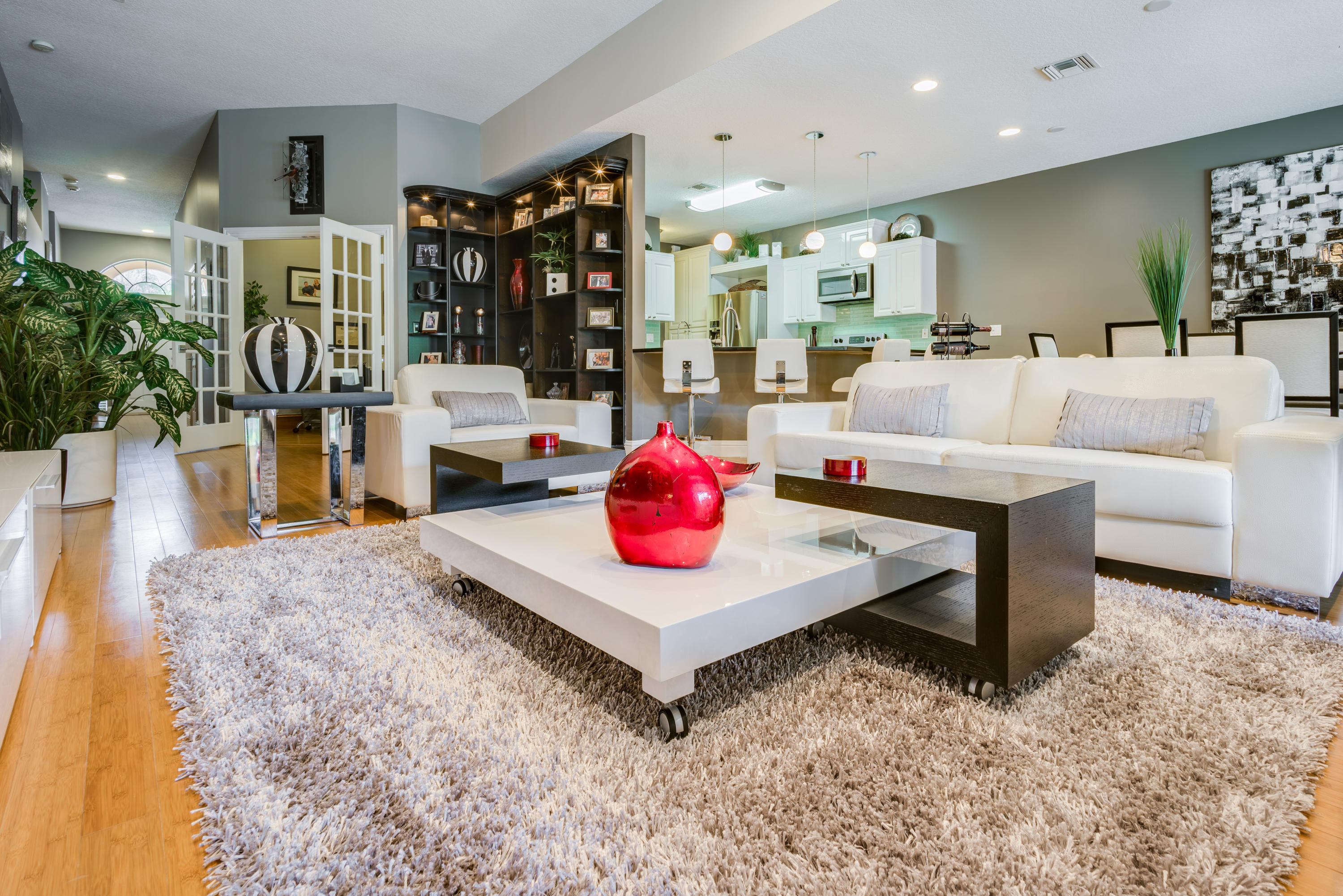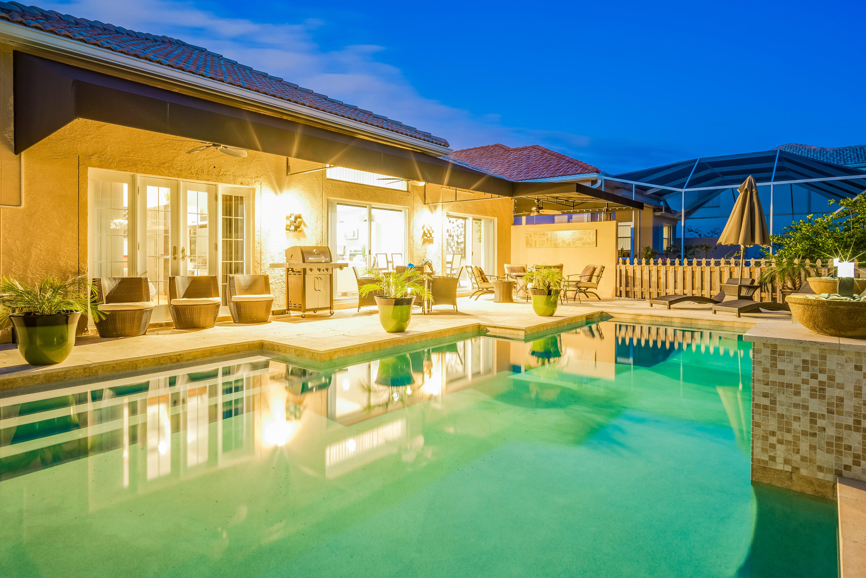 Extraordinary resort-style outdoor living from this luxuriously upgraded, 3BR/2BA + den home located in the private, gated enclave of Catalina in the Lakes of Laguna community. This wide-open home has many desirable features like bamboo flooring throughout main living area, den, and master bedroom, large windows, sliding glass doors, and glass-paned French doors, a chef's kitchen with white cabinets, newer stainless steel appliances, and black granite countertops, newer washer & dryer, an office area with access from the living room and kitchen, and a home security system. The 2015 fully renovated patio has a pool, Travertine marble pool deck, and Sunbrella awning. All furniture and built-ins in the living room (excluding the TV) are included.