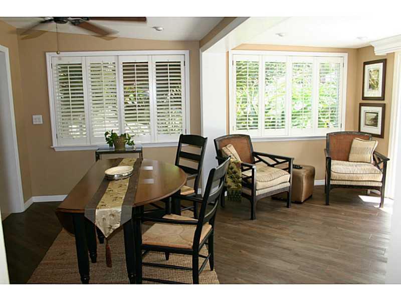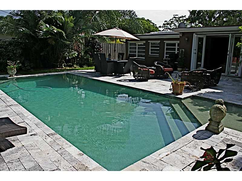 A beautiful courtyard entrance to this 2/2 pool home with an extra room off the 2nd bedroom and a one car garage in the heart of Poinsettia Heights. This home features a rectangular designer pool with Italian tumbled marble decking area for entertaining and lush tropical landscaping surrounding for plenty of privacy. Newer air conditioning, updated kitchen and bath, recess lighting. living area over looking beautiful backyard pool area. Hurricane shutters and panels for all openings.