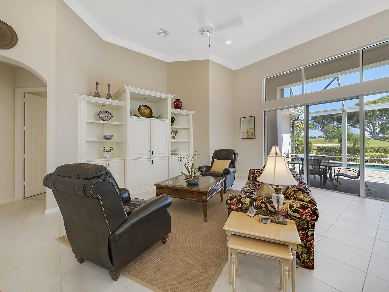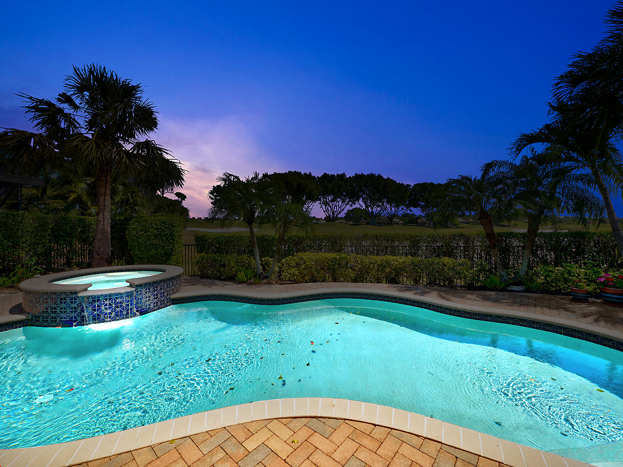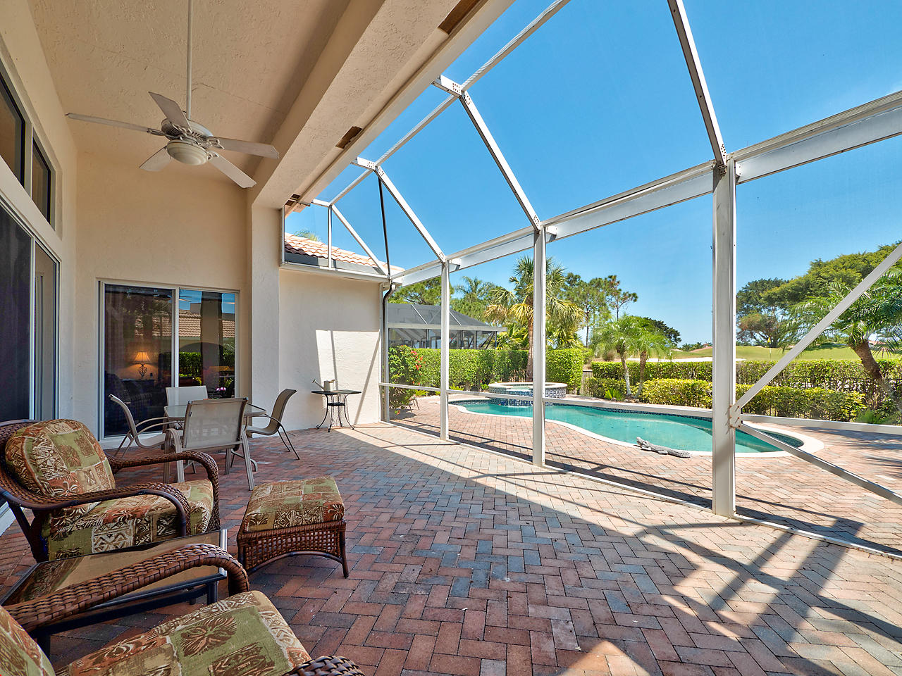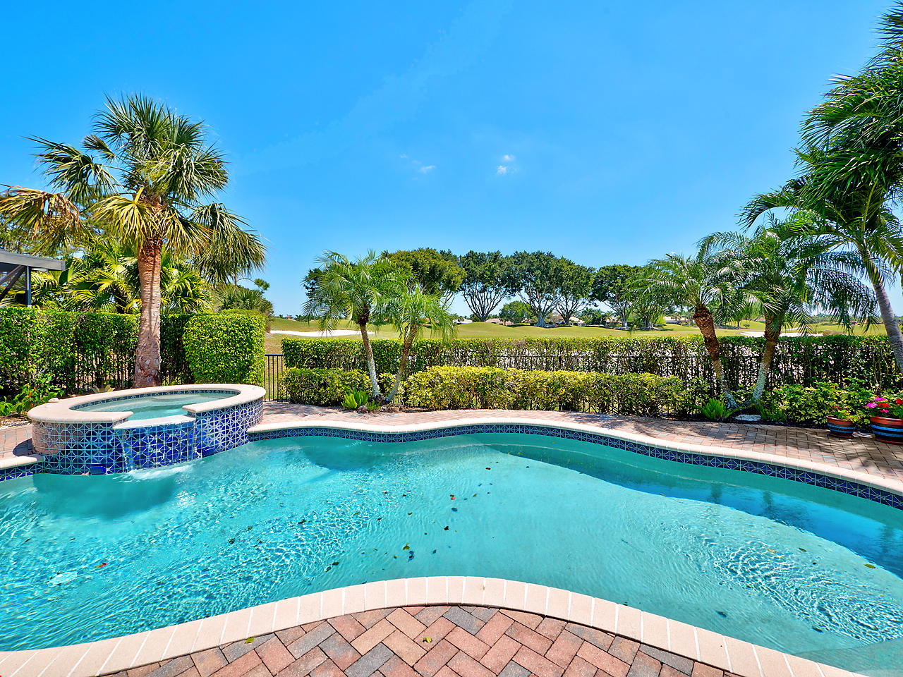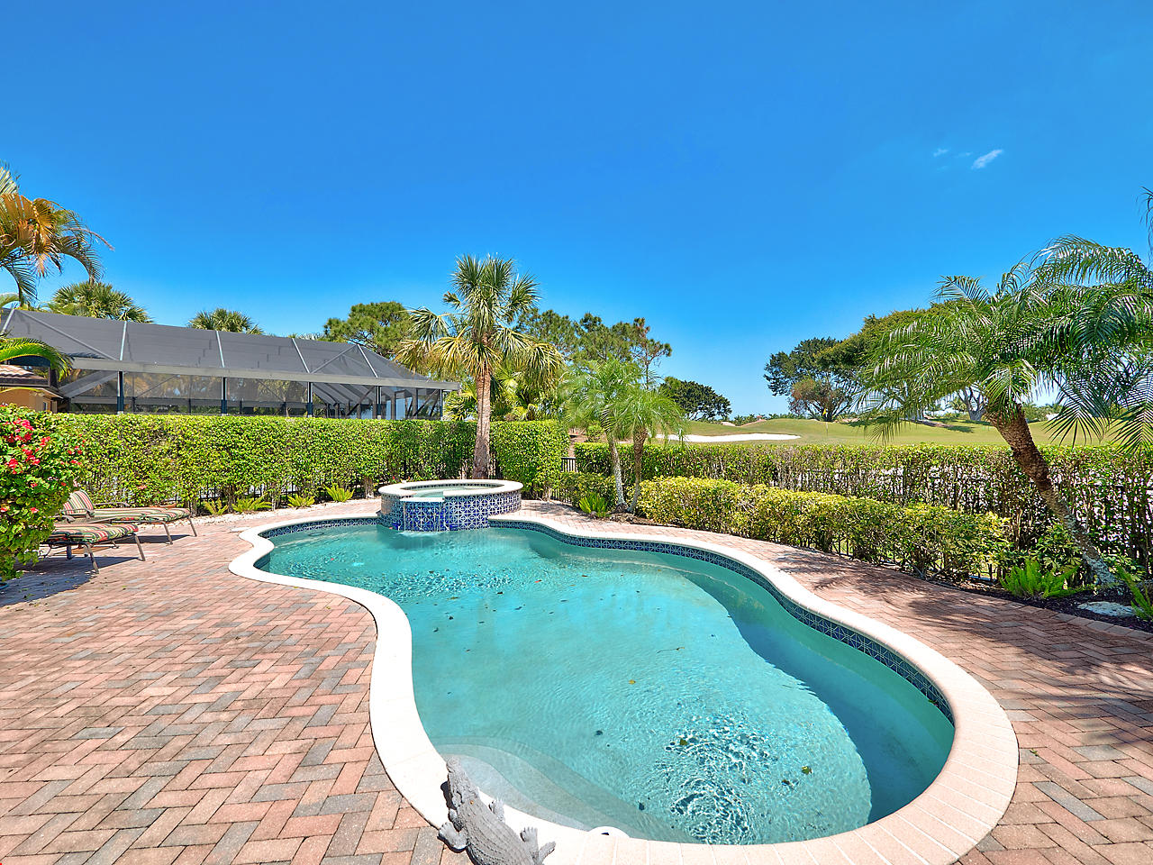Priced for Immediate Sale! Situated on the 16th Green of The Legend Course, this Home has it all! Don't miss out. Fabulous Outdoor Entertainment Area with Screened and Covered Patio and Open Pool Area with Spa and Water View. The Kitchen, with almost New Stainless Appliances, Granite Counters & Backsplash open to the Family Room with Both Overlooking the Pool and Golf Course. The Master has Double Coiffured Ceiling with Crown Molding and Sliders to the Pool/Patio Area, His & Her Closets and the Master Bath has Corner Roman Tub and Separate Shower with Glass Doors and His and Her Sinks. There are Formal Living and Dining Rooms with Garden Views. Two Guest Suites are in the front of the Home, One with a Private Bath and One with an Atrium. The Den includes Built-in Desk & Cabinets.