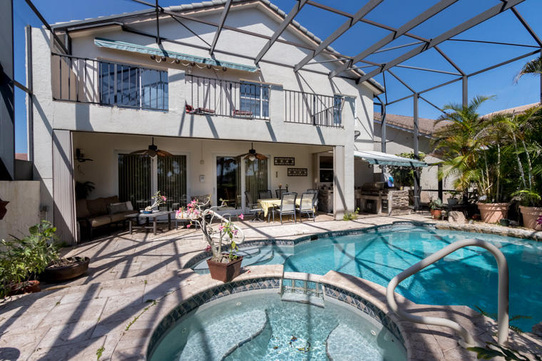 Spectacular lakefront home! Large spacious layout with 4 bedrooms and 2.5 bathrooms. All bedrooms are on the second level, and master bedroom is oversized with two custom walk-in closets and two separate master bathrooms. Off the master bedroom there is a huge balcony with relaxing views of the lake. The backyard has a pool/spa, sitting area and outdoor bar with grill. Great community with amenities and low HOA fees. Call for a showing.
