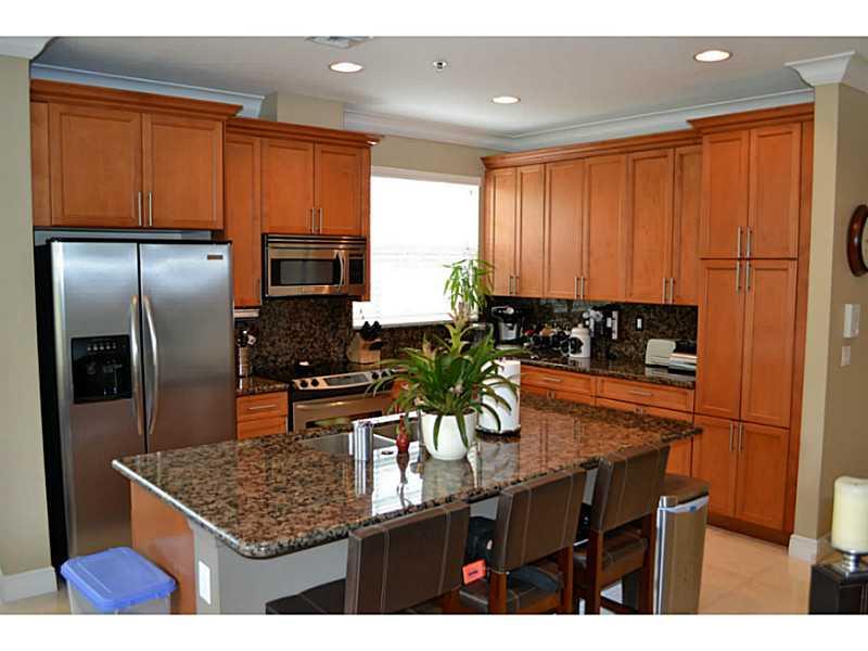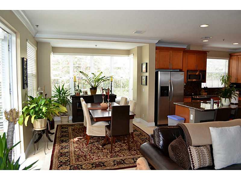 Beautifully appointed, very light corner unit with elevator, small garden and upstairs patio. Upgraded bathrooms, impact windows and doors, crown molding,attached 2 car garage, open kitchen and living area, great location.
