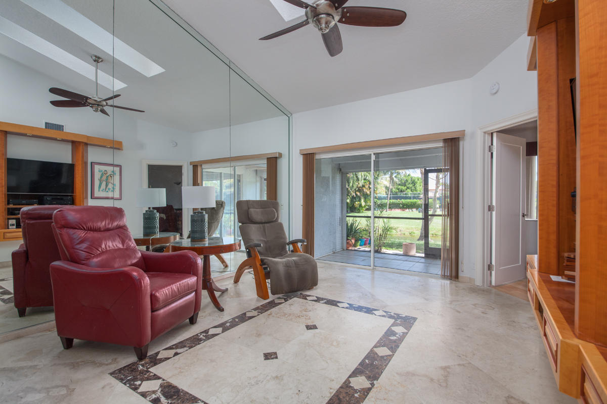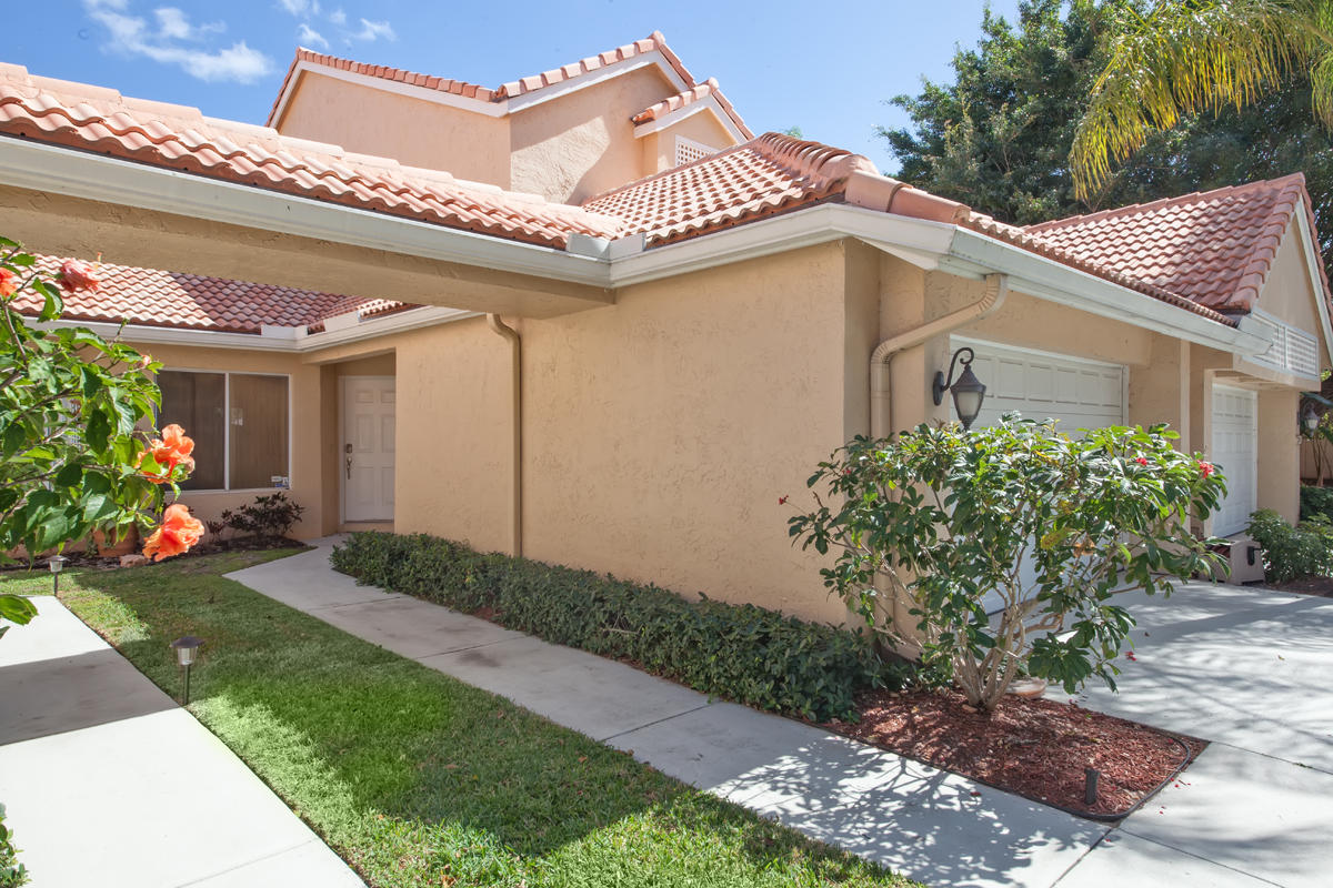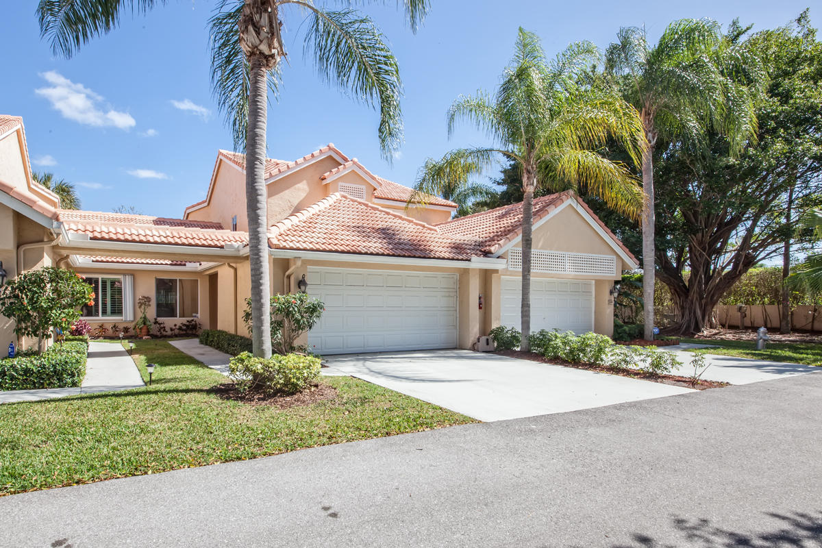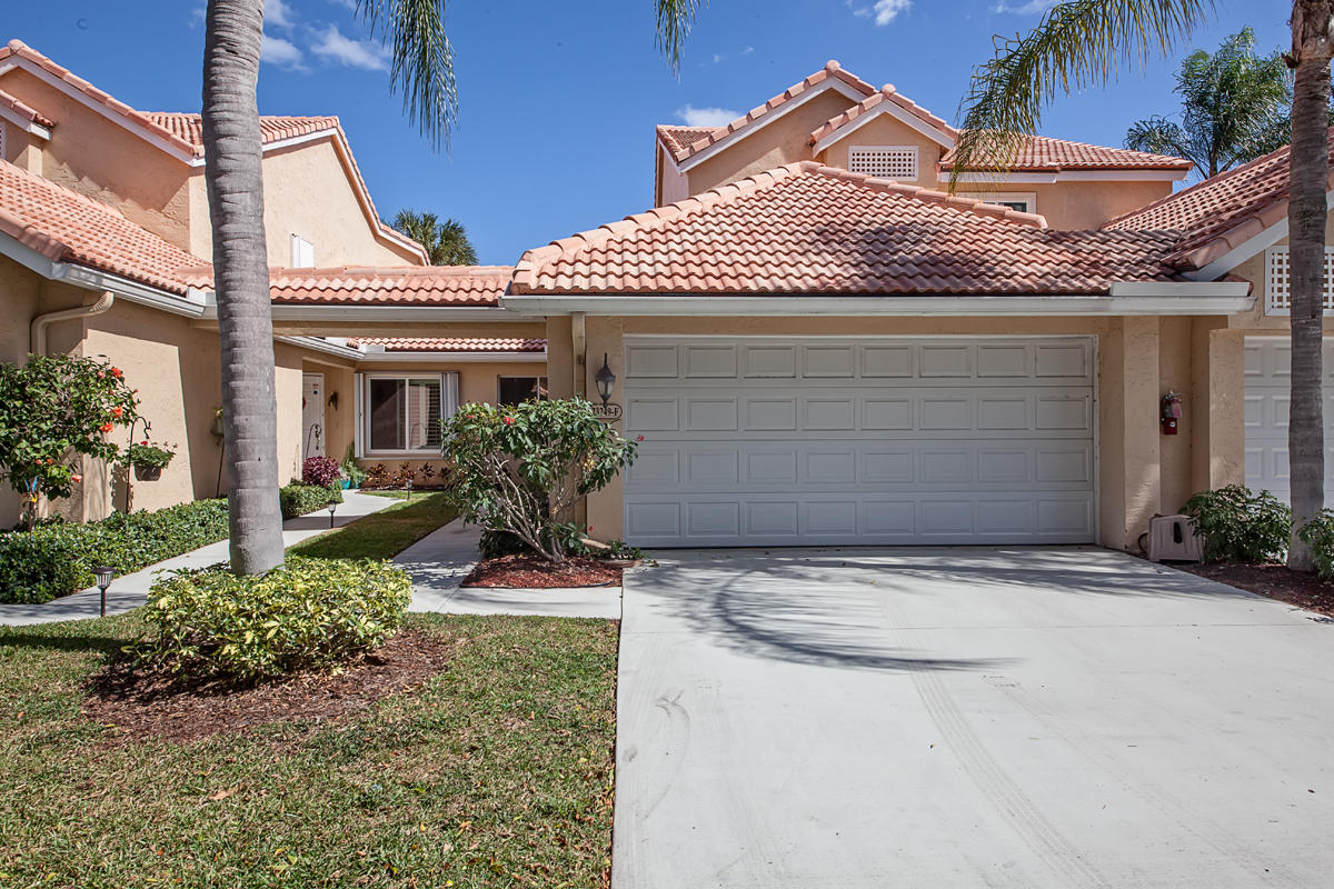 Absolutely stunning Townhome located in the outstanding convenient Boca Delmar area. This move-in ready home features many upscale upgrades. Soaring cathedral ceilings give the interior a dramatic look, while the skylights add natural light to the living spaces. Custom inlaid Saturnia marble flooring runs throughout the kitchen, dining room and living room, enhancing the open concept. The living room has a custom built-in entertainment center and built-in desk area. Sliding glass doors open to a screened lanai. The first floor master suite has 5-inch Maple plank hardwood flooring, attached master bath with walk-in shower, and walk-in closet with built-in dresser made of Cherry wood. The designer kitchen is made of custom-built Cherry cabinetry with two built-in pantry cabinets