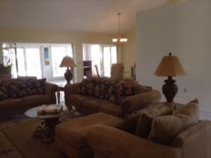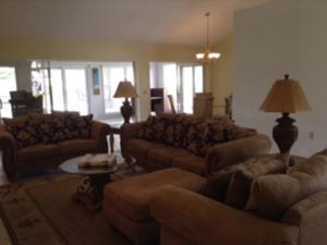 Lovely Bear Island home on the golf course with lake views on the Links course. Kitchen has been renovated--tile throughout--enclosed lanai with an additional porch with a whitewashed wood ceiling. Extra large backyard with stone patio. Lots of room for a pool--Impact Windows and Doors and New Roof in 2009. Wonderful private location with a long driveway with a side load garage.This community is close to airport, shopping,restaurants and beach.