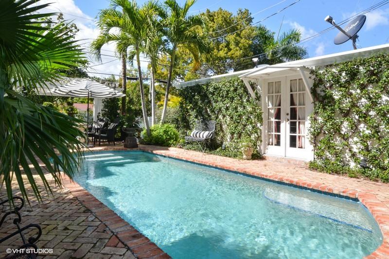 Sunshine Park Retreat! This wonderfully maintained 2 bedroom, 1 bath home with updated cottage has lush landscaping, pool and is gracefully designed. The curved brick paver leads to a raised entry with glass garden door and opens to a bright and cheery library with hardwood floors that carry throughout the residence. The living room has a fireplace mantel, crown molding, recessed lighting and an arched opening to the dining room with French doors to the exterior. The bright chef's kitchen has an island, custom white cabinets with additional breakfast area and access to the patio, pool & pergola. Two bedrooms in the main house with a fresh bath are enhanced by the space in the Cottage with vaulted ceiling & updated bath. Lush and lovely landscaping, private patios for perfect entertaining!