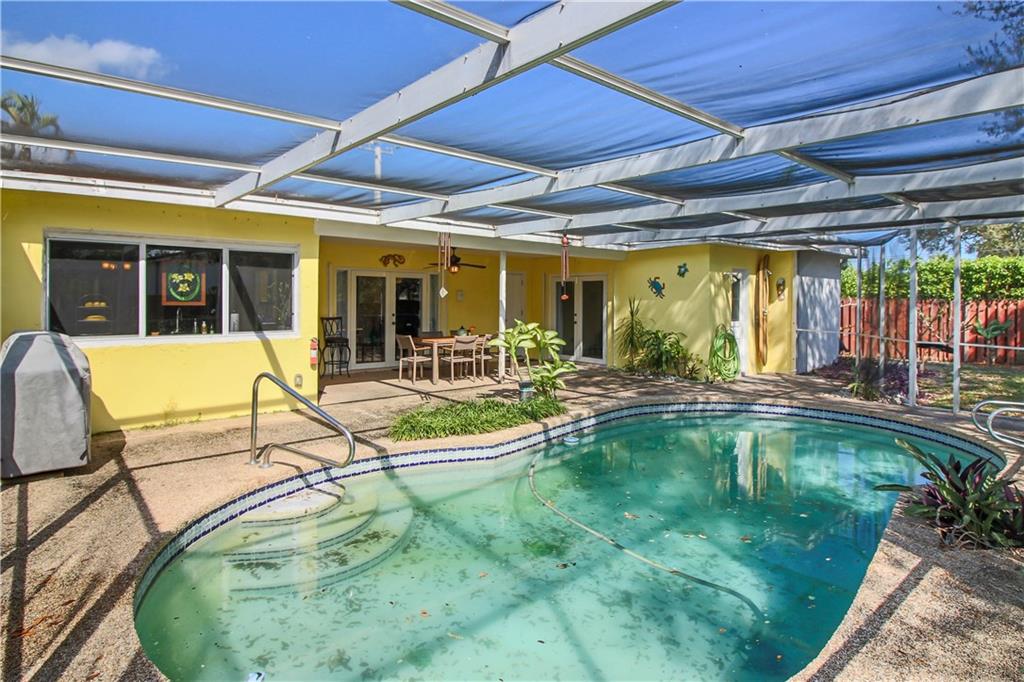 Great 3 bedroom/ 2 bath corner lot pool home in Hollywood Hills. This lovely home feature Remodeled kitchen w/ granite counters, Polished terrazzo floors with French doors through kitchen, living room and master bedroom also great size patio area with outdoor shower making this home perfect for entertaining. Corner lot. Beautiful tree lined street. 1 car garage... Circle driveway. Great location. The home shows great! Near shops, restaurants and highways.