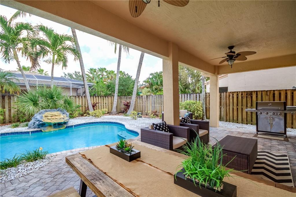 Beautiful 4 Bdrm 3 Bath home in prestigious Poinciana Parc. One full bdrm & bath down stairs, upgraded kitchen, large master bdrm with tray ceiling and remodeled master bath & closets, newly tiled first floor, carpeted second floor, hurricane shutters, huge covered patio($13,000 builders upgrade), salt pool and heated spa, lushly landscaped and fully fenced in backyard. Great pool and patio area to entertain. 2 A/C units, Excellent Davie schools and security of a 24 hr manned guard gate.