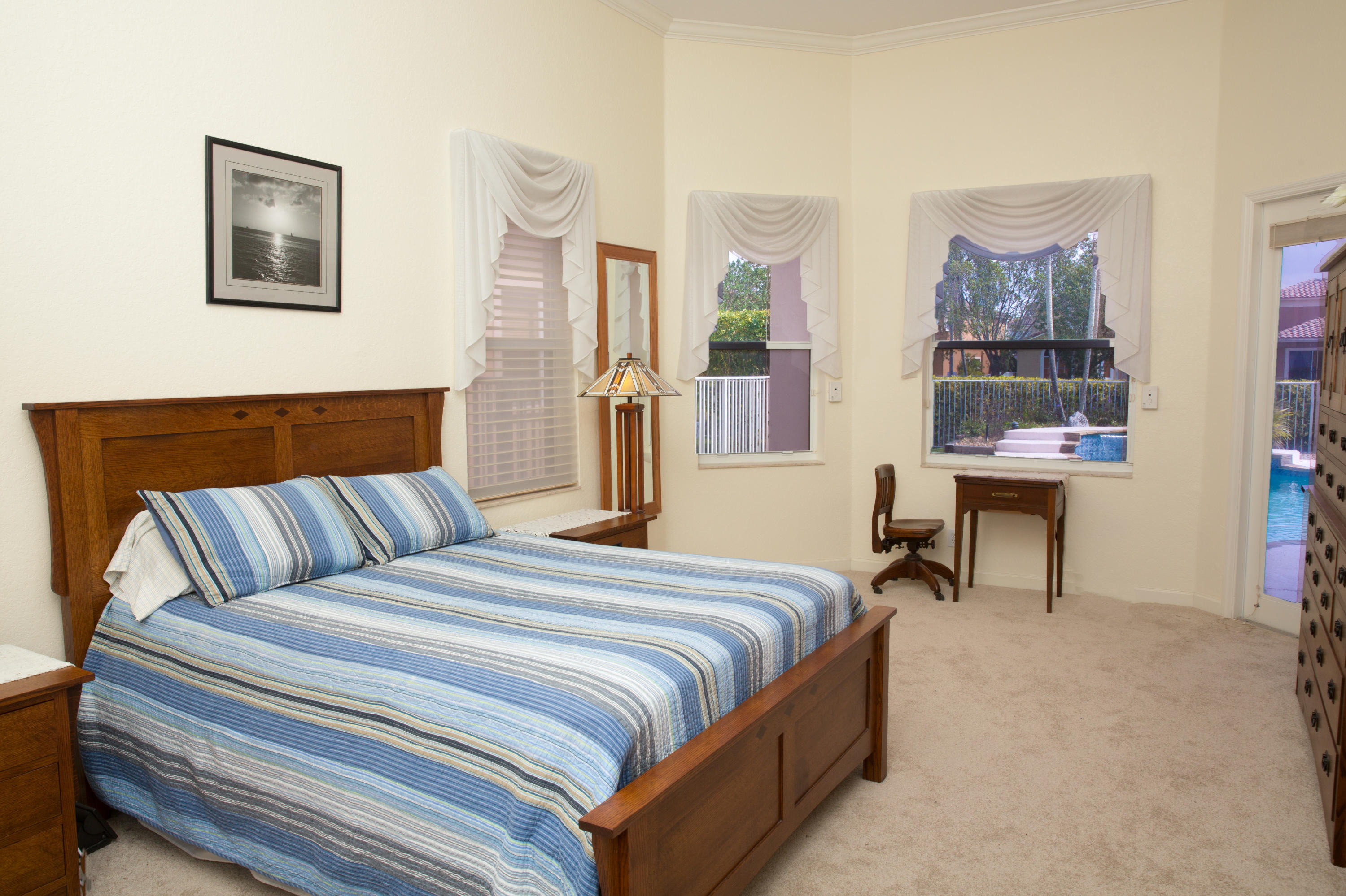 Gated & Prestigious 1 Story Pool Home with Water view in BAY POINTE . Large Family Room, Triple-Split Floor Plan, Private 7-foot deep, Salt Water pool with Jacuzzi, lake View, Large Patio with Fenced Yard, 3-Bath, 3-Car Garage, Spacious & bright, High efficiency AC, 12' High Ceilings,Crown Molding, Built in Computer Station. Eat-In Gourmet Kitchen with 42' Cabinets, Breakfast nook, Roman tub in Master bathroom and surround sound. Great School District