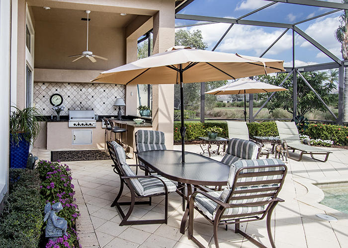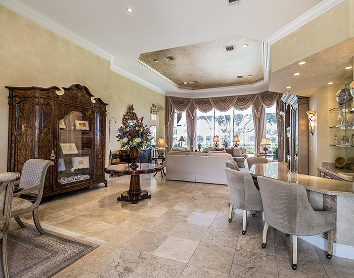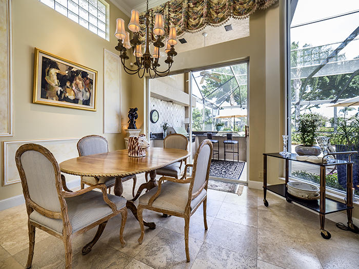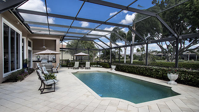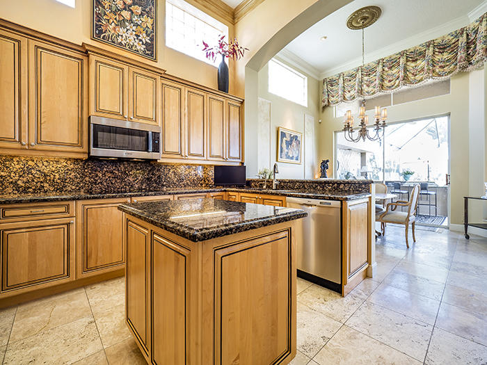 Model-perfect, stately great room home with ''wow-factor!'' This 3BR/3BA+Den boasts an open plan, soaring ceilings, extensive moldings, elegant marble floors (18-inch Saturnia), and designer upgrades throughout. From the moment you enter this lovely home, you will notice its beautiful setting on the golf course, as well as the large screened pool adorned with lush landscaping. With one of the largest lots in Monte Verde, this home feels spacious, highly upgraded and immaculately cared for. Two AC units are five years old, Hunter Douglas shades or shutters on almost all windows, Central Vac, private golf cart path to the club, outdoor summer kitchen with gas grill, new gas heater for the 15'x30' screened pool. New Bosch convection microwave, double convection ovens, new LG Washer and drye