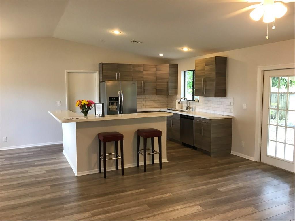 COMPLETELY REMODELED 3 BEDROOM, 2 BATH HOME WITH VAULTED CEILINGS LOCATED AT THE END OF A QUIET STREET. NEWER A/C (2010), PRIVATE FENCED BACK YARD, BEAUTIFUL WOOD LAMINATE FLOORING THROUGHOUT LIVING AREAS, TILE IN BATHROOMS, REMODELED KITCHEN WITH STAINLESS STEEL APPLIANCES, QUARTZ COUNTERTOPS, AND SOFT CLOSE CABINETS AND DRAWERS, LARGE MASTER CLOSET WITH BARN DOOR, STORAGE SHED IN THE BACKYARD, COVERED PATIO WITH FRENCH DOORS LEADING OUT FROM THE LIVING ROOM.
