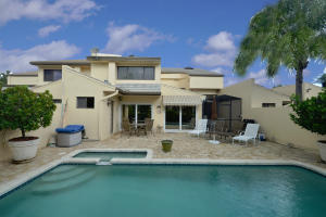 Beautiful 4 bedroom, 4.5 bath two story home with master on the main level. Features include wood flooring in living room and dining room and an updated kitchen with stainless steel appliances, granite and lighting. Other features include a new pool heater, new carpeting in bedrooms (and new lighting and painting in master bedroom) and designer built-ins. Private pool and newly paved brick patio overlook a lake. This meticulous home is in move in condition. Wonderful for everyday living and entertaining. Owner would consider a swap within Boca West.