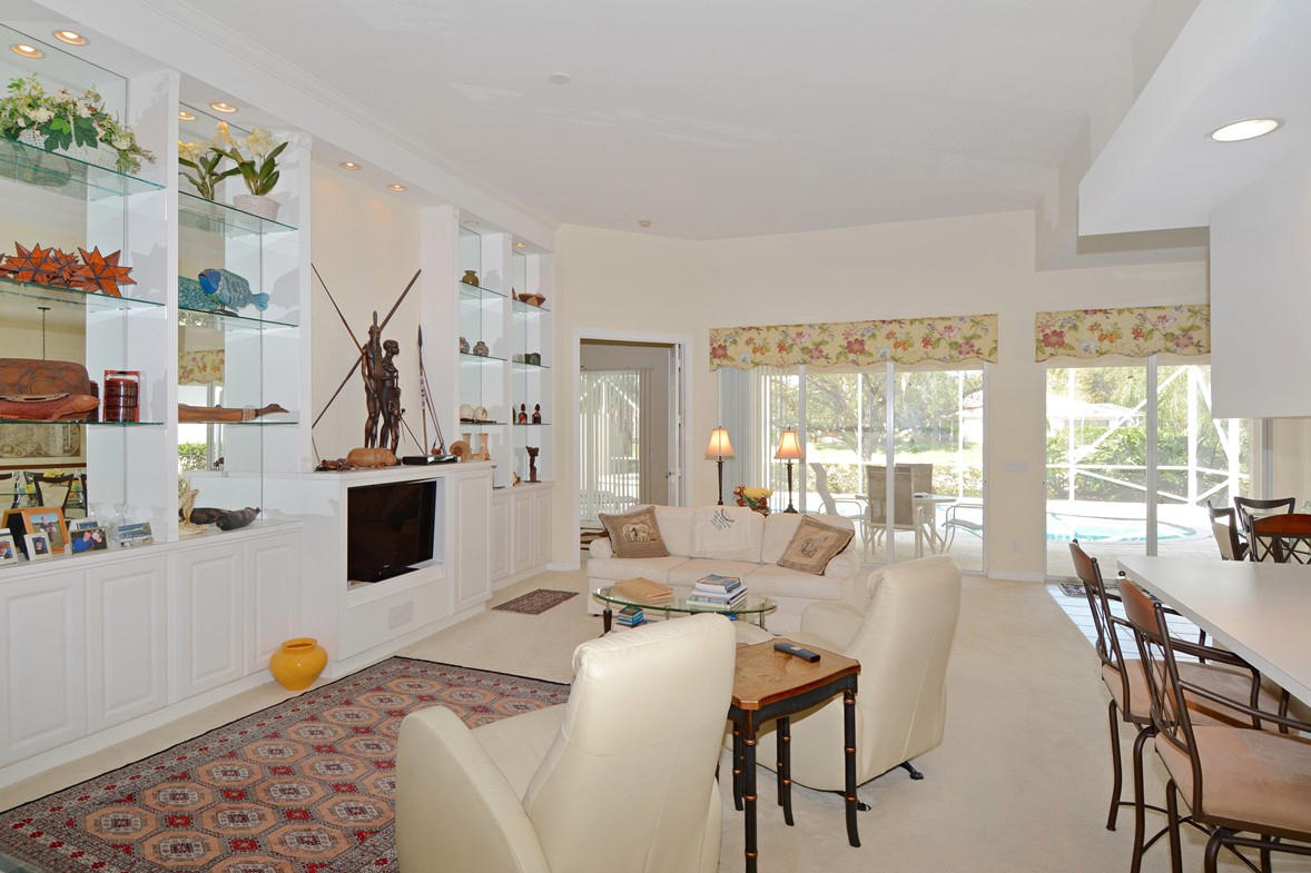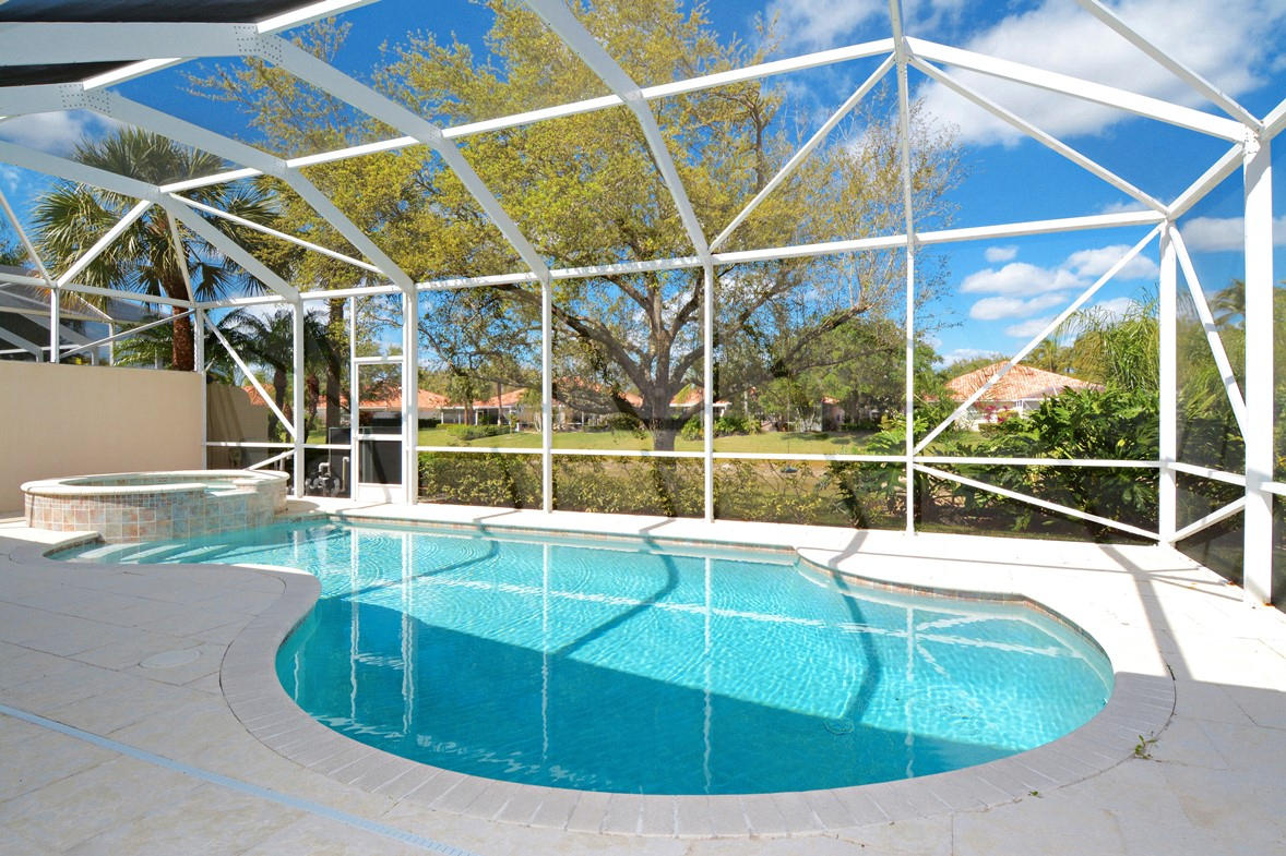 Immaculate, Lakeside Oakmont with a Breathtaking Custom 30 Foot Heated Swimming Pool & Spa! In the Incomparable 24 Hour Gated Community of RiverWalk! 15-20 minutes from everything that makes Palm Beach County a Great Place to Live including the Ocean! The Covered Screened Entry opens to the Tile Foyer that leads to the Double Door Entry Carpeted Den/Office with Clerestory Windows & the Carpeted Great Room with a 12 foot Ceiling & a Custom Full Wall Mirrored Entertainment Center that opens to the Tile Dining Area with Sliding Glass Doors to a Secluded Patio, Perfect For Barbequing plus 18 feet of Sliding Glass Doors that lead to the 22 foot Lanai that opens to the Caged Screened Pool that meets the latest Codes with Heavy Gauge Supports & the Pool has a Raised Spa & Travertine Tile Deck!