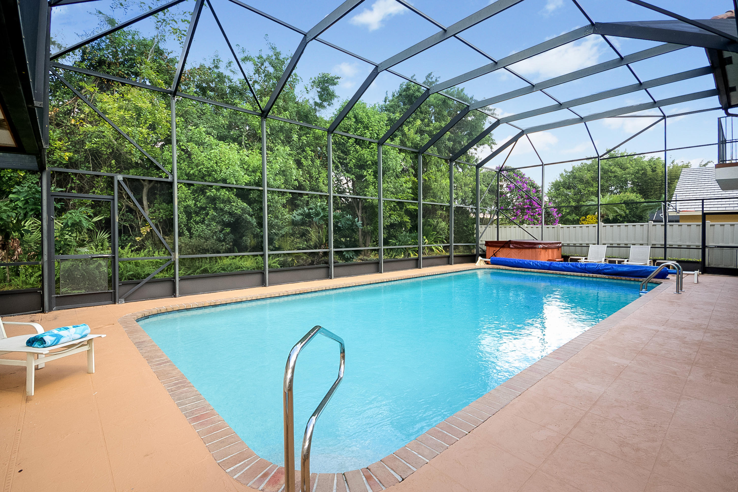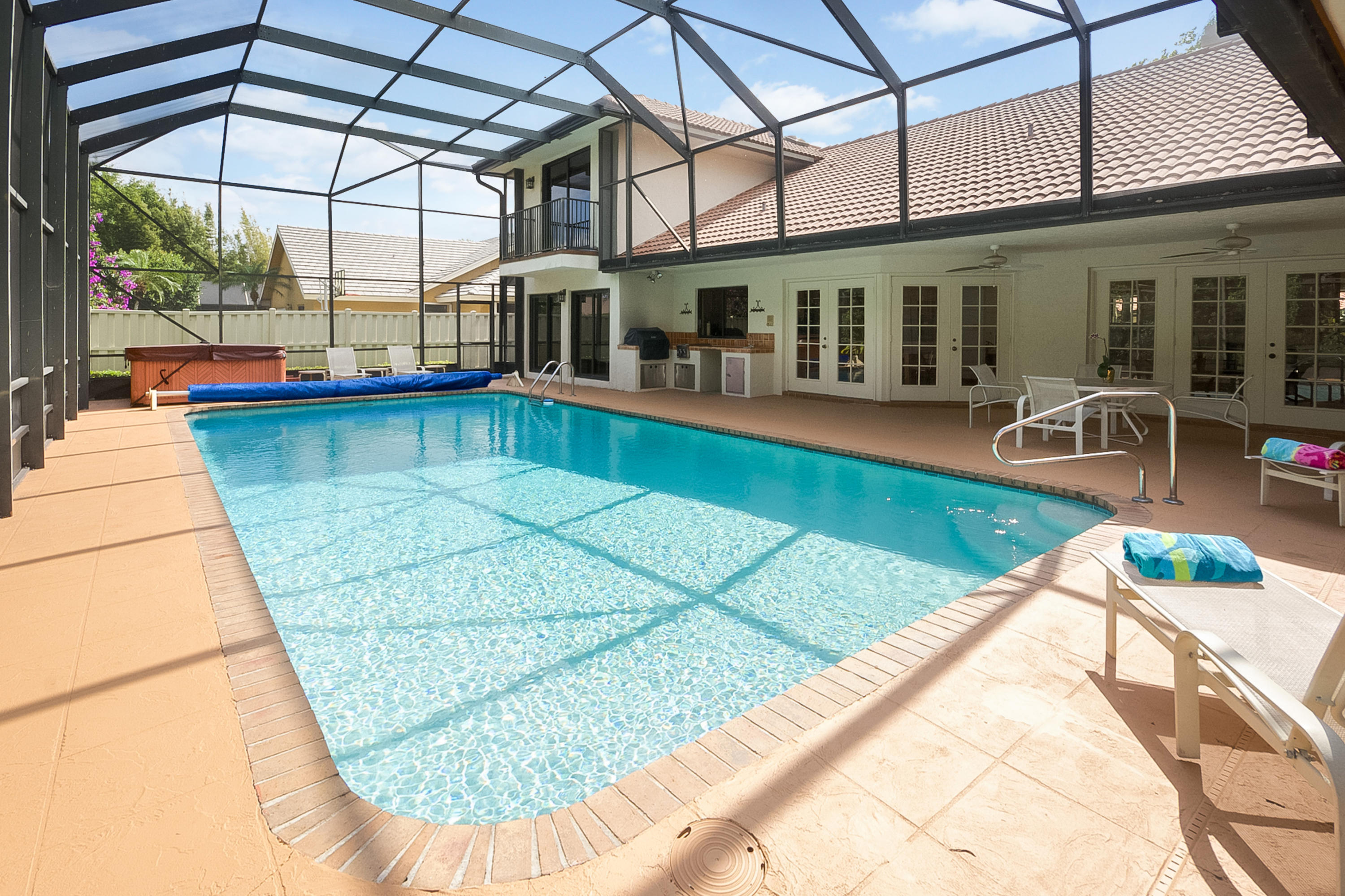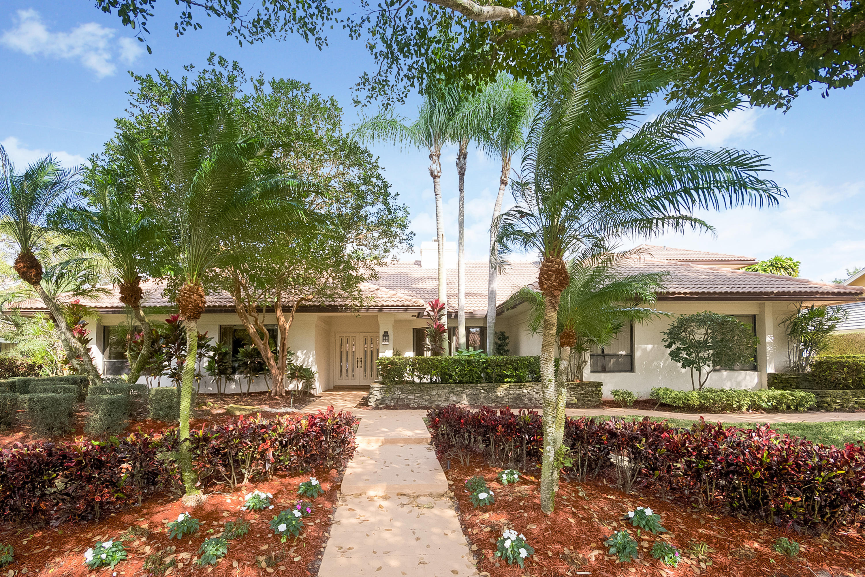 A beautiful 6 bedroom, 5 bath pool home on a secluded 1/3 acre private lot, features volume ceilings, hardwood floors, French doors, summer kitchen, fireplace and guest wing with private entry. Spa-like master bath features a steam shower & relaxing sauna. Enormous pool with new pool heater and screen enclosed patio offers fabulous entertainment space. Woodfield Hunt Club is centrally located in Boca Raton, near the best public and private schools, Town Center Mall and easy access to FL turnpike and I-95.