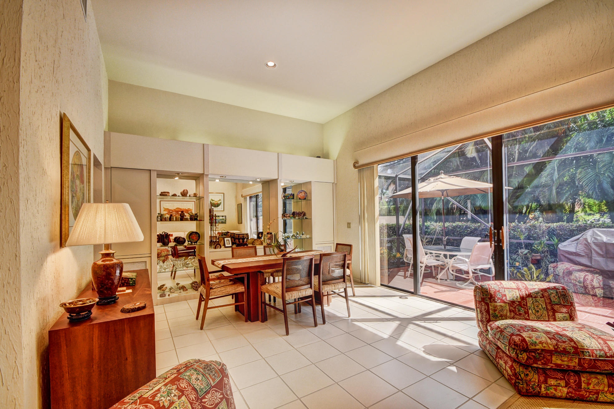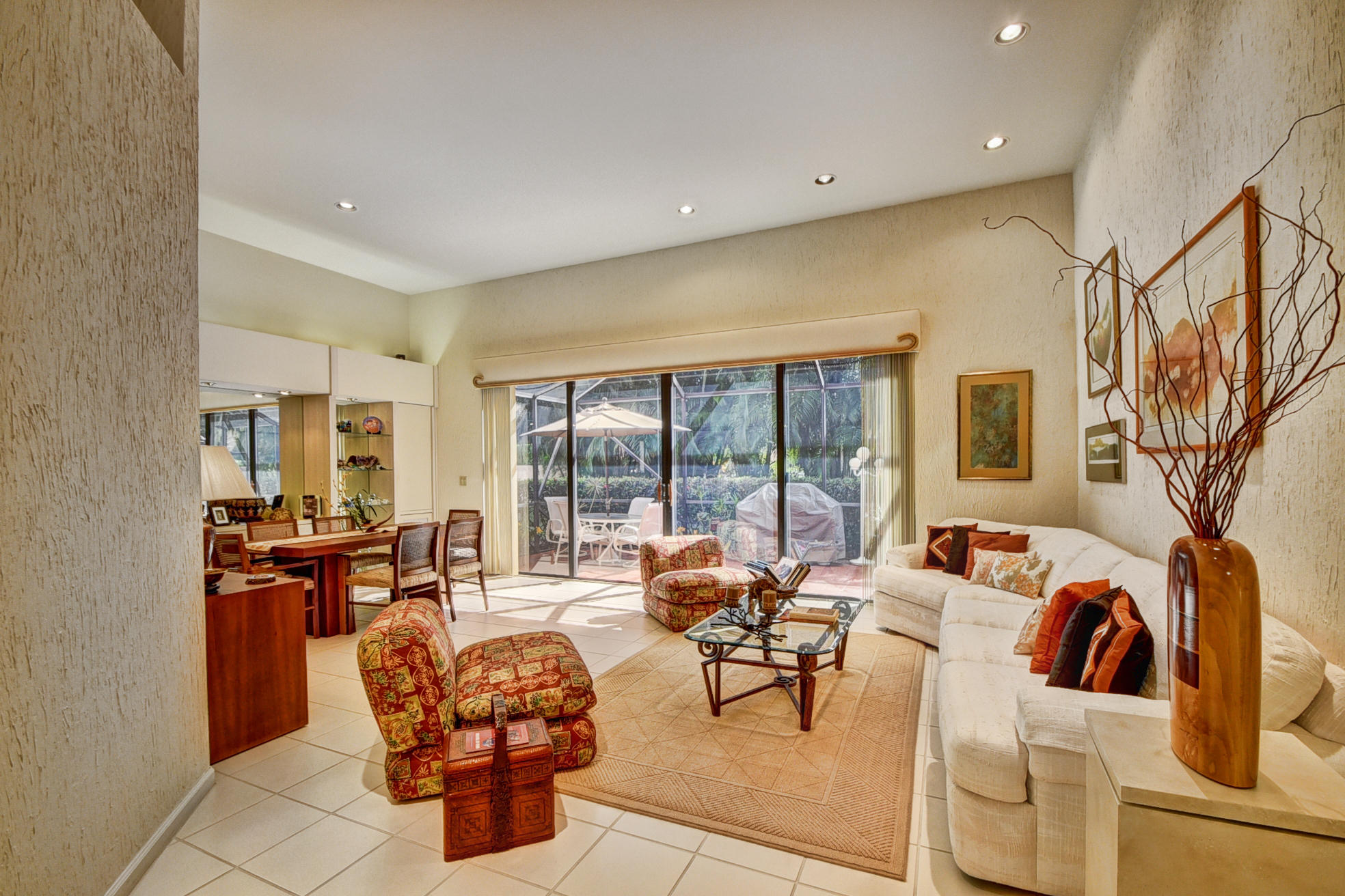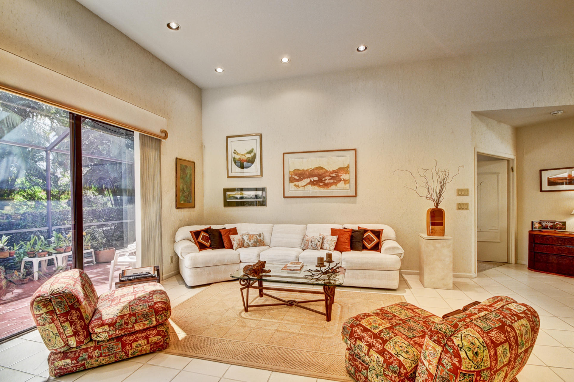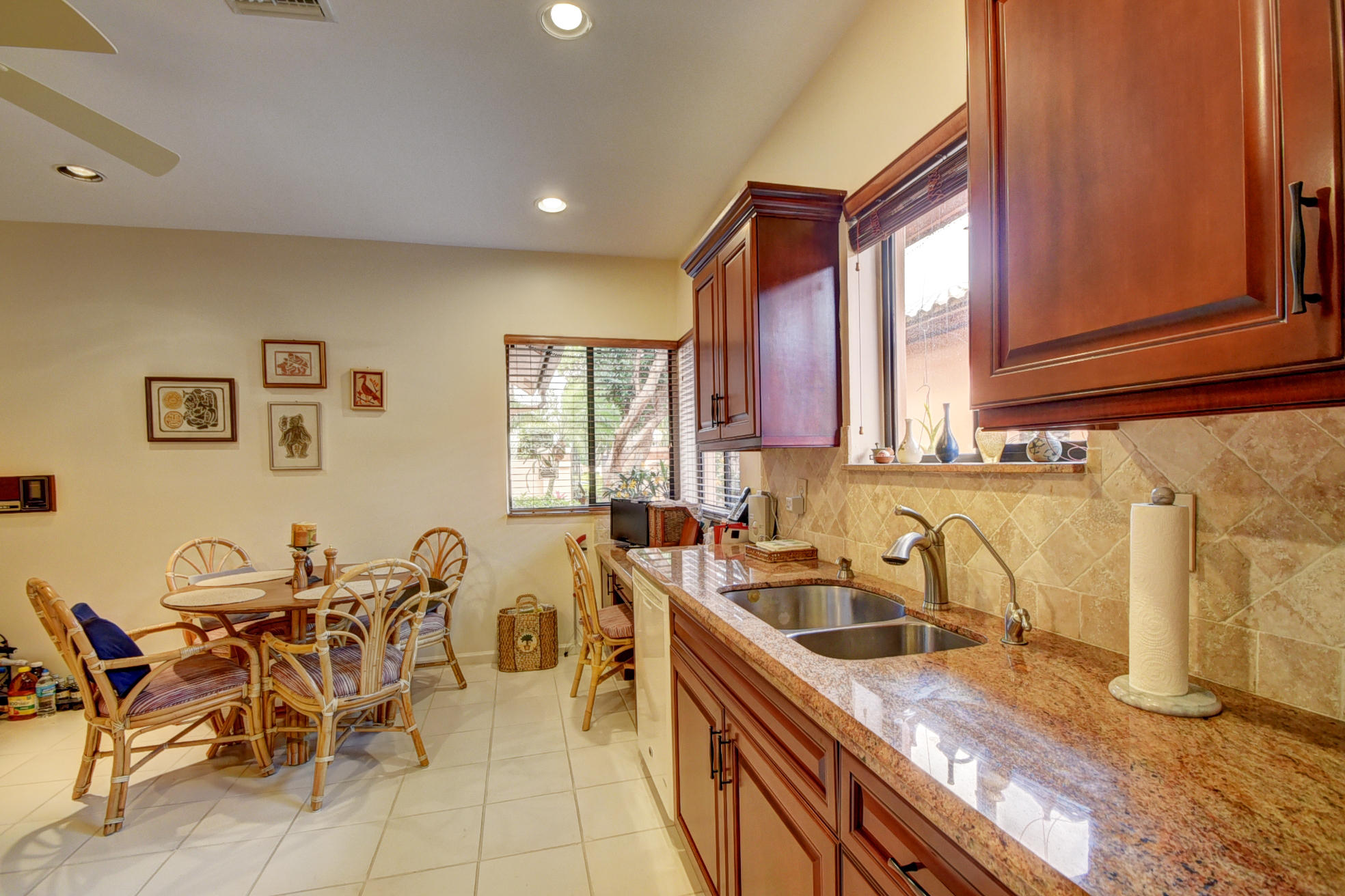 Beautiful Mediterranean fully updated one story single family home in prestigious Villa Flora section of Boca Pointe. Spacious & bright floor plan with high ceilings! Former model home, very desirable''Capri'' model has 3 bedrooms, all w/nice sized closets & 2 baths. Fabulous foyer entrance w/sky light. Neutral tile through living area & new high end carpet in bedrooms. New Roof!!(1 Yr old)/New hot water heater! Updated, oversize kitchen w/granite counter tops, wood cabinets, tumbled marble backsplash, custom pull out draws & desk area. Huge master bed/closet w/custom shelving. Large screened in patio. Most furniture negotiable. Accordian Shutters.All ages/pet friendly.Man Gated. Boca Pointe where membership is NOT mandatory!OPTIONAL golf/tennis/gym & social memberships available.
