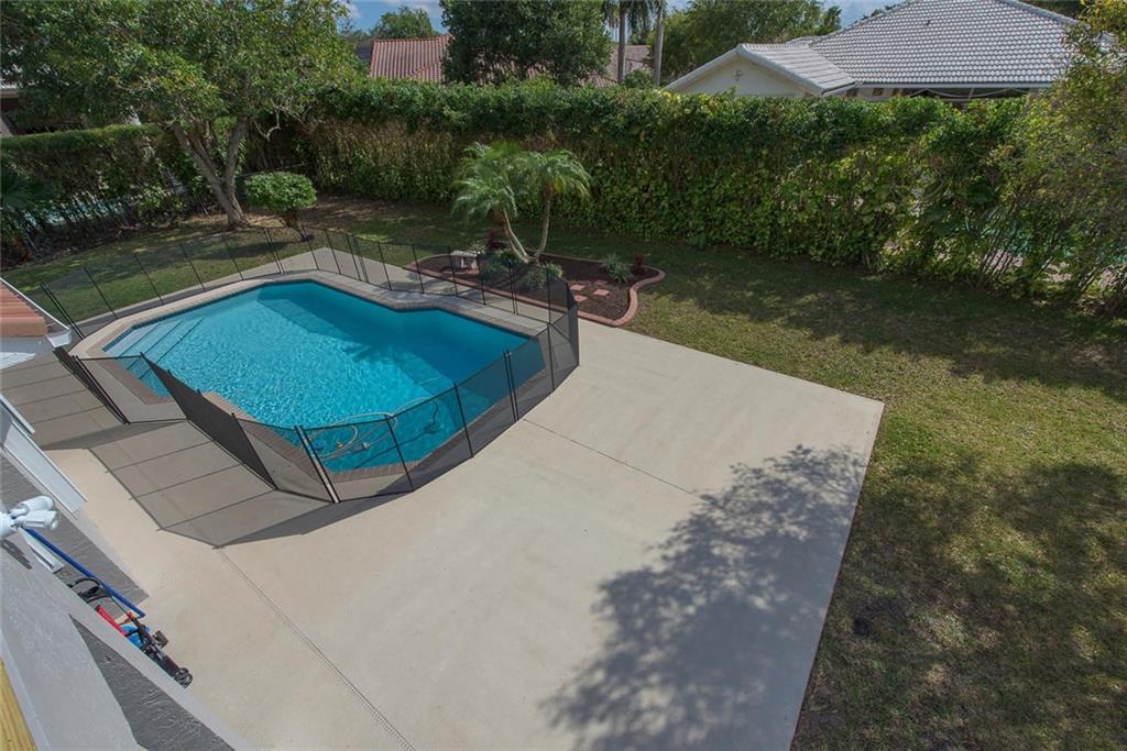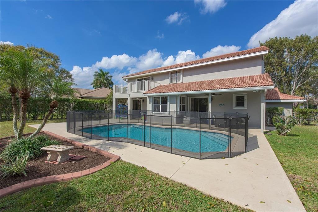 Wow - excellent floor plan! Light, bright & meticulously maintained 5 bedroom + den home. Outstanding upgrades & features include: marble floors on entire 1st level & wood throughout 2nd level; beautiful kitchen with wood cabinets, granite countertops & stainless steel appliances; guest bedroom, full cabana bathroom & den/office on 1st floor; huge master suite w/open balcony on 2nd floor; walk-in closets; accordion hurricane shutters; circular driveway; HUGE pool, patio & fence-enclosed, private yard!