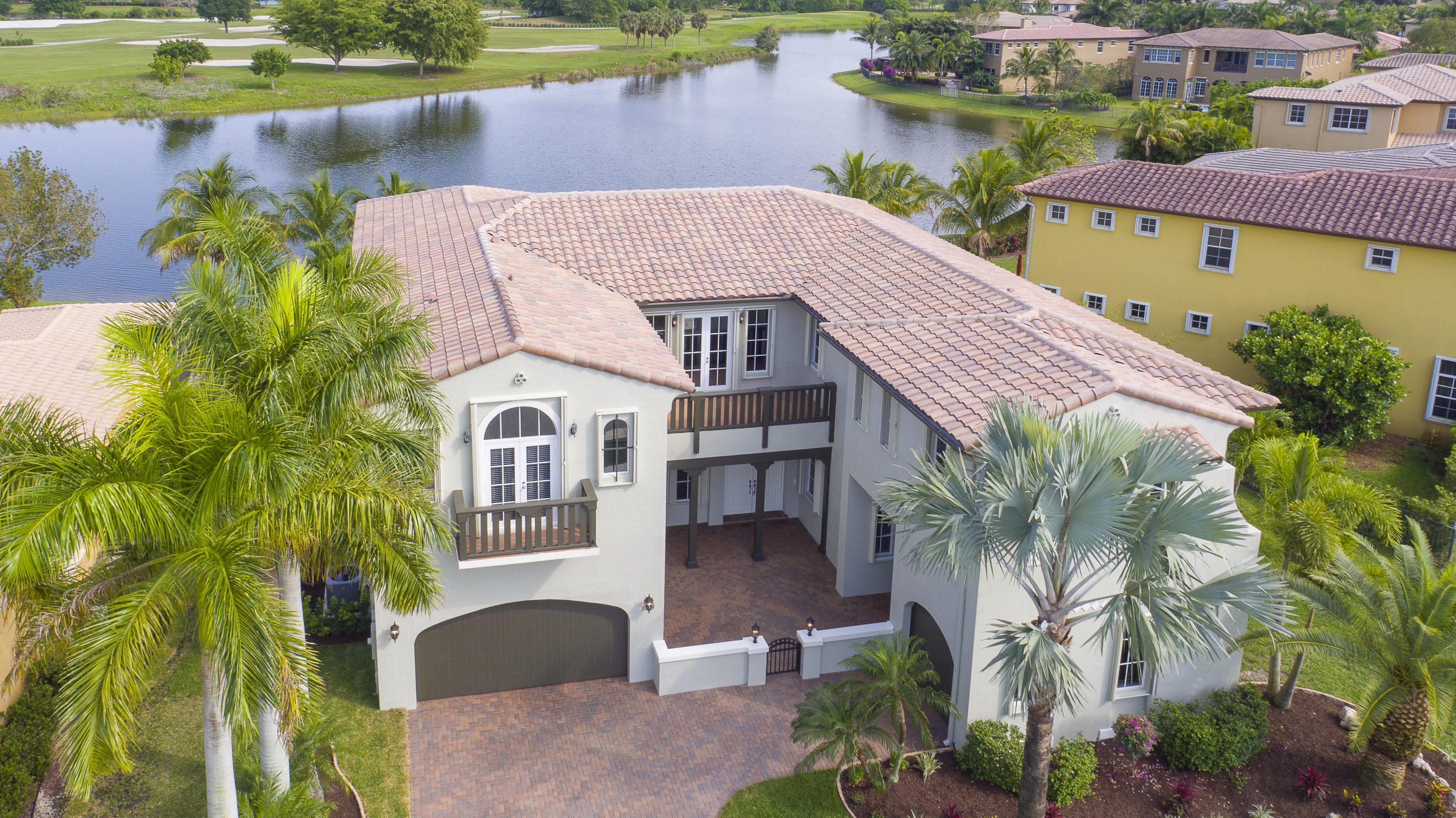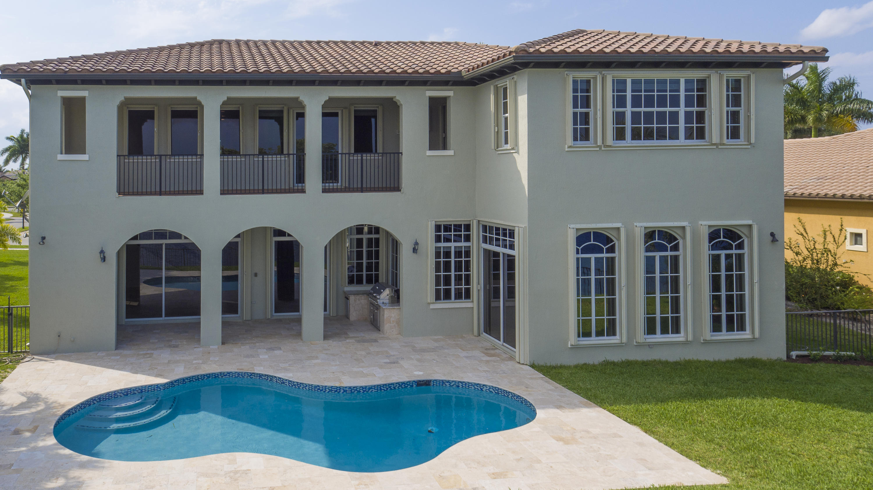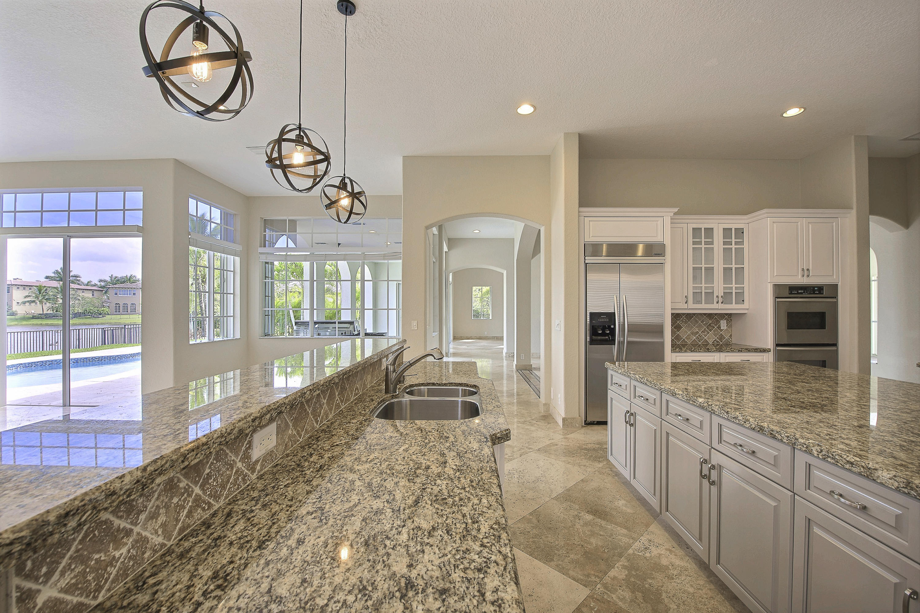 Amazing Modern design with 300 ft of endless water & golf views. Nestled in a cul de sac, this serene pie shaped expansive lot has a private travertine pool deck with great sun and glass tile pool, new 48'' summer kitchen shaded by the enormous covered lanai, new rheem a/c, new flooring, accordian shutters all around and has been completely renovated to new condition.