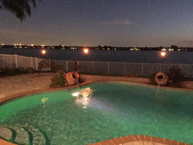 LOCATION,LOCATION, LOCATION! Rarely available 180-degree SWEEPING WIDE WATER VIEWS THAT WON'T DISAPPOINT! Premium Lake Lot! The only 'point' property listed right now that offers very wide 180-degree sweeping Lake Riviera views! Very large granite kitchen with long counters, a walk-in pantry & an island with cabinets for even more storage! Wine Cellar, too! The laundry room has cabinets above the washer/dryer PLUS a convenient wash tub sink! Expansive, unobstructed waterviews dance just outside the kitchen, breakfast area, family room, an upstairs bedroom & the master bedroom windows. A pavered patio surrounds a free-form pool with 2 water-features. There is ample room for seating in several areas and there is a retractable awning above the outdoor eating area; & a yard at the lake's edg