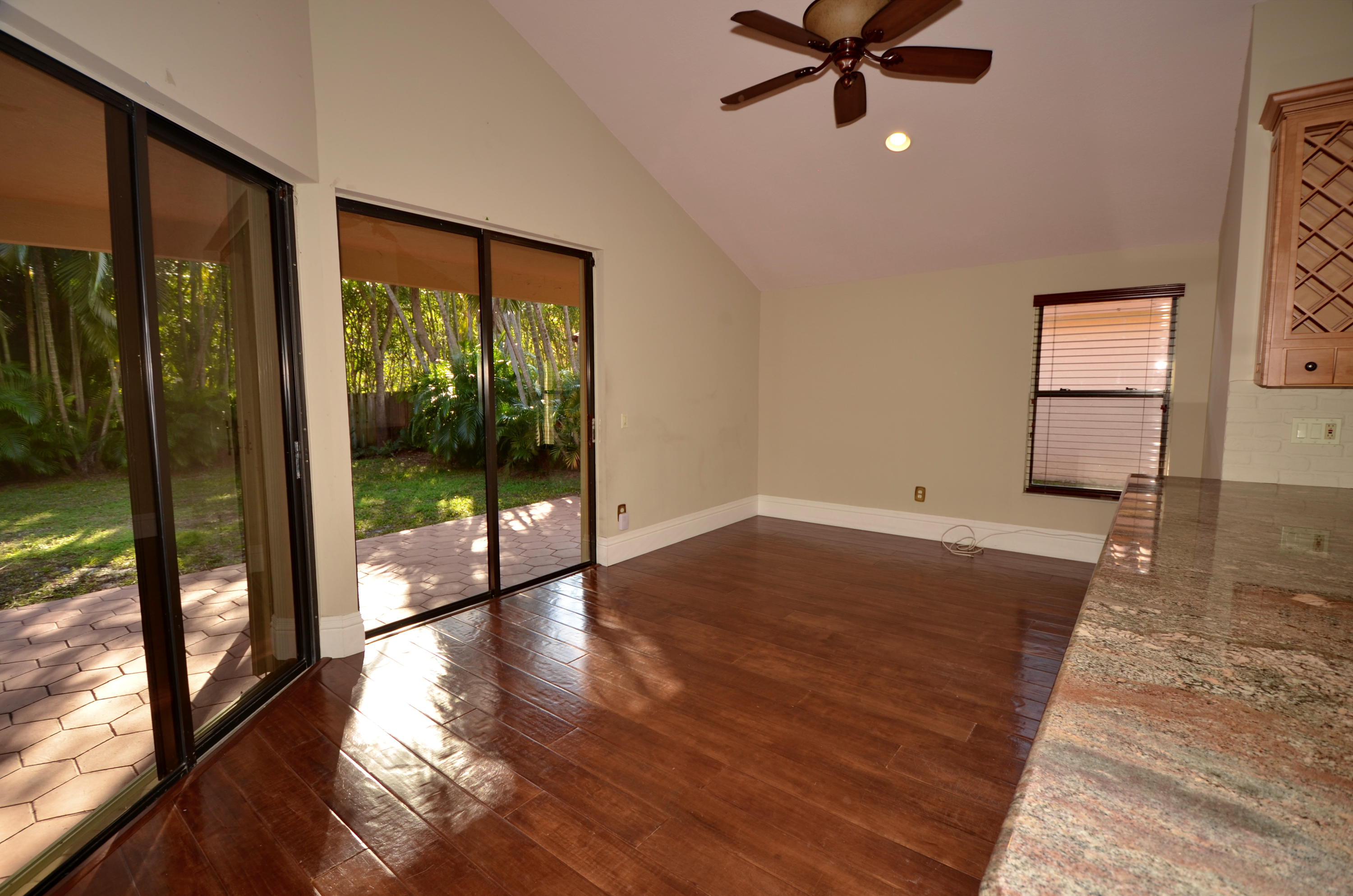 Beautiful updated one story home in much desired gated community. Soaring 16' volume ceilings & clerestory windows bring an abundance of natural light into the home. Updated granite kitchen w/stainless appliances plus butlers pantry w/granite top & tumble backsplash. Master suite offers walk in closet & sliders to patio. Master bath w/seamless glass shower & dual sink granite & wood vanity. Beautiful wrought iron/glass double door entry. Maple hardwood flooring in living area, crown moldings, 7'' baseboards, custom fans & lighting. Large backyard perfect for outdoor living & entertaining. Newer garage door. LaJoya offers community pool, tennis, basketball & clubhouse. Walk to shops, restaurants, gym, Howards Market and more. Close to beaches, I95 & turnpike. Great schools.