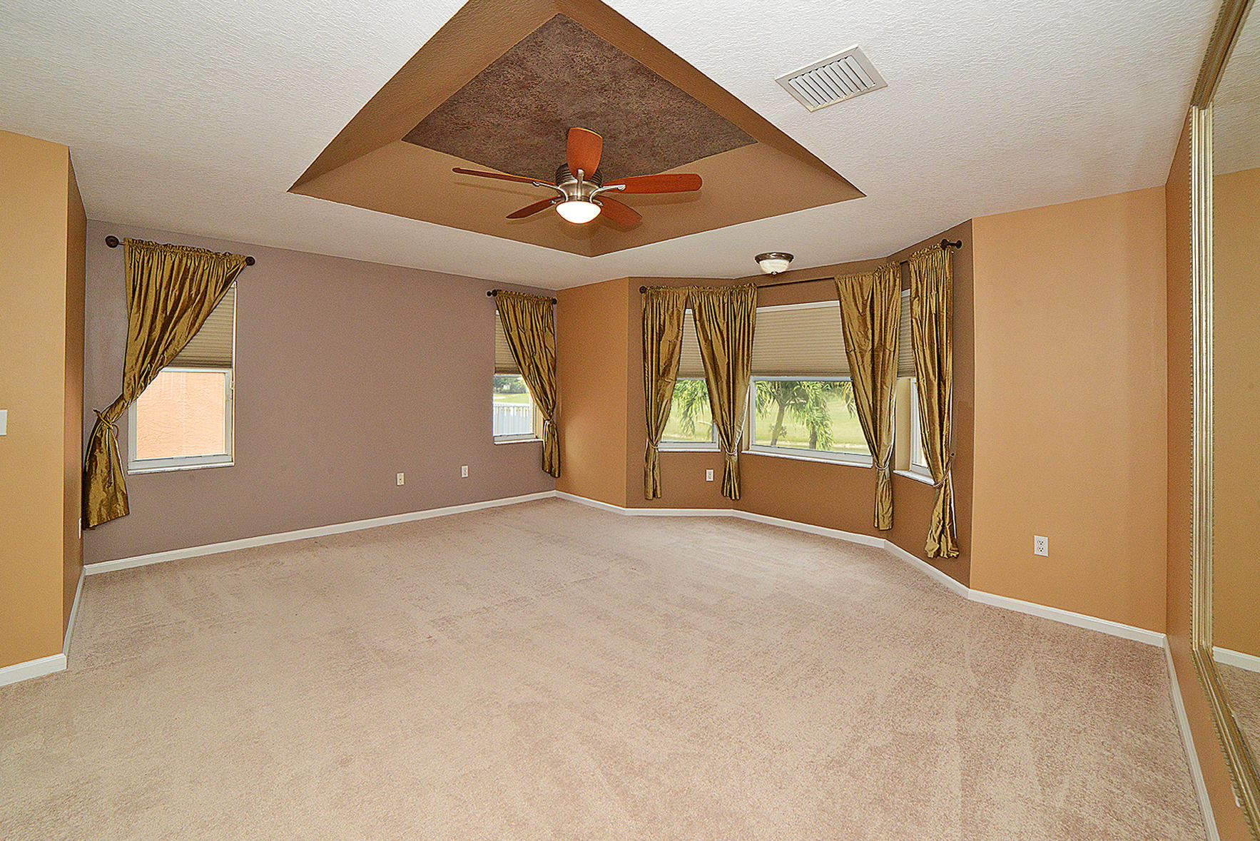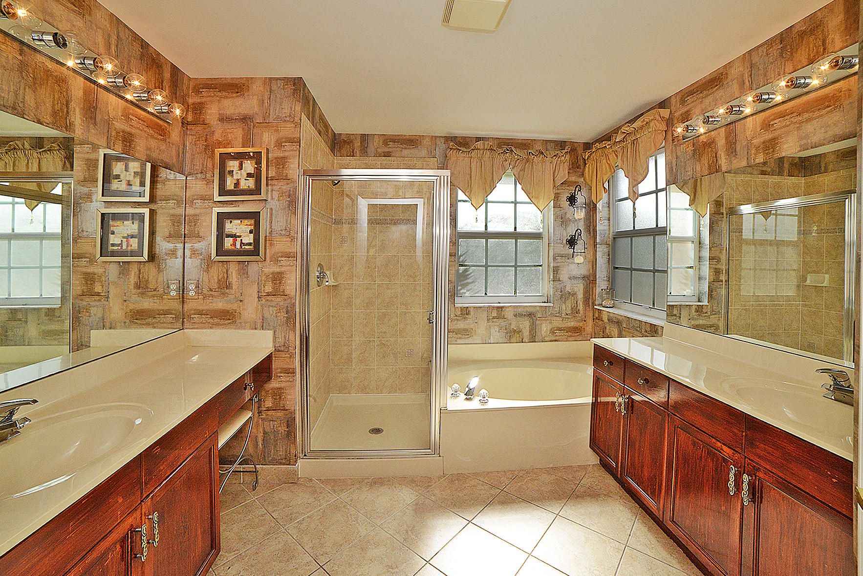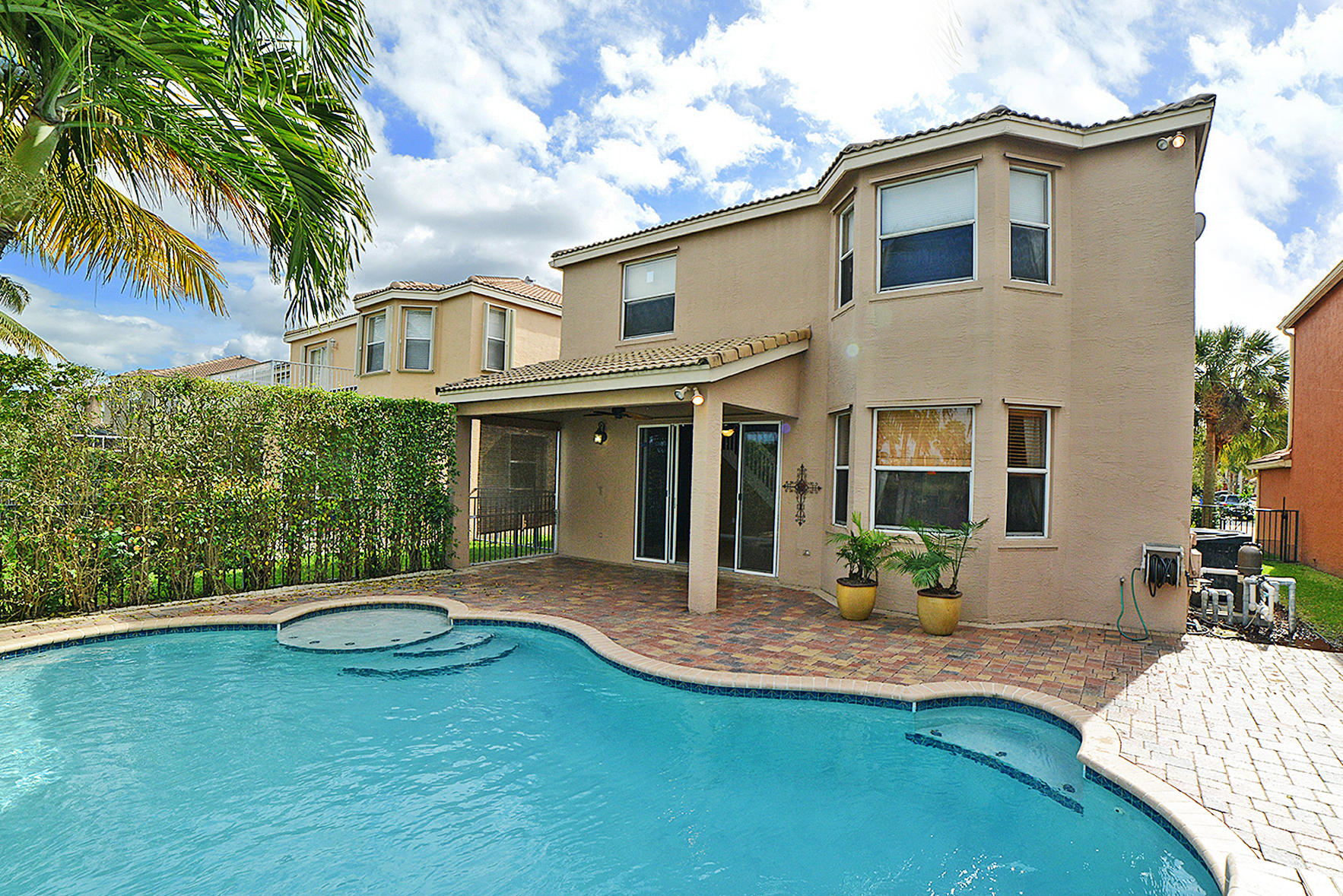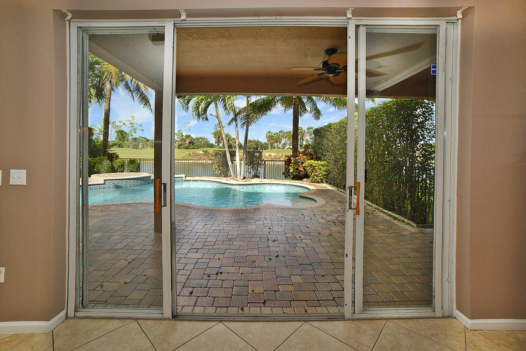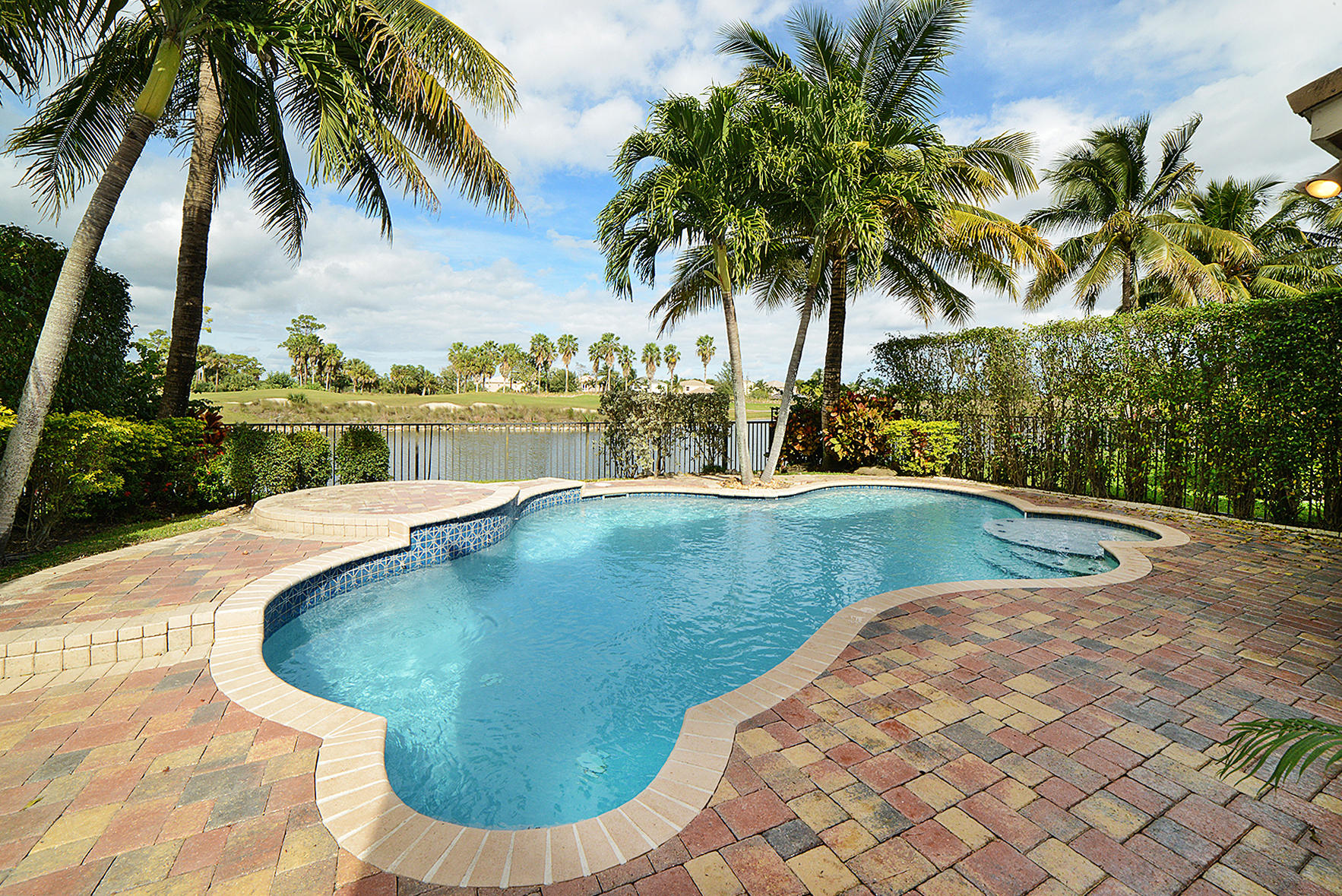 MAGNIFICENT! Stunning pool home with lake & golf course views! Eye catching curb appeal including lush landscaping & 2 car garage welcome you inside where the views of the pool, lake, & golf course take your breath away! The high end upgrades including luxurious crown molding & neutral tile continue throughout. Beyond the elegant formal living & dining rooms is a chef's dream kitchen featuring granite counters & backsplash, stainless steel appliances including a brand NEW wall oven, built-in pantry, barstool seating, & breakfast area overlooking your own private paradise. The kitchen is open to the family room which has a built-in wall unit & surround sound speakers. Sliders lead out to a tropical oasis. The covered patio is perfect for BBQs & outdoor entertaining. Relax by the saltwater