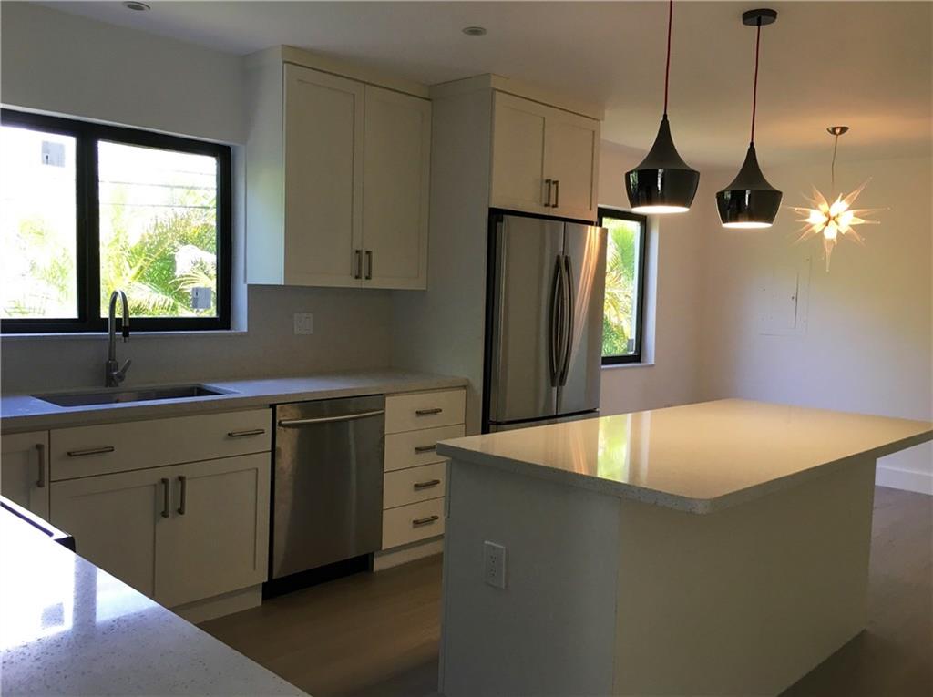 TOTALLY REDONE. Spacious contemporary home in most sought after part of Miami Shores, east of Biscayne Blvd. Open chef's kitchen, large island, stainless steel appliances, quartz counters; refinished hardwood floors, 3 large bedrooms, 2 1/2 new bathrooms. Bright open living plan features living/dining area, play room, large laundry. New impact windows and doors, HVAC, electric, plumbing, and septic system. Horizontal wood fence with lush landscaped garden & sprinkler system,