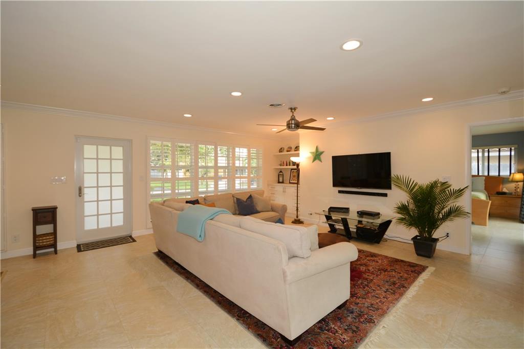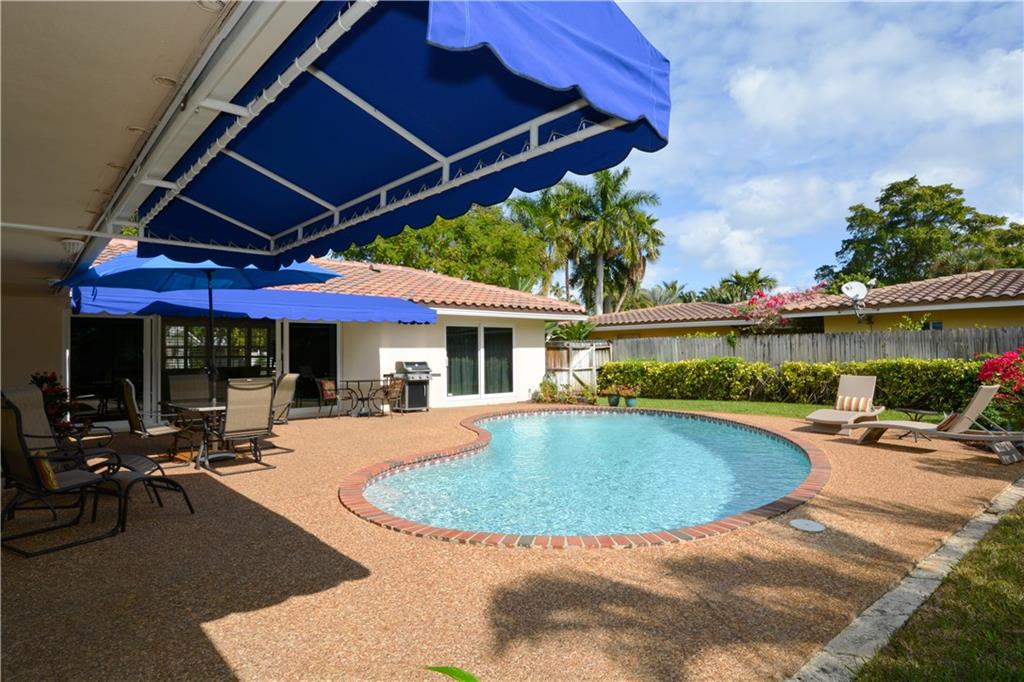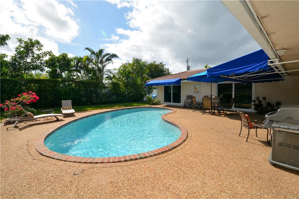 This home is located in the heart of Coral Ridge. It has been substantially updated throughout with new baths, new kitchen, new porcelain tile floors, new recessed lighting, new impact windows, new impact doors, plantation shutters and 1 year old roof. Large open floor plan, laundry room,large pool area with new awnings, completed fenced, 2 car garage with storage area and large side yard.