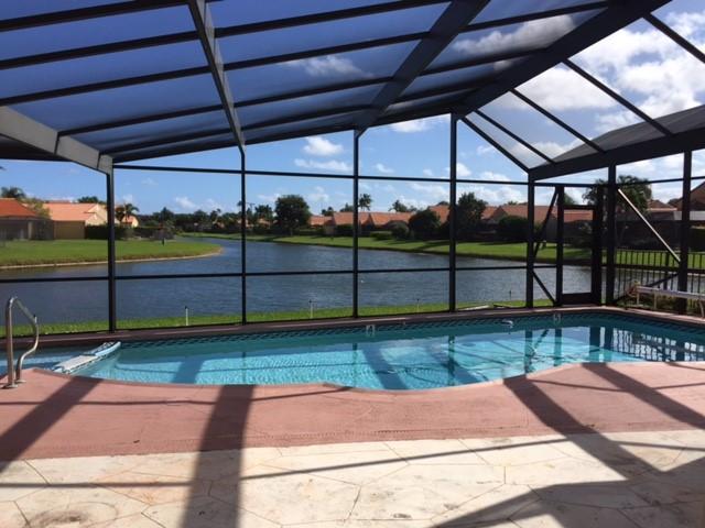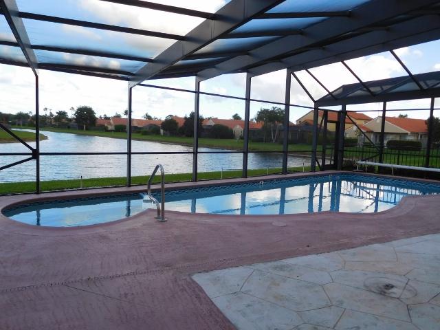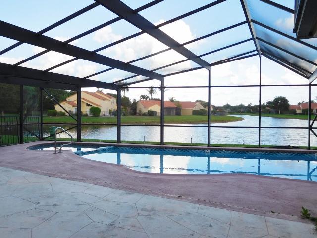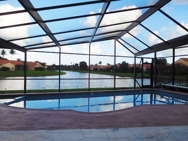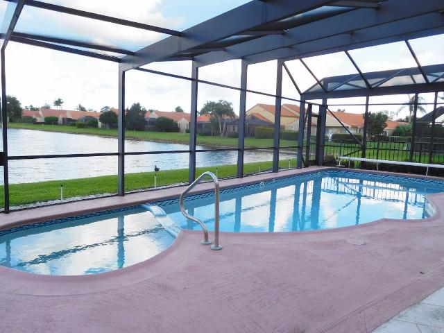 Exceptional premium Lake Front Lot! Enjoy center long lake views from this terrific 3BR/2BA Single Family Aspen model one story detached private pool home in a gated community, Brentwood Estates HOA. Interior features vaulted ceilings, ceramic tiles, laminate floors, open floor plan with separate master bedroom suite. Screened-in covered concrete patio with in-ground heated pool and built-in spa. Large 2 car garage with automatic door opener. Brentwood of Boca offers 24Hr Gated security, remodeled clubhouse with fitness, social and conference rooms. 2 community pools, hot tub, tennis/basketball courts. Bike/Jogging path. Hotwire HDTV high speed TV/Internet. Houses & driveways painted every 7 yrs. Lawn care and tree hedging. Located close to FL's Turnpike, shopping, schools and restaurant.