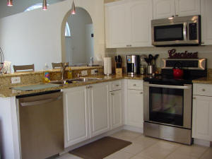 Light, bright & open, this charming one-story home with a partial lake view of 3 bedrooms & 2 baths features volume ceilings; white tile floors & newer neutral carpet; an open kitchen with white cabinetry, granite countertops, stainless steel appliances & built-in table with granite; remodeled Master & secondary bathrooms -- tile floors, vanities, counters; walk-in closet in the Master Suite; newly painted interior & exterior walls; extra high-hat lighting; vertical blinds; newer air conditioning heating element; lovely landscape design, new hurricane glass sliding doors, new alarm system & a private screened patio with a newly resurfaced heated pool overlooking the lake.