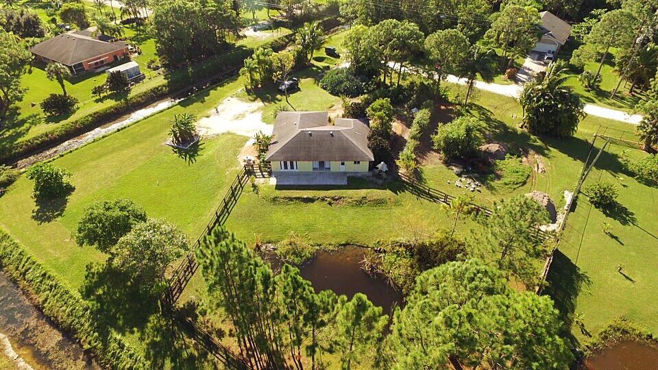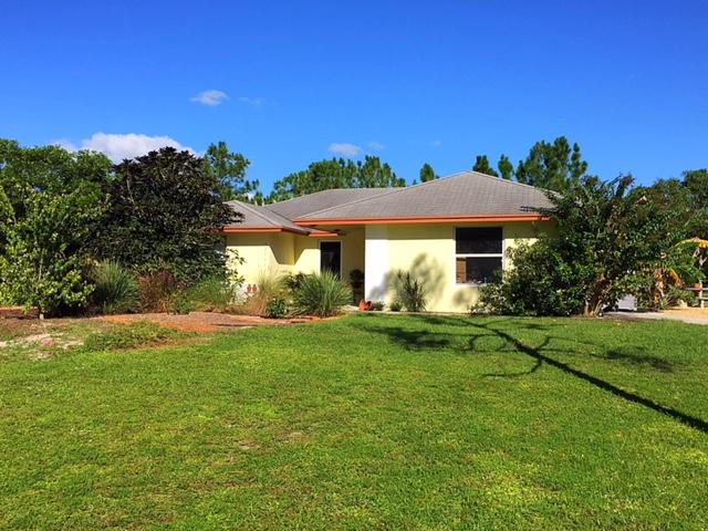 Quaint and cozy home located at the dead end of a private road sits on 1.5 acres. Spacious master bedroom includes walk in closet that measure 13x5. En suite master bath features roman tub and walk in shower. House has natural light due to the open air living room and kitchen that includes new stainless appliances. 3 bedrooms total with a garage that is under air. Can be used for an office or extra bedroom if you desire. Lush garden has a florida native mahogany, red maple tree's, as well as mango and banana trees. Property accented by pond stocked with bass and turtles as well as bordered by canal on 2 sides. Home is built with concrete block and features hurricane windows.