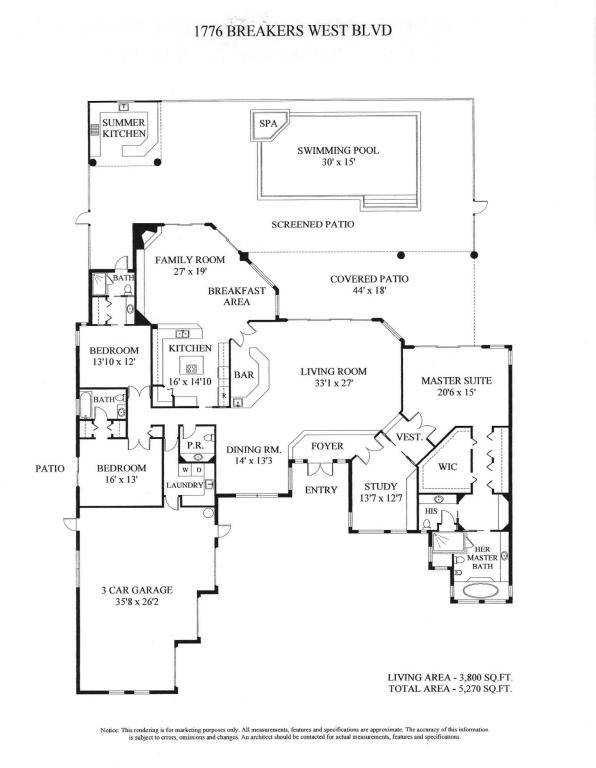 Fabulous opportunity to purchase a Breakers West custom home with great style and priced right! Spacious 3BR+Office/library w/high ceilings & beautiful views along Breakers Rees Jones golf course. Kitchen has crisp white cabinets, stainless steel appl & new saturnia marble flooring . Lg Fam Room w/ floor-to-ceiling windows makes the perfect backdrop for the coquina stack-stone fireplace. Master Suite has 4 closets, His and Her Marble Baths. New white shaker cabinets & marble counters. Handsome floor-to-ceiling paneled library w/built-in bookcases. Split floor provides privacy for 2 spacious Guest Bedrooms each w/private baths. Tremendous screened patio with 16x32 pool/spa and roofed summer kitchen/bar. New s-tile roof 2015. Great layout+Motivated Seller= Buyer's Opportunity!