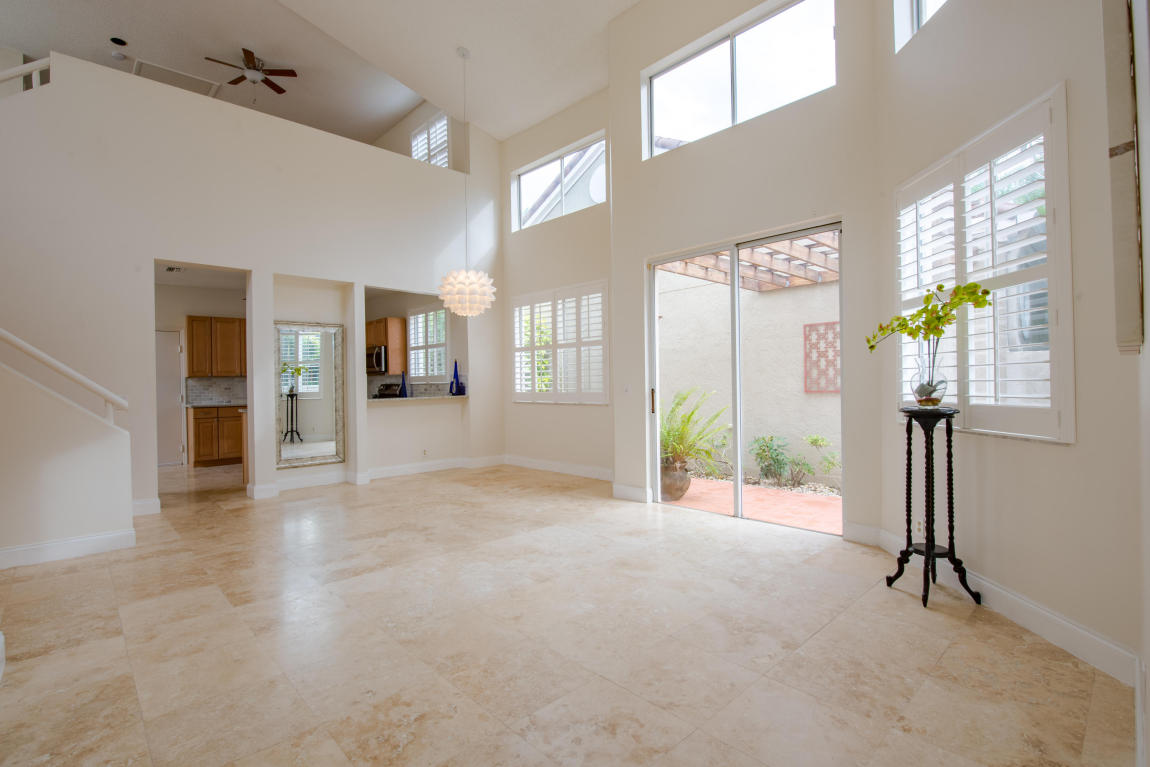 Pristine East Boca renovated home in gated country club with NO MANDATORY MEMBERSHIP!This spacious light-filled 2 bedroom with Loft/ 2.5 bath has an elegant private master suite on the main level with an generous walk in closet. Experience 20 ft plus soaring ceilings in the sun-filled, open living room featuring travertine marble flooring. European style kitchen with rich cabinetry, sleek granite perfect for entertaining family and friends. Through the sliding glass doors, step out onto your own retreat, private patio & fenced lawn to enjoy inviting sunrises and coastal breezes. Open breezy loft with private upstairs bedroom & bath. Huge 2 car garage with storage area. Highly rated schools and close to everything that Boca and Del Rey beach have to offer!!!