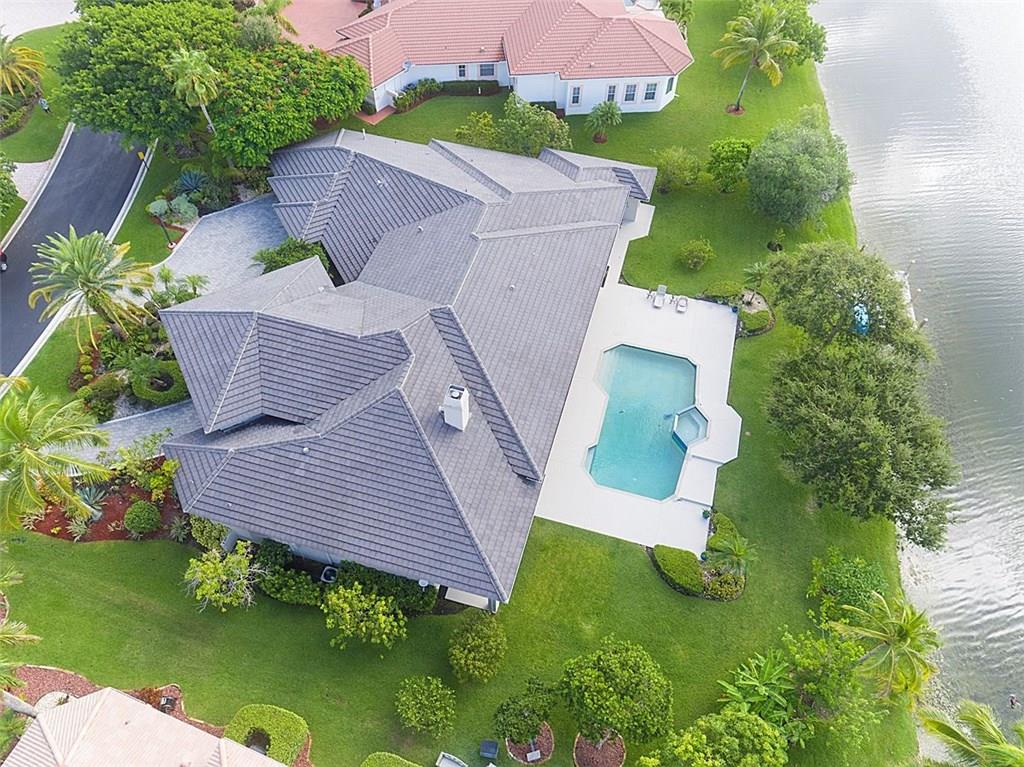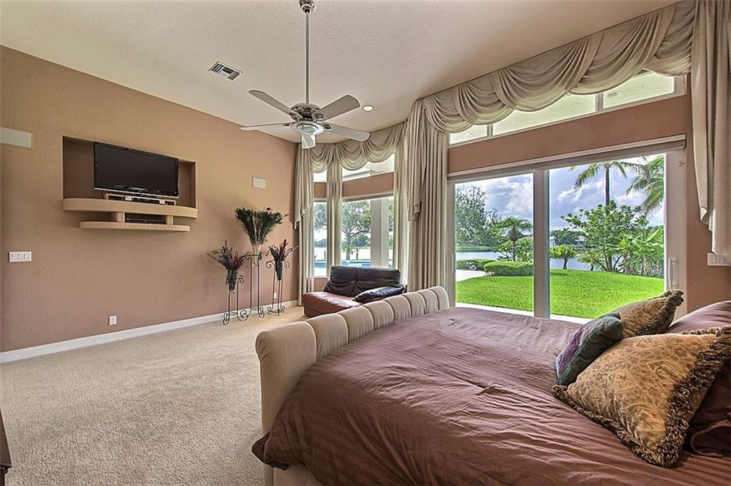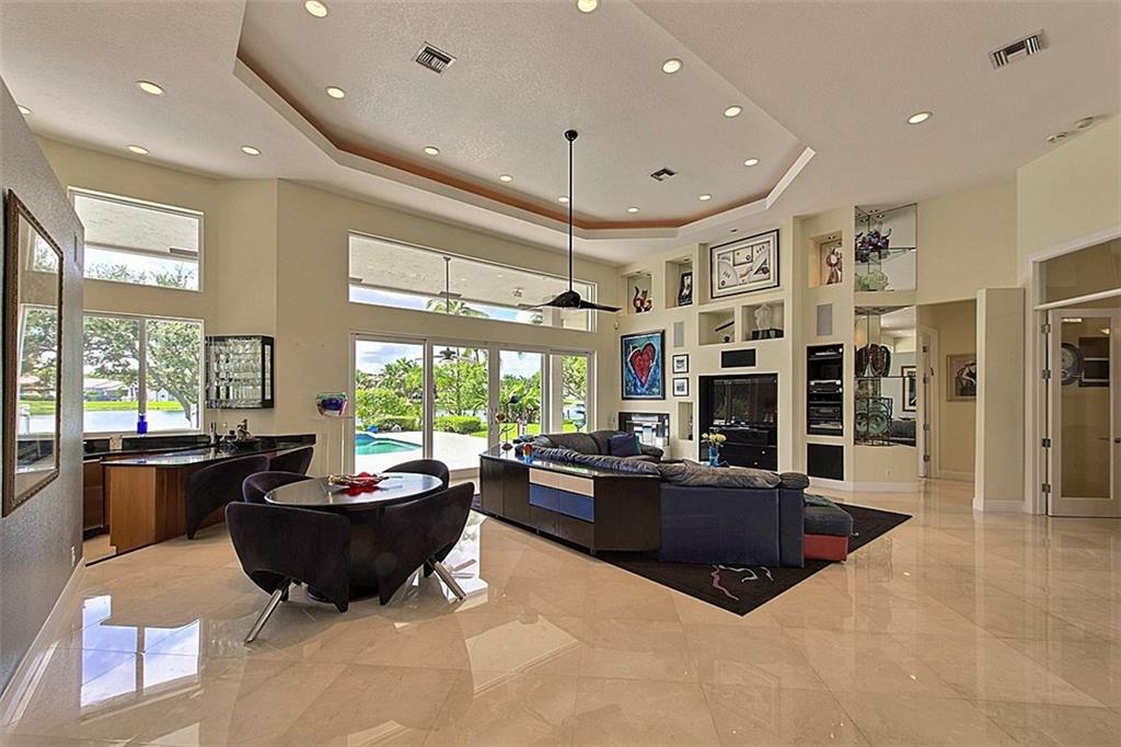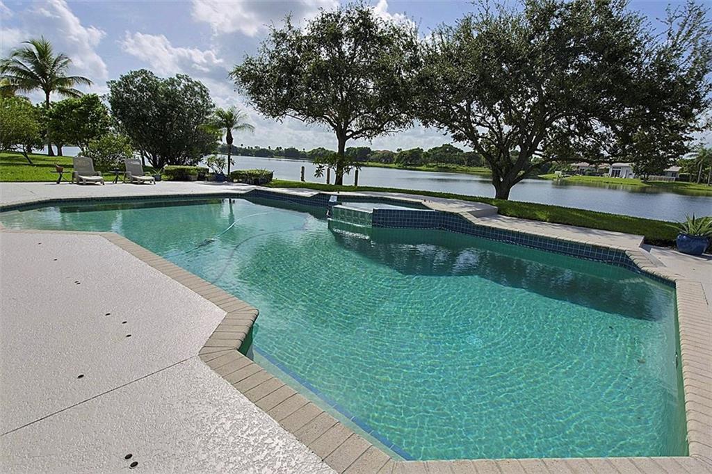 Spectacular lakefront home with dock, a rare find! Unobstructed sweeping views of 125 acre navigable lake. Aprx half acre lot with 100ft on water. 6 BRs + maids room, office & computer room. Updated, upgraded from 24 inch marble to impact doors & windows + newer roof! State of the art custom kitchen incl. 6 burner gas cooktop, huge great room with entertainment bar, dining room & large breakfast rm. Enormous patio, 20x40 pool & outdoor kit. Circular drive with porte-cochere. Exclusive & 24 hr guard gated